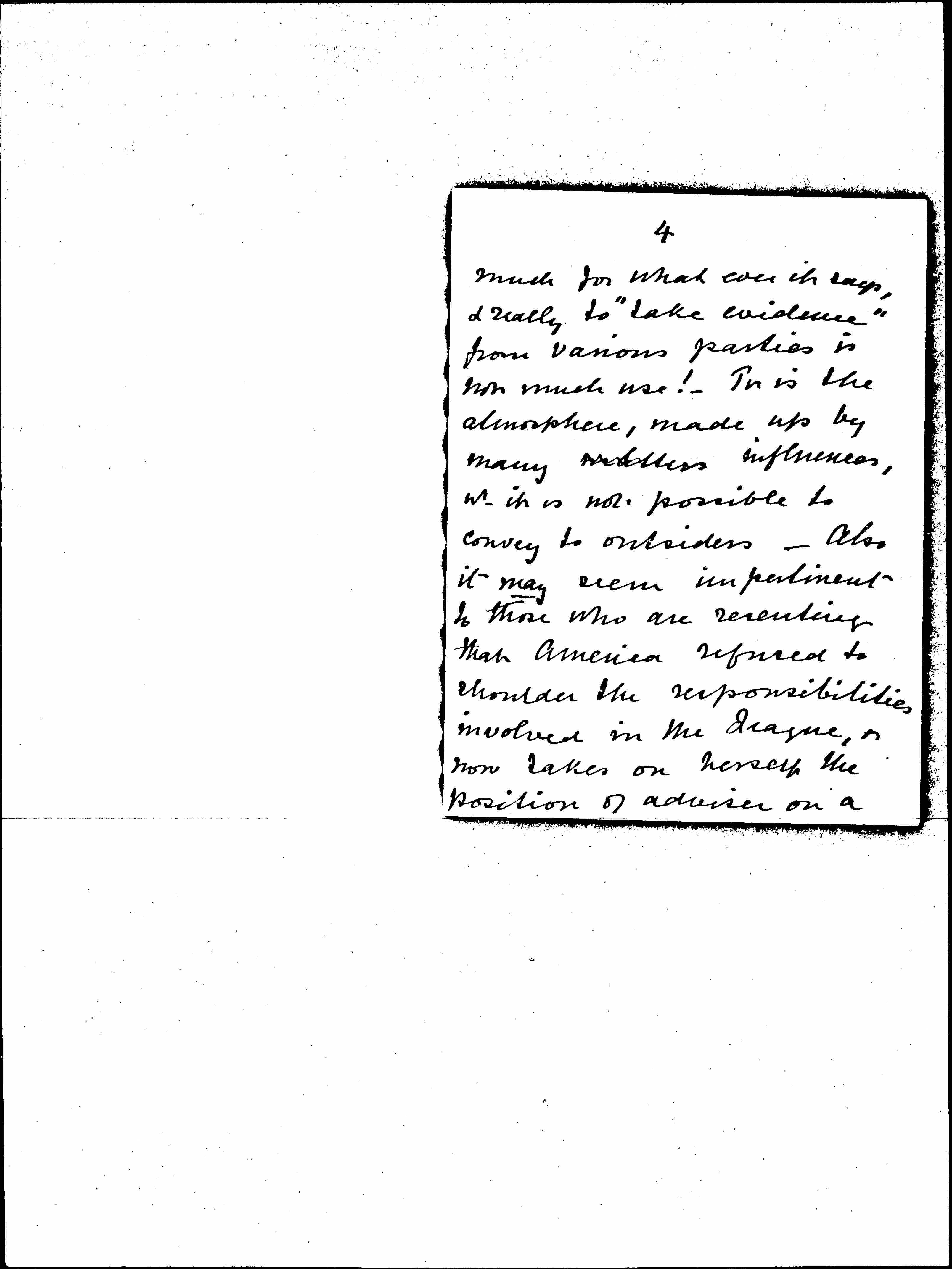 As to your Irish Commission I do not think England will care [page 4] much for what ever it says, & really to "take evidence" from various parties is not much use! [It] is the atmosphere, made up by many [illegible] influences, wh. it is not possible to convey to outsiders -- also it may seem impertinent to those who are resenting that America refused to shoulder the responsibilities involved in the League, & now takes on herself the position of advisor on a [page 5] matter of home politics on wh she cannot really judge. I won't dear, & there are others, who like me, welcome criticism, however severe, but they are rare, & I fear that the proposed Commission will alienate some kind policy now given, & ready to be given, to U.S.A.
