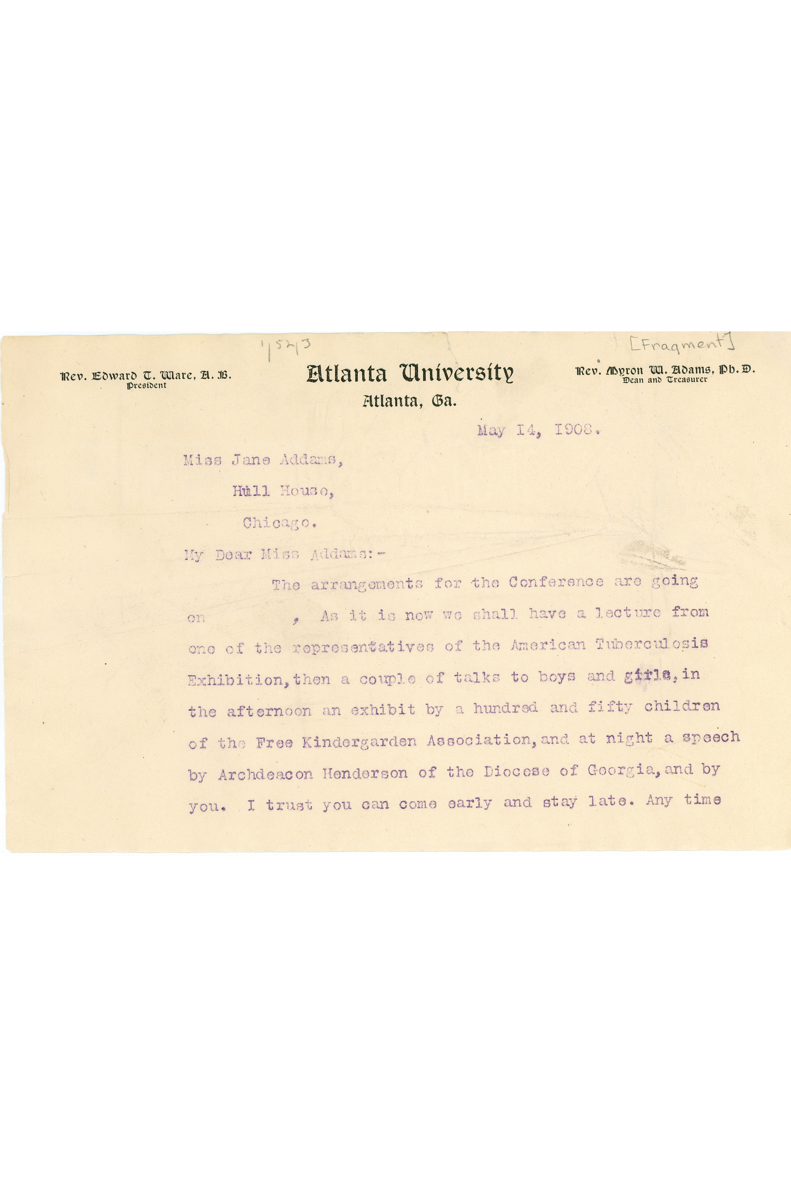 The arrangements for the Conference are going on [missing text]. As it is now we shall have a lecture from one of the representatives of the American Tuberculosis Exhibition, then a couple of talks to boys and girls, in the afternoon an exhibit by a hundred and fifty children of the Free [Kindergarten] Association, and at night a speech by Archdeacon Henderson of the Diocese of Georgia, and by you. I trust you can come early and stay late. Any time