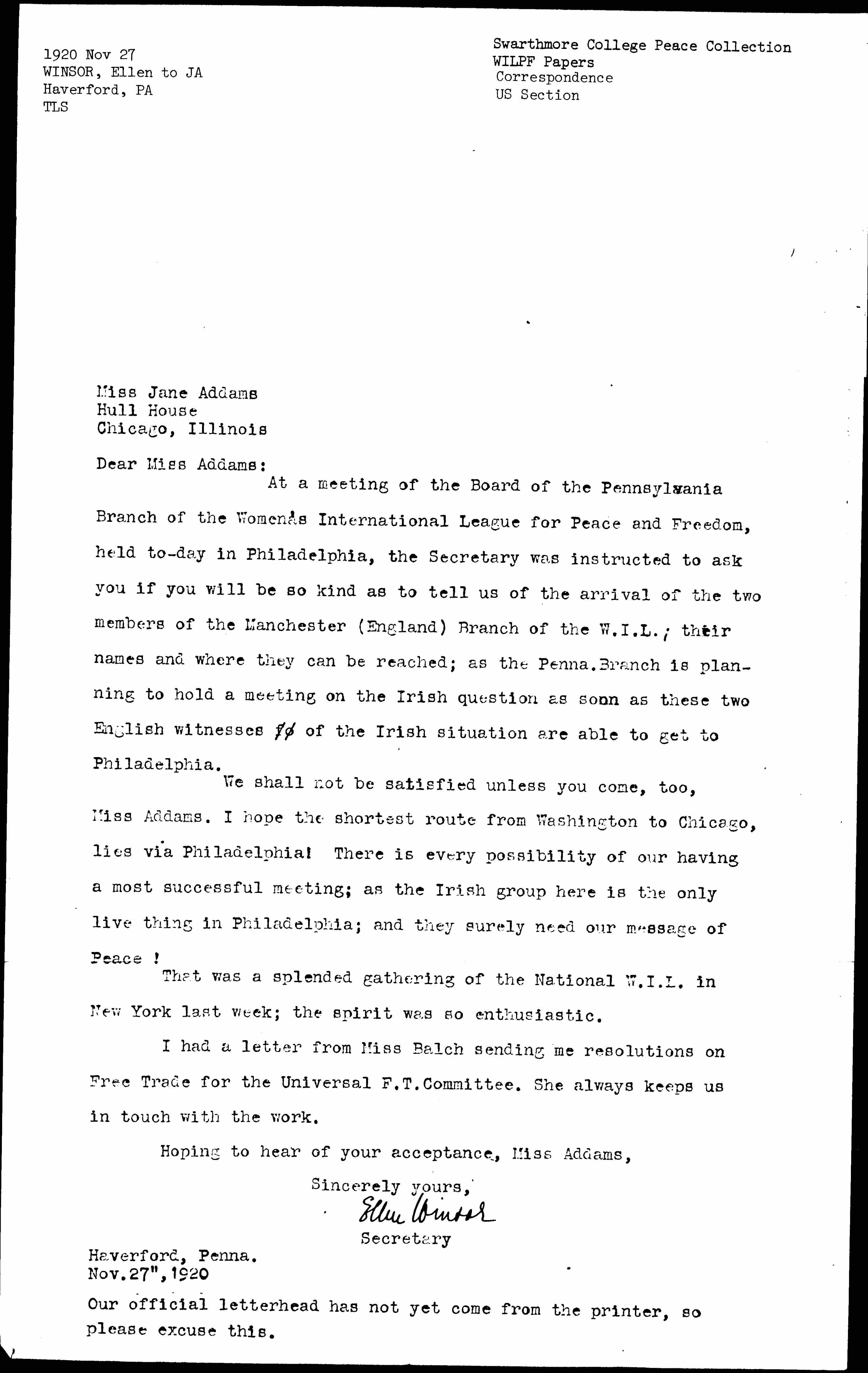At a meeting of the Board of the Pennsylvania Branch of the [Women's] International League for Peace and Freedom, held [today] in Philadelphia, the Secretary was instructed to ask you if you will be so kind as to tell us of the arrival of the two members of the Manchester (England) Branch of the W.I.L.; their names and where they can be reached; as the Penna. Branch is planning to hold a meeting on the Irish question as soon as these two English witnesses of the Irish situation are able to get to Philadelphia.
