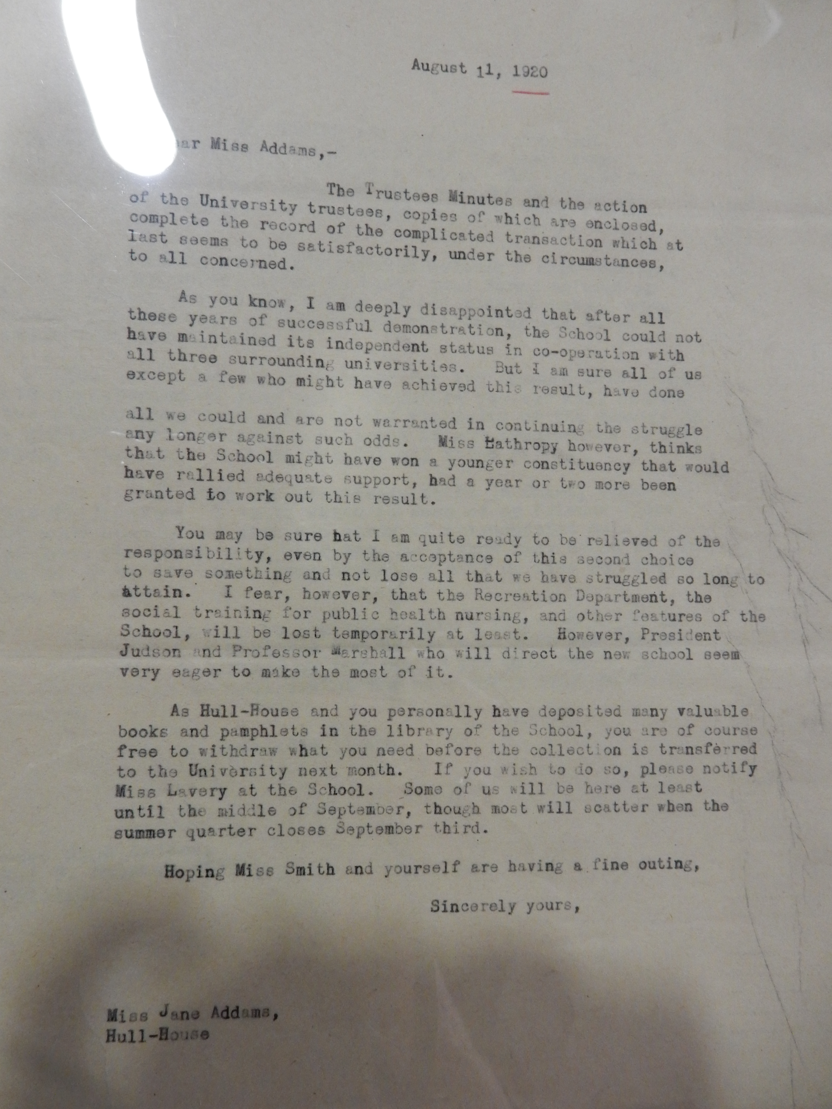 You may be sure that I am quite ready to be relieved of the responsibility, even by the acceptance of this second choice to save something and not lose all that we have struggled so long to attain. I fear, however, that the Recreation Department, the social training for public health nursing, and other features of the School, will be lost temporarily at least. However, President Judson and Professor Marshall who will direct the new school seem very eager to make the most of it.