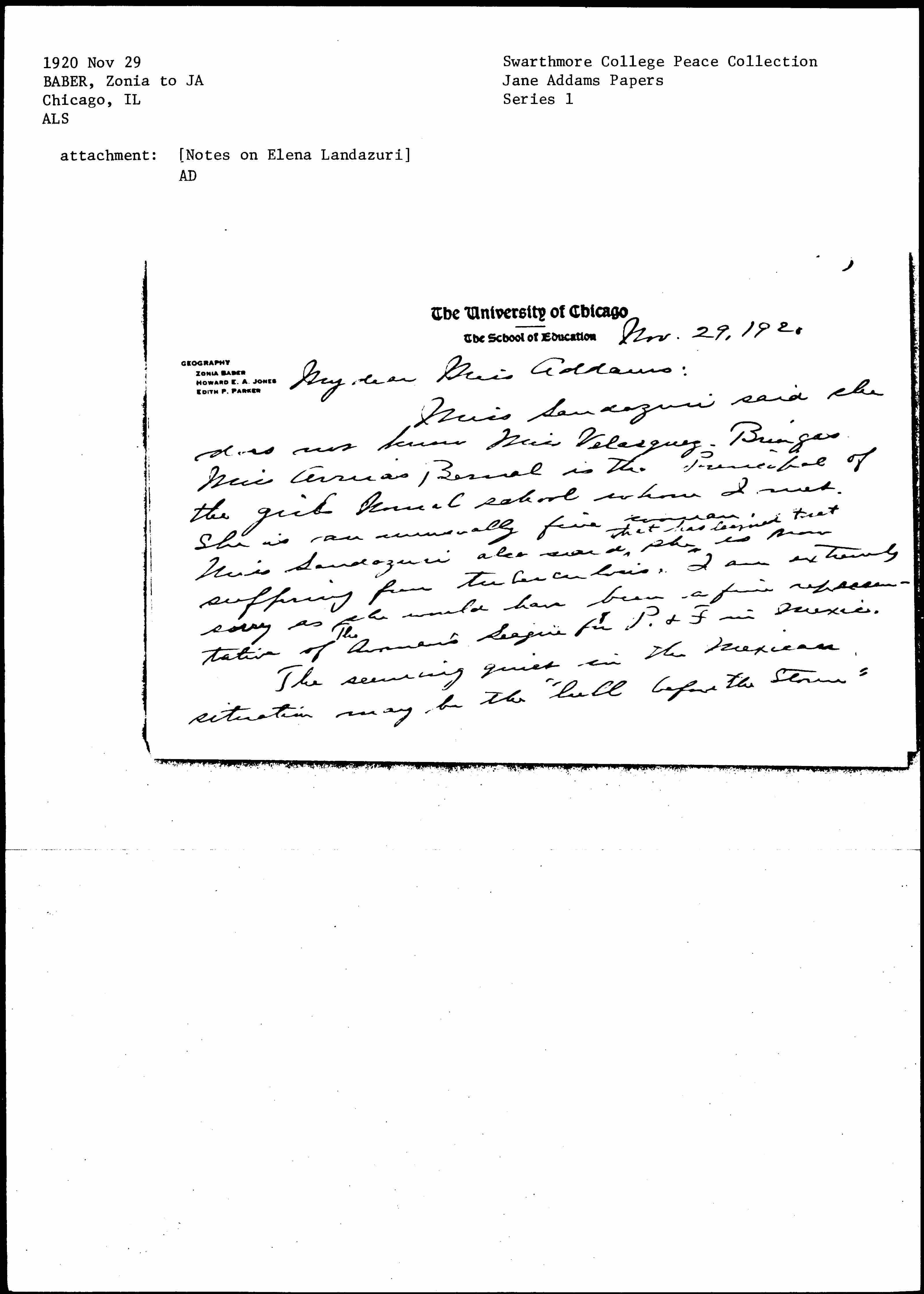 Miss Landazuri said she does not know Miss [Velázquez]-Bringas. Miss [Arias] Bernal is the Principal of the girl's normal school whom I met. She is an unusually fine woman. Miss Landazuri also said ↑that has learned that↓ she is now suffering from tuberculosis. I am extremely sorry as she would have been a fine representative of ↑The↓ Women's League for P. & F. in Mexico.
