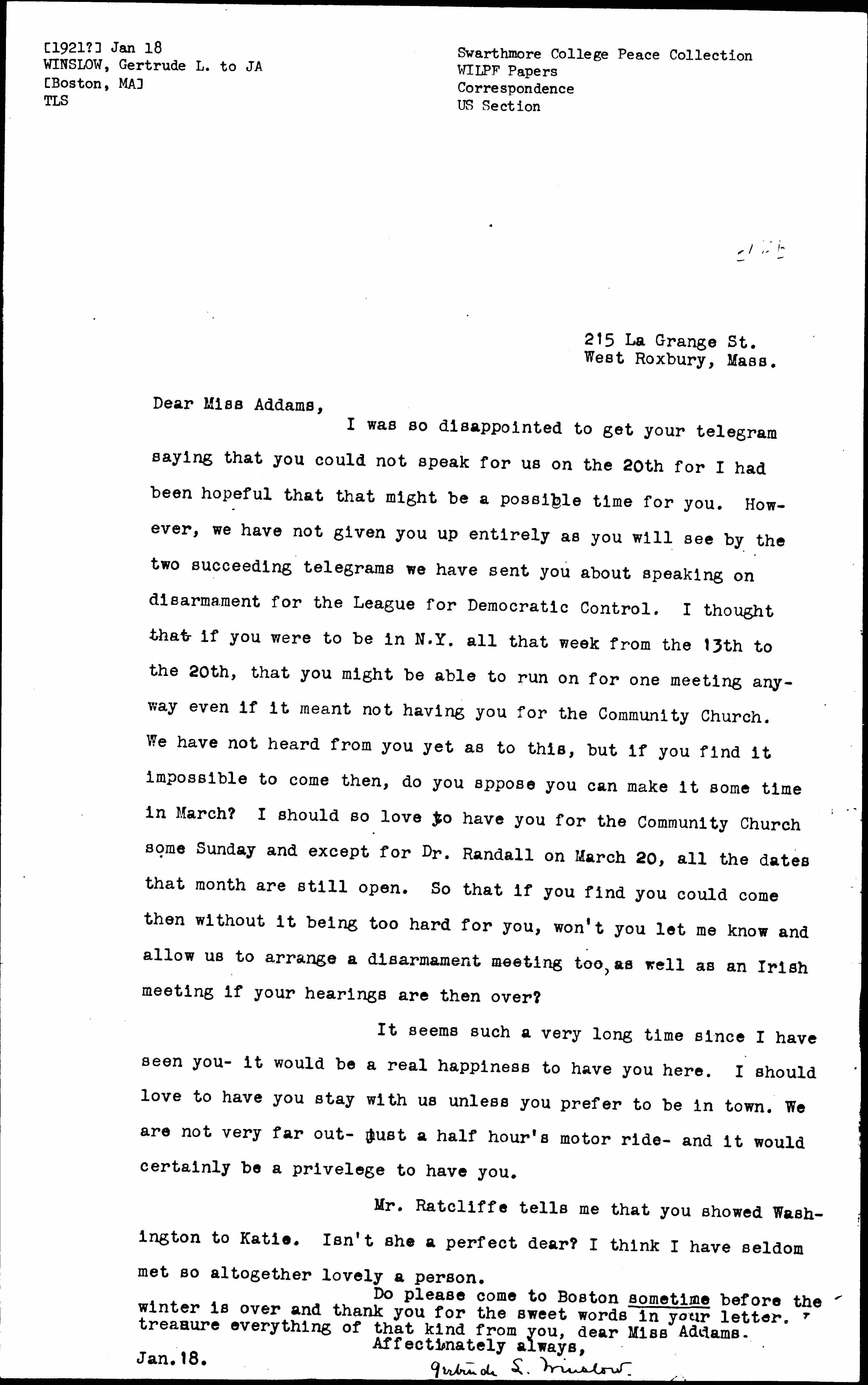 Do please come to Boston sometime before the winter is over and thank you for the sweet words in your letter. I treasure everything of that kind from you, dear Miss Addams.