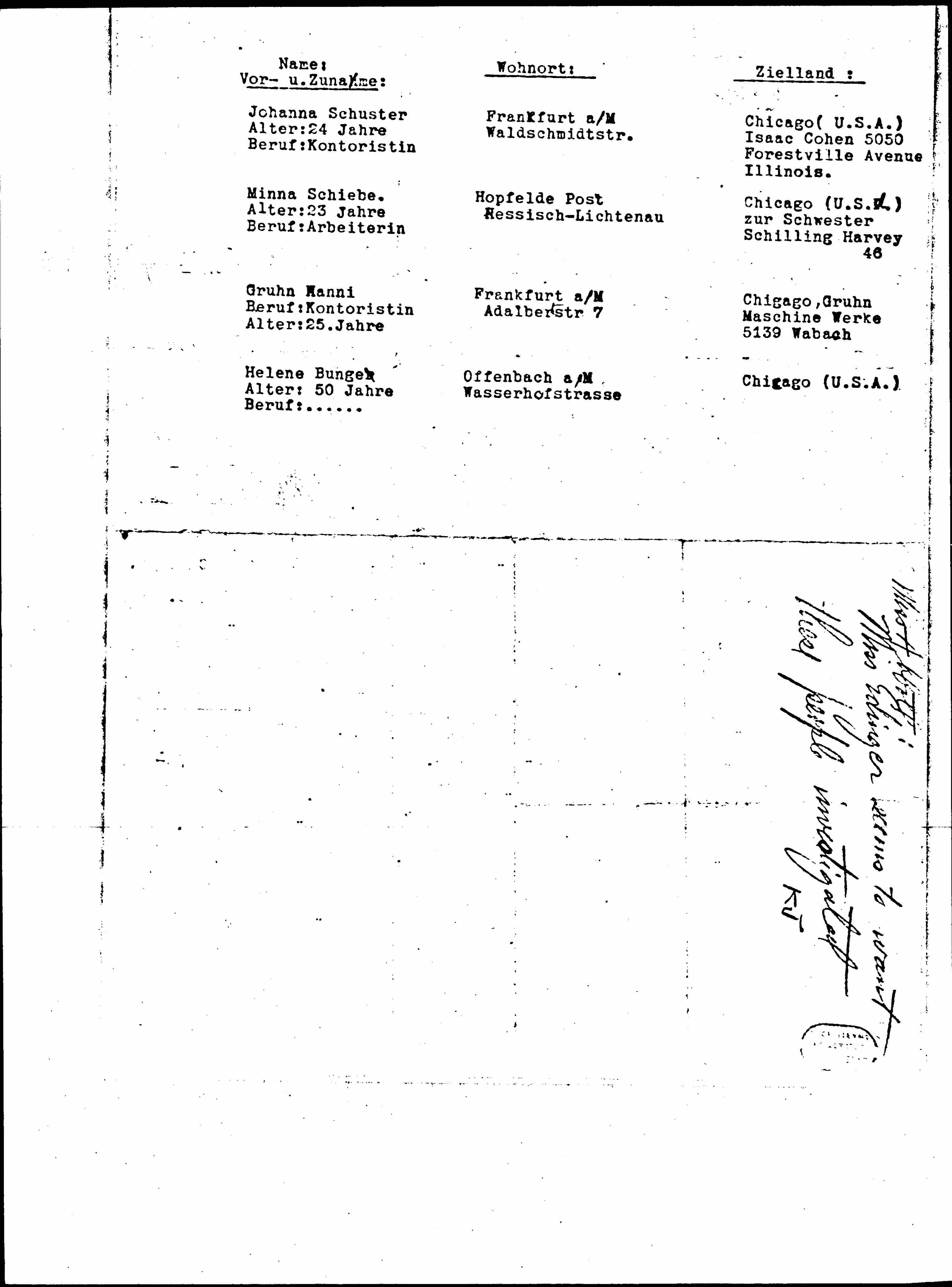 The Reich Immigration Office has sent me a list of emigrating women with the request to notify organizations from the concerned countries so that they could possibly take care of the women; 4 of them are in Chicago. I will comply with the instructions and tell you the names etc., however I do [not] [know] if the women will find enough guidance there. Perhaps one of your employees will drop by one or the other of your offices anyway or the settlement will [invite] you to some event. I do not want to cause you any [unnecessary] trouble over there; you can already see from the ↓[information?]↑zeigenam what the conditions are.
