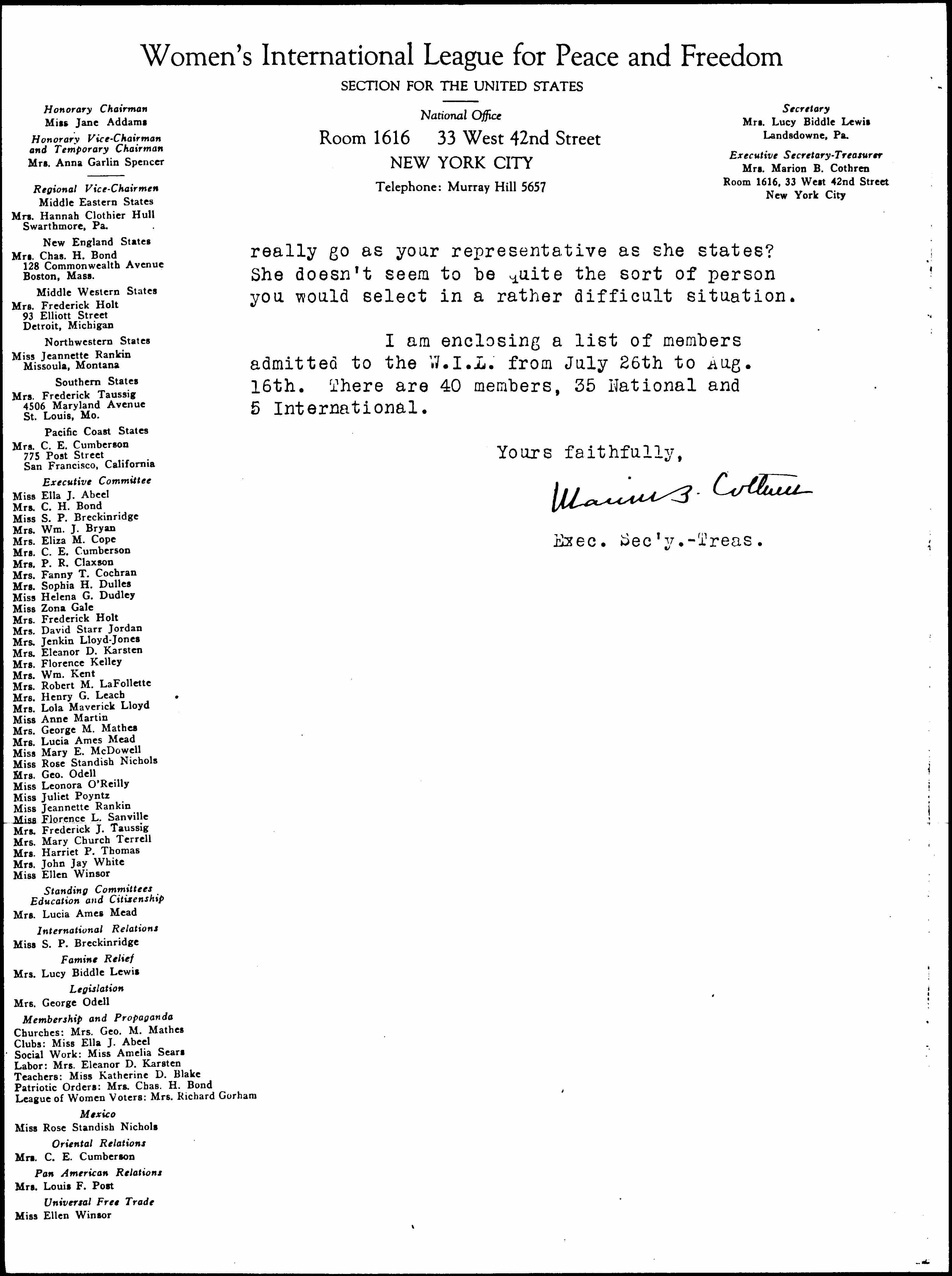 I am enclosing a list of members admitted to the W.I.L. from July 26th to Aug. 16th. There are 40 members, 35 National and 5 International.