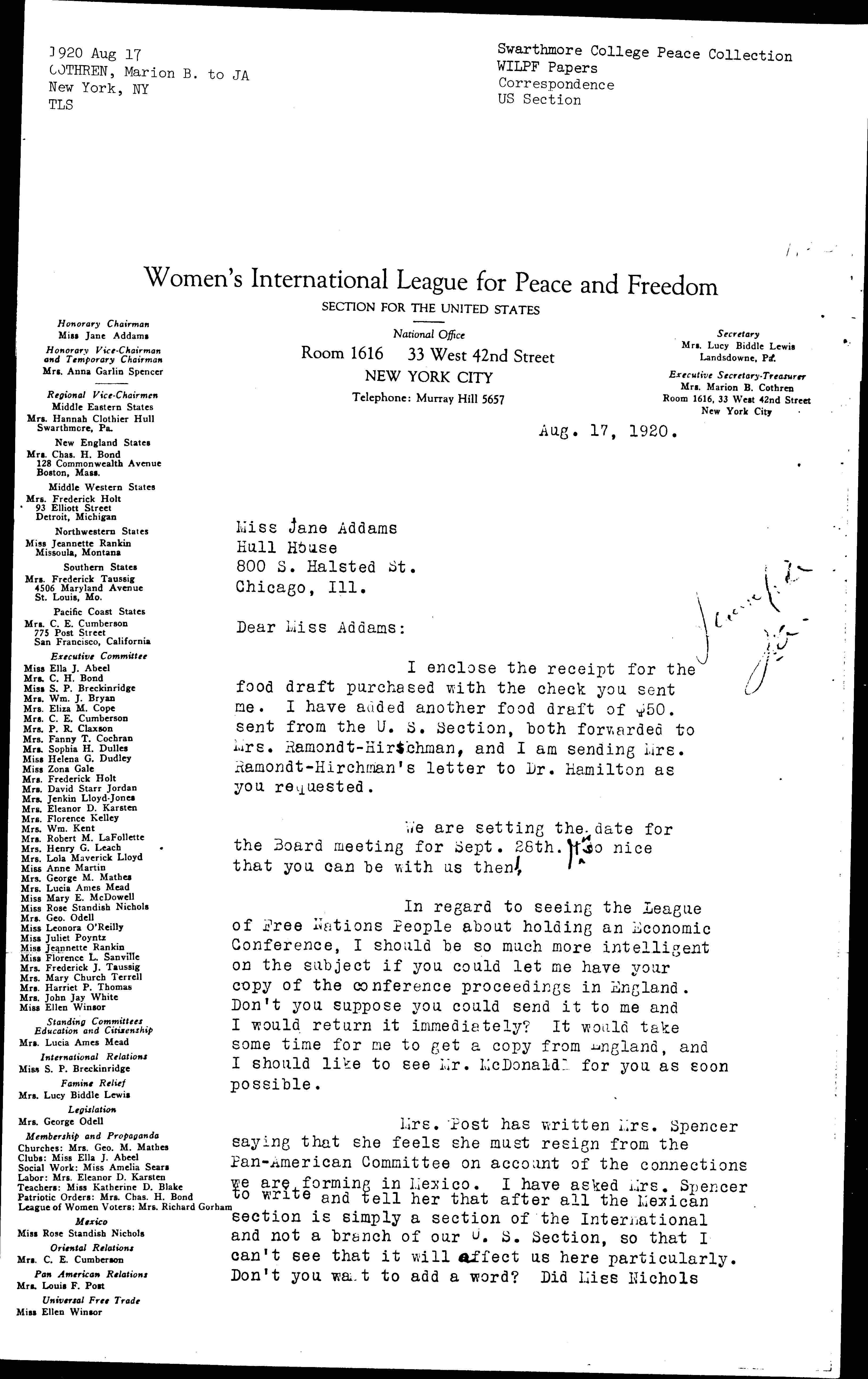 Mrs. Post has written Mrs. Spencer saying that she feels she must resign from the Pan-American Committee on account of the connections we are forming in Mexico. I have asked Mrs. Spencer to write and tell her that after all the Mexican section is simply a section of the International and not a branch of our U.S. Section, so that I can’t see that it will affect us here particularly. Don’t you want to add a word? Did Miss Nichols [page 2] really go as your representative as she states? She doesn’t seem to be quite the sort of person you would select in a rather difficult situation.