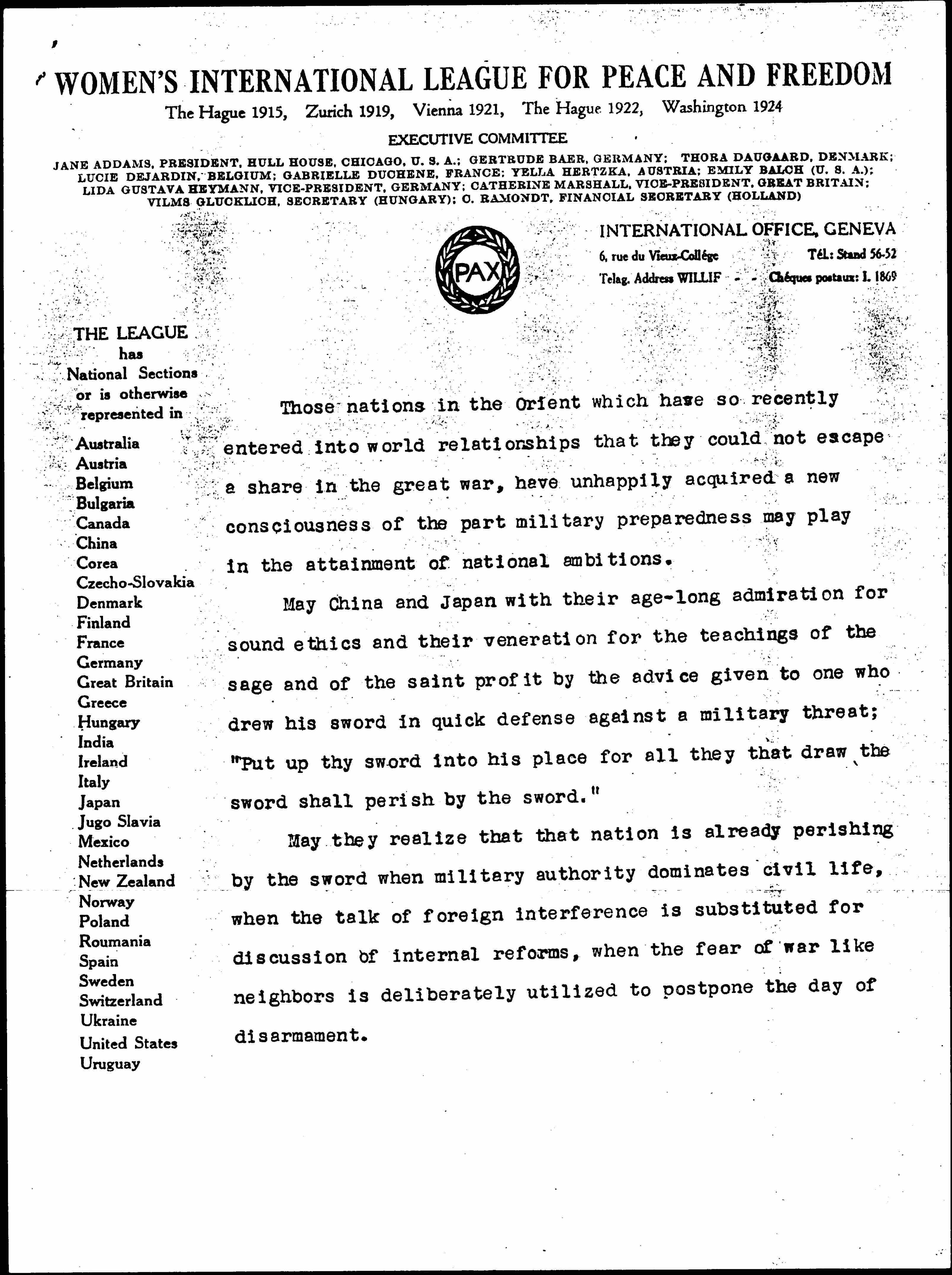 May they realize that that nation is already perishing by the sword when military authority dominates civil life, when the talk of foreign interference is substituted for discussion of internal reforms, when the fear of [warlike] neighbors is deliberately utilized to postpone the day of disarmament. [page 5]