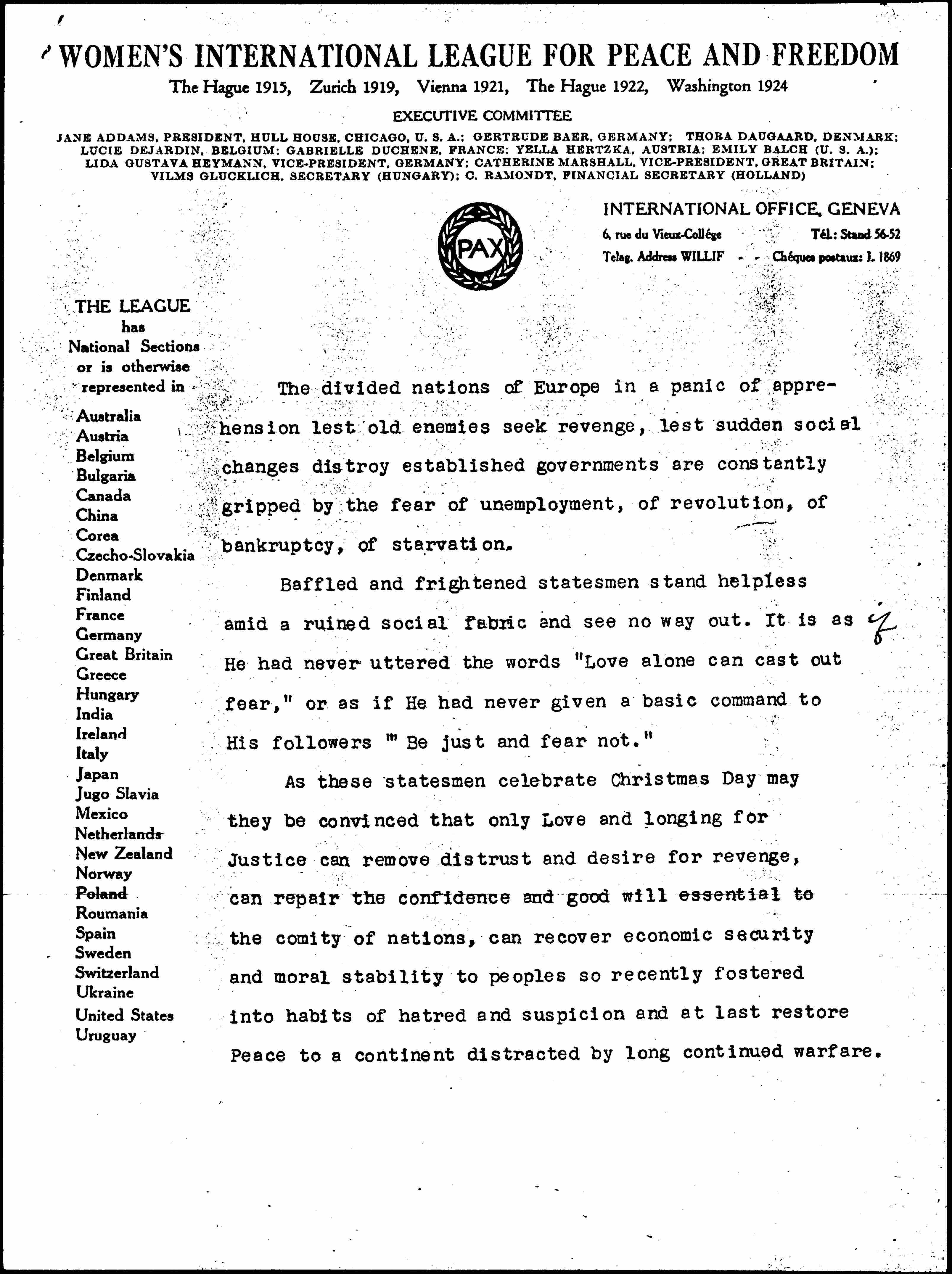 As these statesmen celebrate Christmas Day may they be convinced that only Love and longing for Justice can remove distrust and desire for revenge, can repair the confidence and good will essential to the comity of nations, can recover economic security and moral stability to peoples so recently fostered into habits of hatred and suspicion and at last restore Peace to a continent distracted by long continued warfare. [page 3]