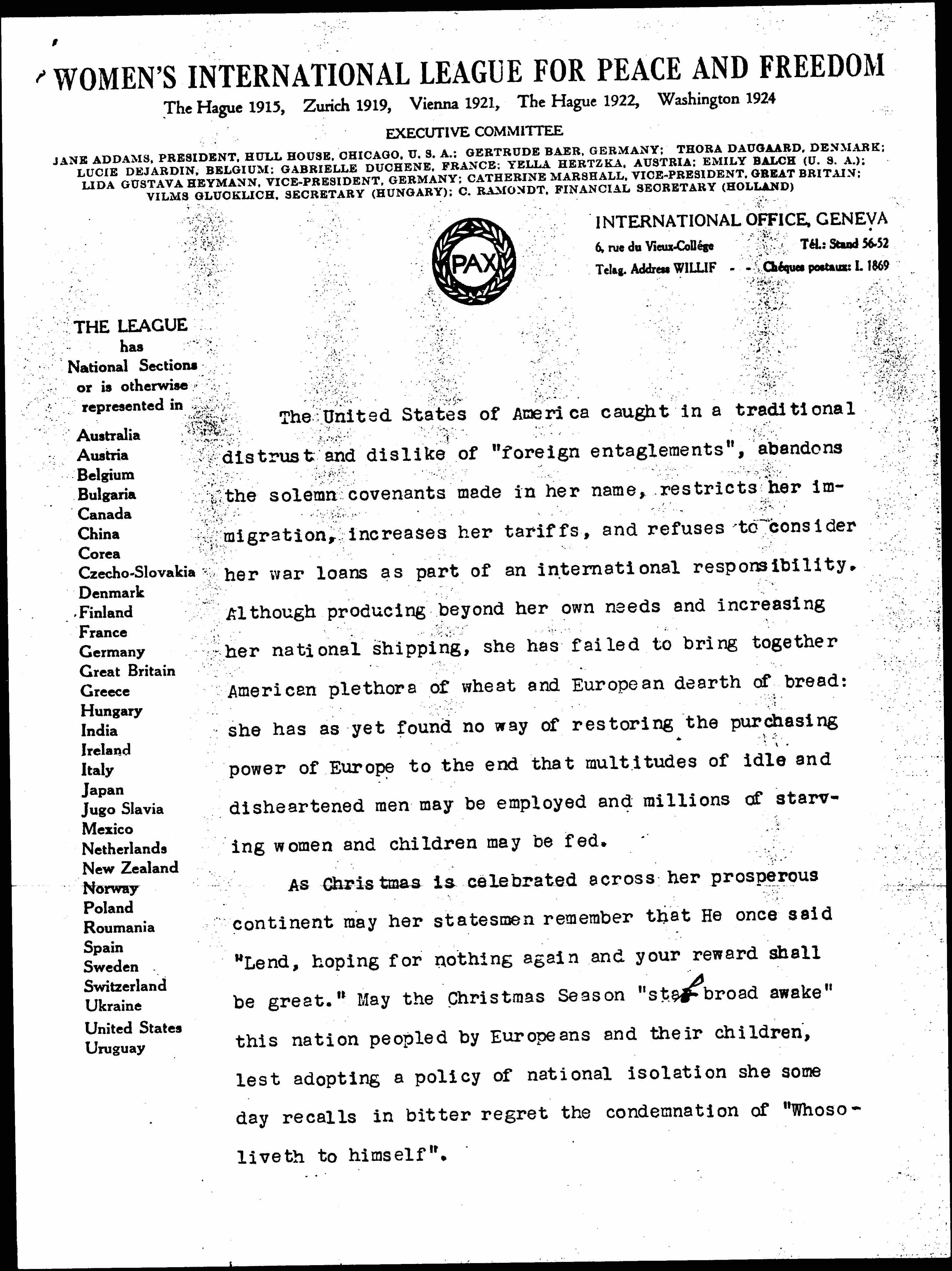 As Christmas is celebrated across her prosperous continent may her statesmen remember that He once said "Lend, hoping for nothing again and your reward shall be great." May the Christmas Season "↑stab ↓ broad awake" this nation peopled by Europeans and their children, lest adopting a policy of national isolation she [someday] recalls in bitter regret the condemnation of "Whosoliveth to himself". [page 4]