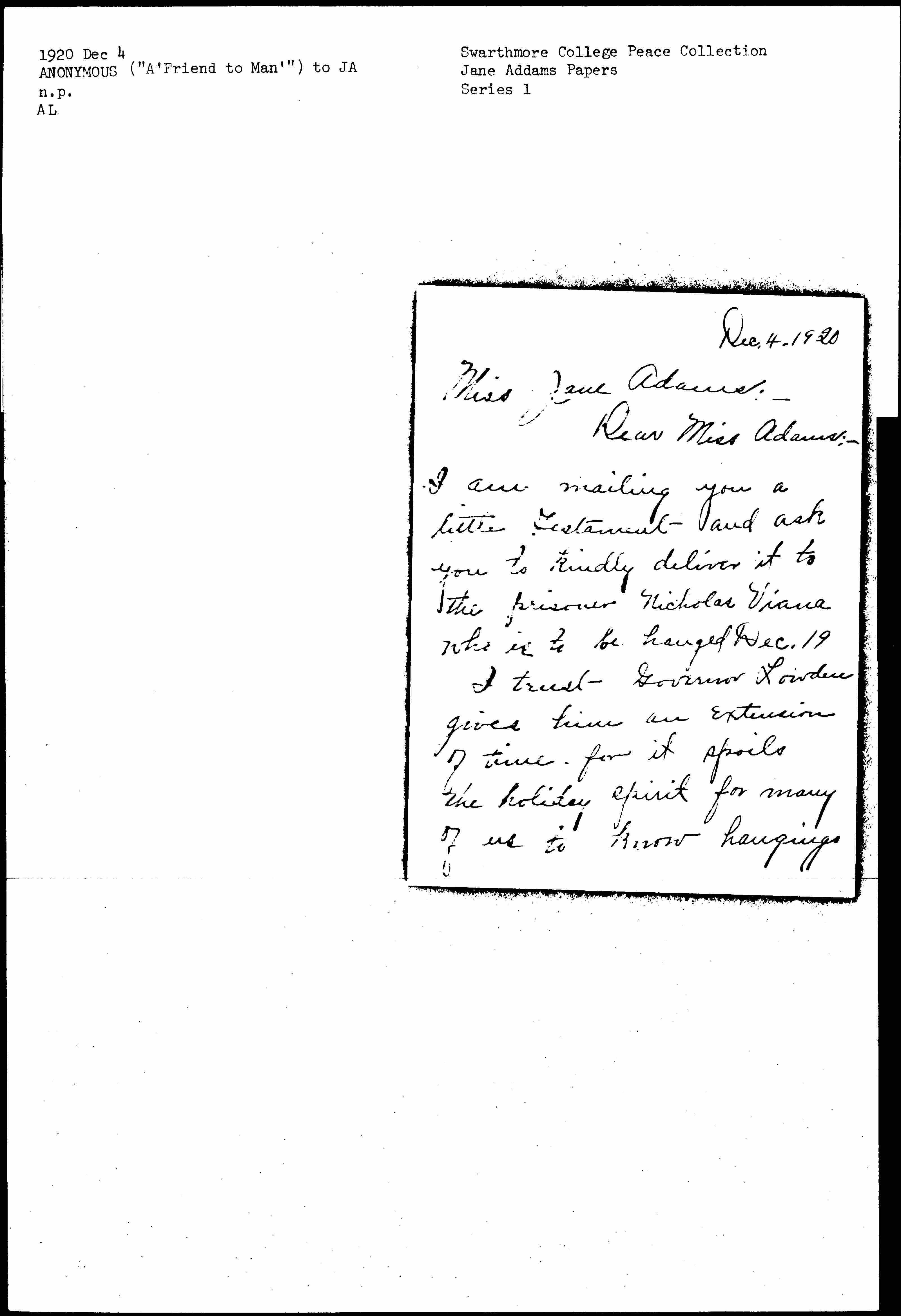 I am mailing you a little Testament and ask you to kindly deliver it to the prisoner Nicholas Viana who is to be hanged Dec. 19.