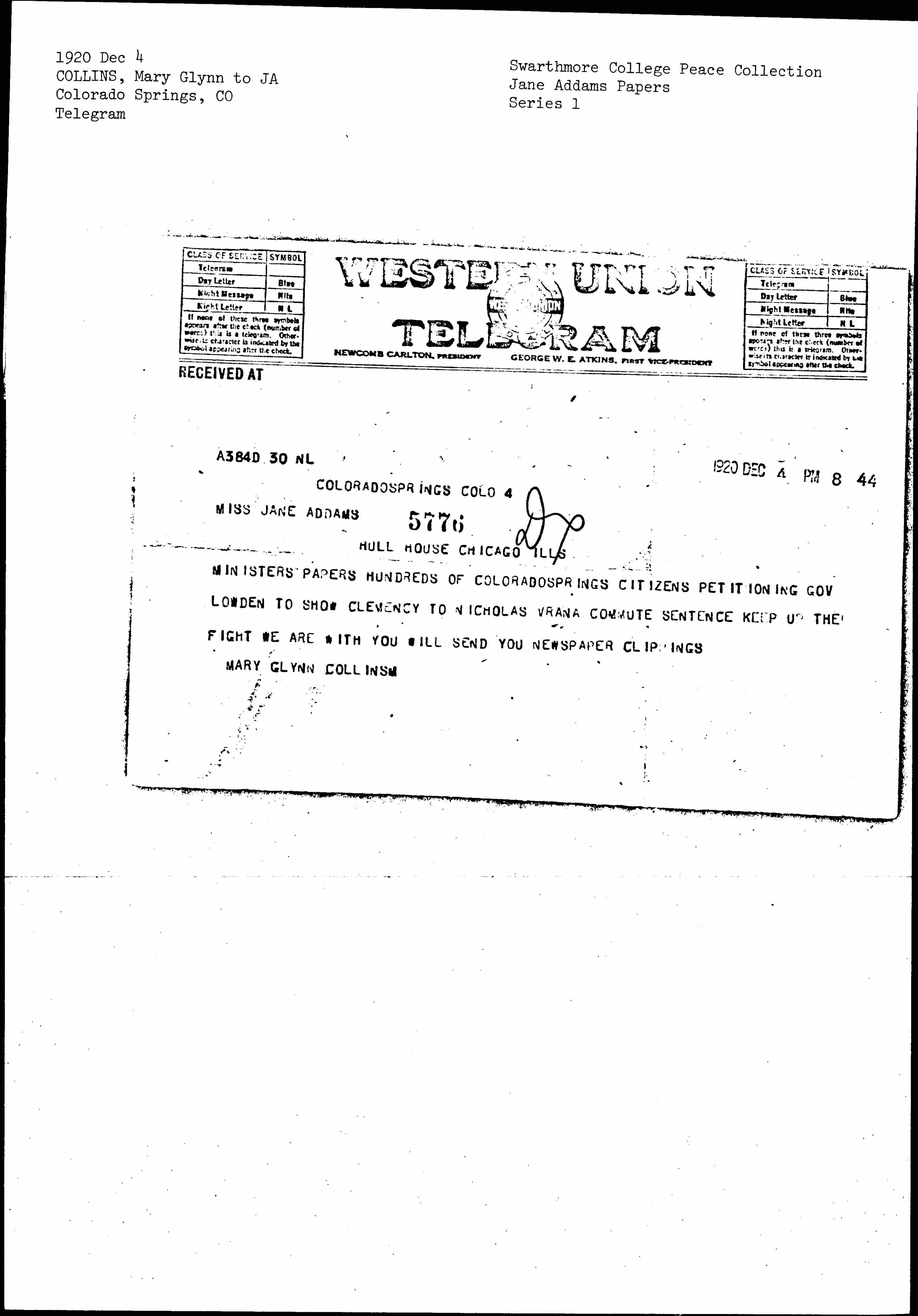 MINISTERS PAPERS HUNDREDS OF COLORADO SPRINGS CITIZENS PETITIONING GOV LOWDEN TO SHOW CLEMENCY TO NICHOLAS [VIANA] COMMUTE SENTENCE KEEP UP THE FIGHT WE ARE WITH YOU WILL SEND YOU NEWSPAPER CLIPPINGS