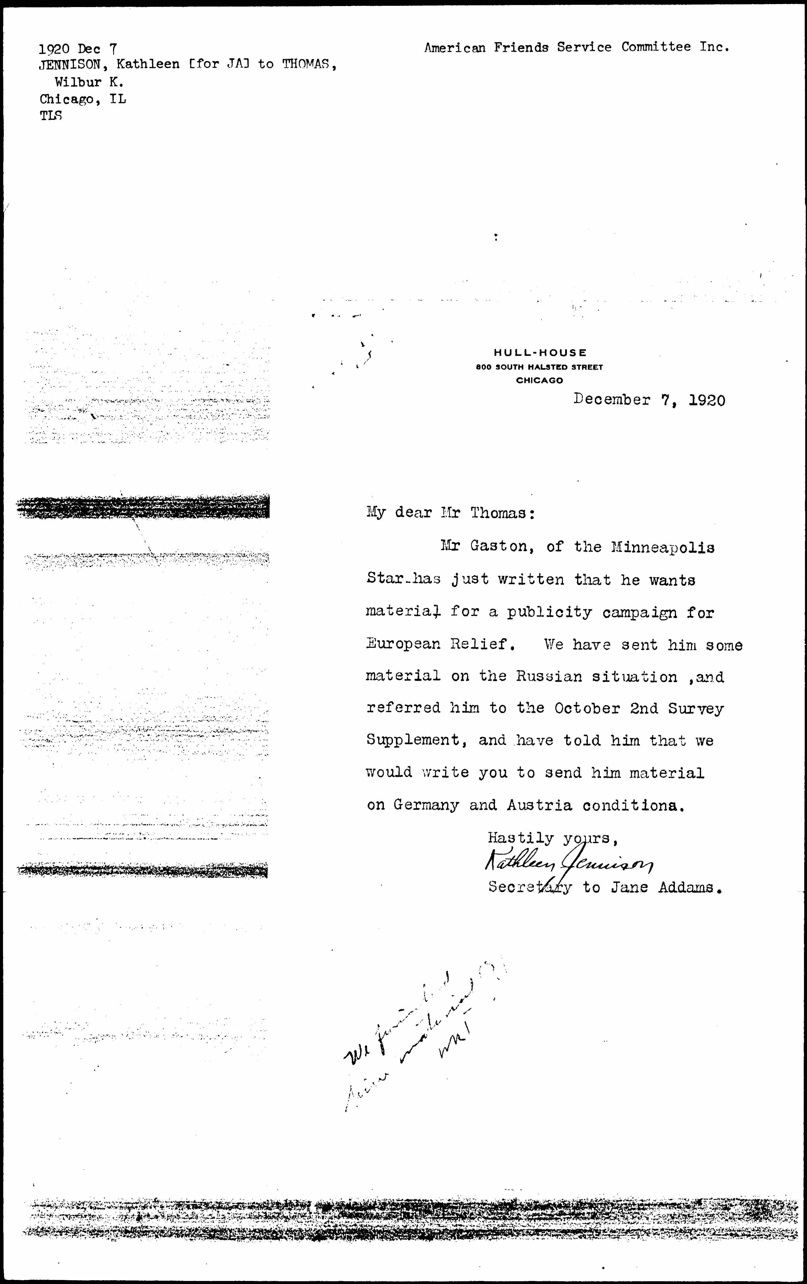 Mr Gaston, of the Minneapolis Star, has just written that he wants material for a publicity campaign for European Relief. We have sent him some material on the Russian situation, and referred him to the October 2nd Survey Supplement, and have told him that we would write you to send him material on Germany and Austria conditions.