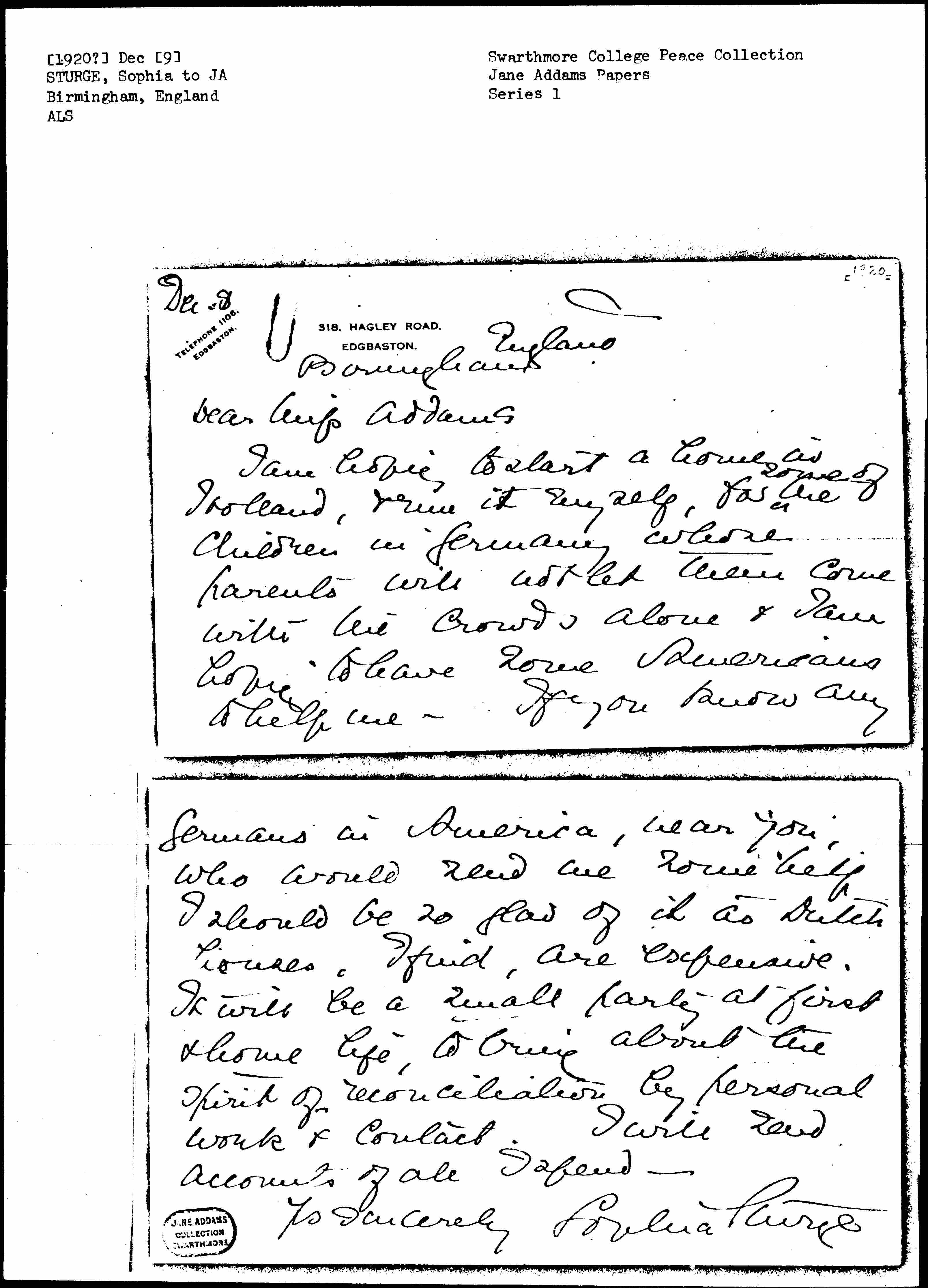 I am hoping to start a home in Holland, & use it myself, for ↑some of↓ the children in Germany whose parents will not let them come with the crowds alone & I am hoping to have some Americans to help me. If you know any [page 2] Germans in America, near you, who would send me some help I should be so glad of it as Dutch houses, I find, are expensive. It will be a small party at first & home life, to bring about the spirit of reconciliation by personal work & contact. I will send accounts of all [I find?].