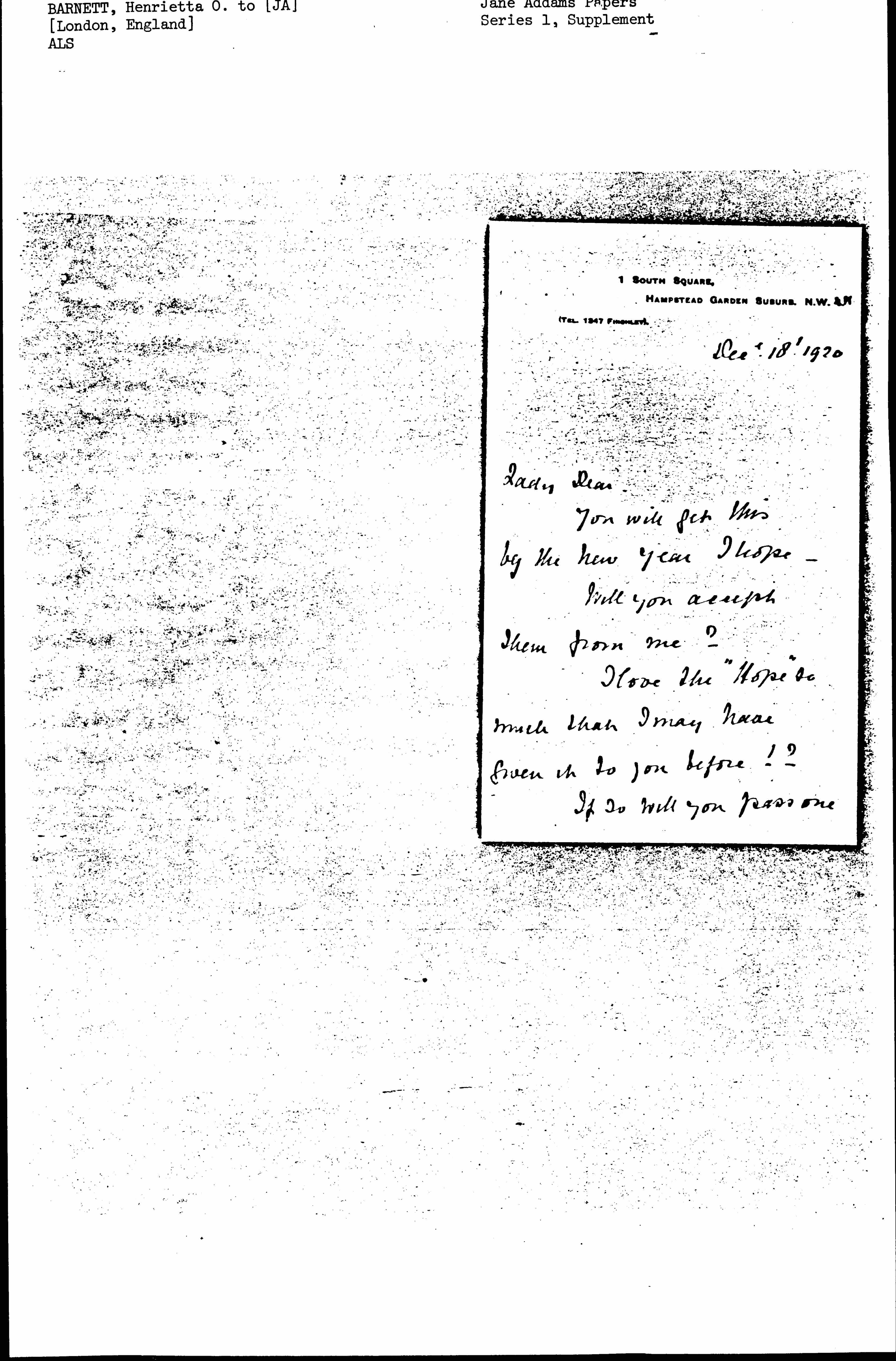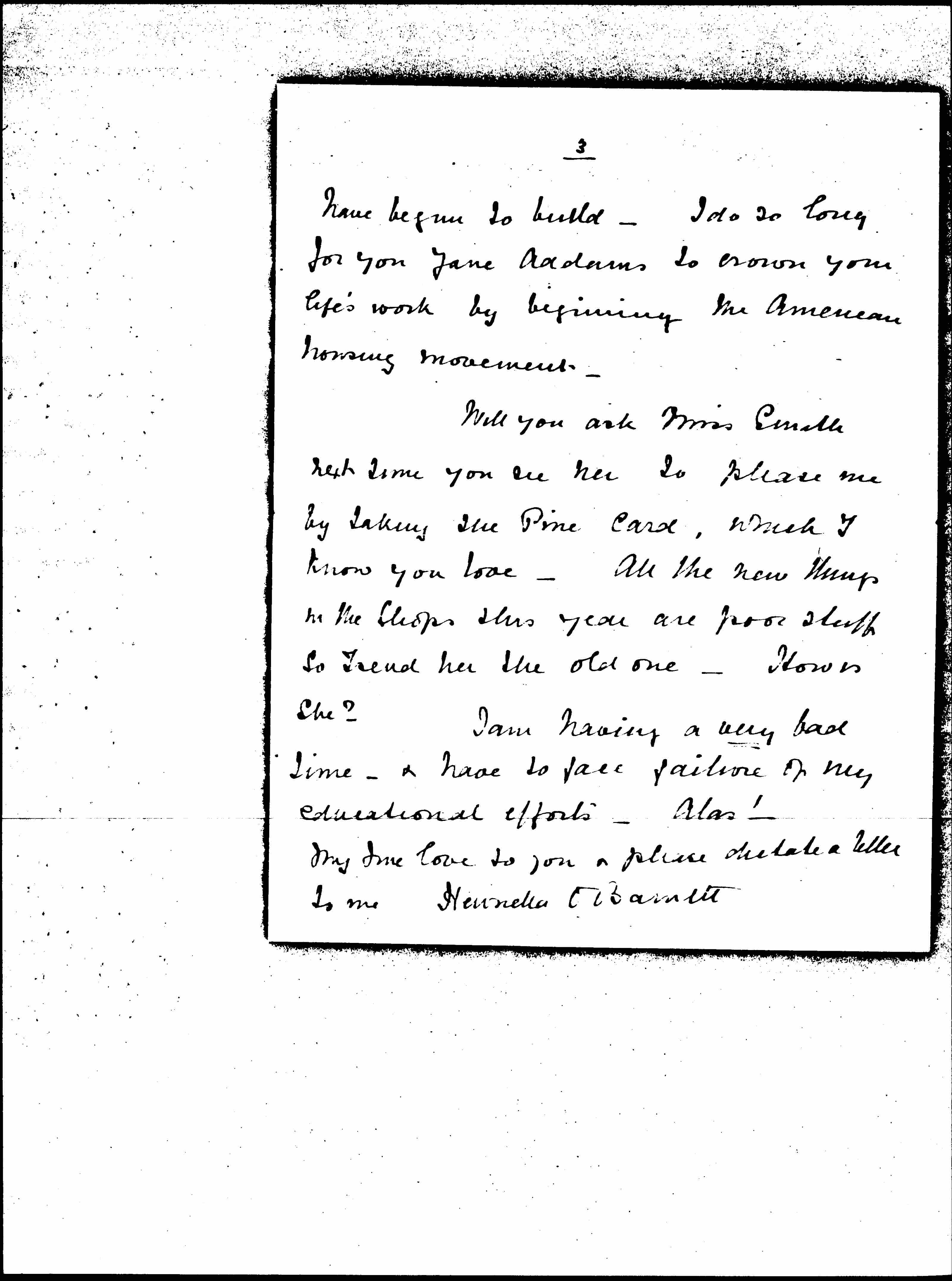I also send you the Joy picture -- though true-- of the First Street, & that is to have on your mantelpiece until you [page 3] have begun to build -- I do so long for you Jane Addams to crown your life's work by beginning the American housing movement.