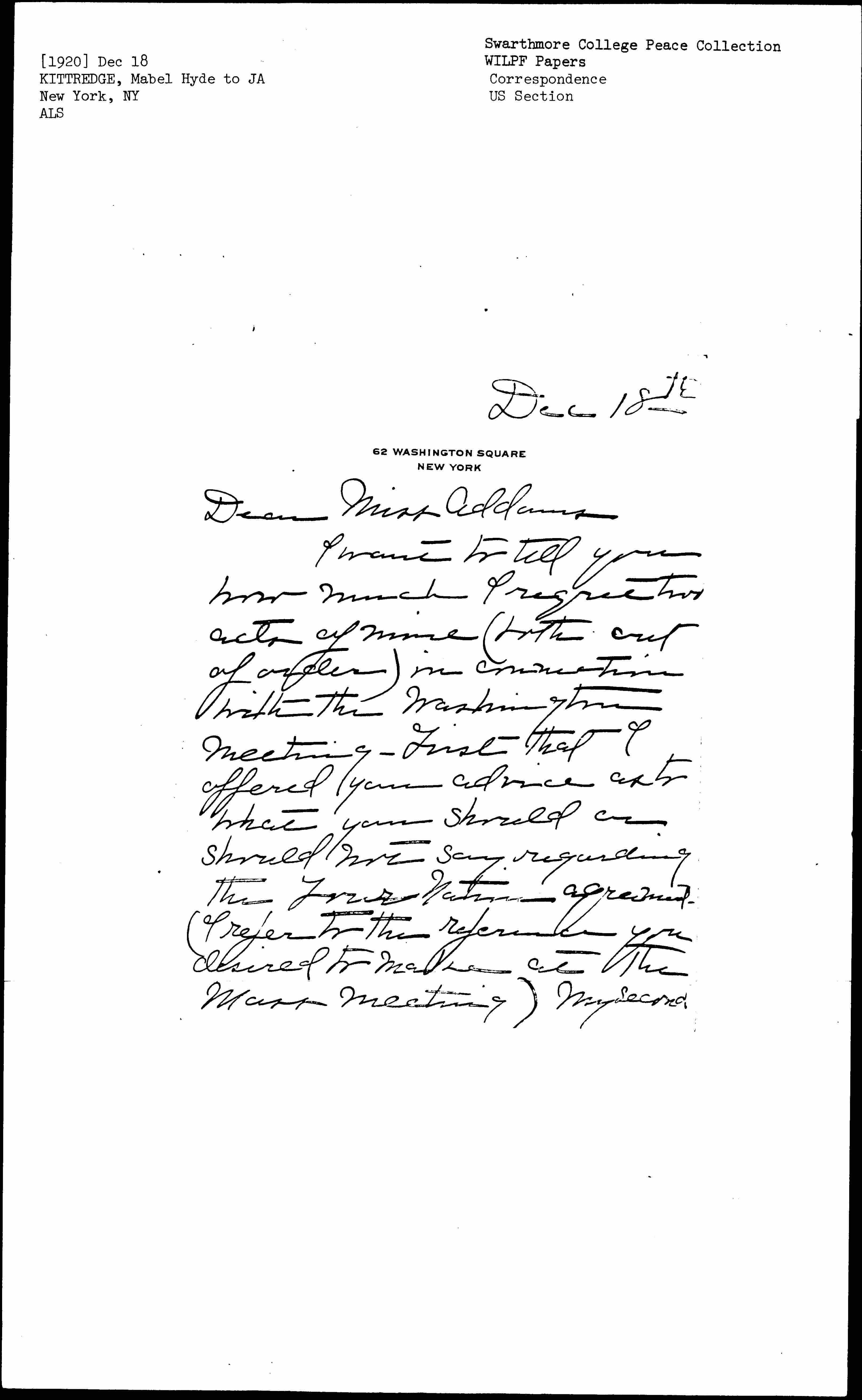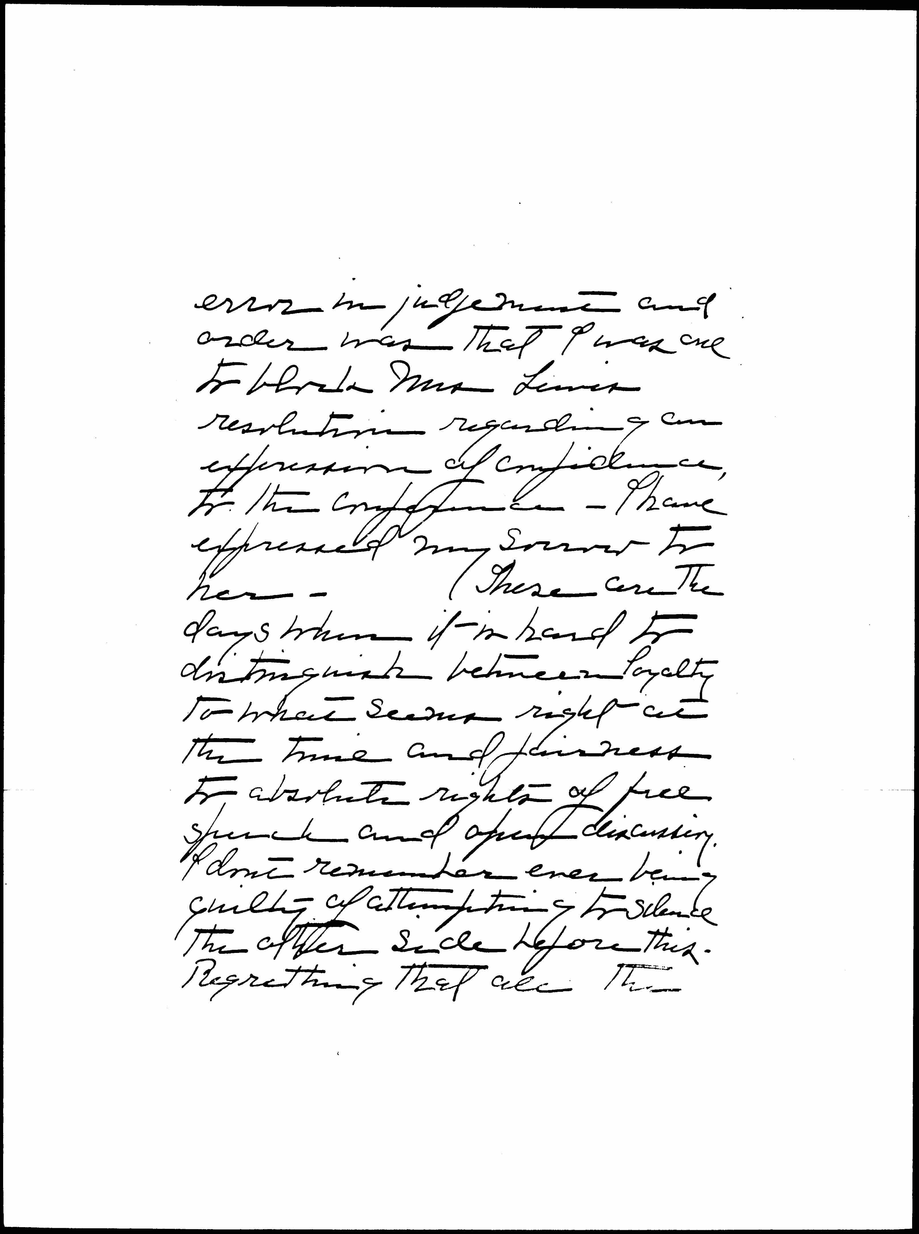 I want to tell you how much I regret two acts of mine (both out of order) in connection with the Washington meeting. First that I offered you advice as to what you should or should not say regarding the Four Nation agreement. (I refer to the reference you desired to make at the Wash meeting). My second [page 2] error in [judgment] and order was that I was one to block Mrs Lewis resolution regarding an expression of confidence, for the conference. I have expressed my sorrow to her.