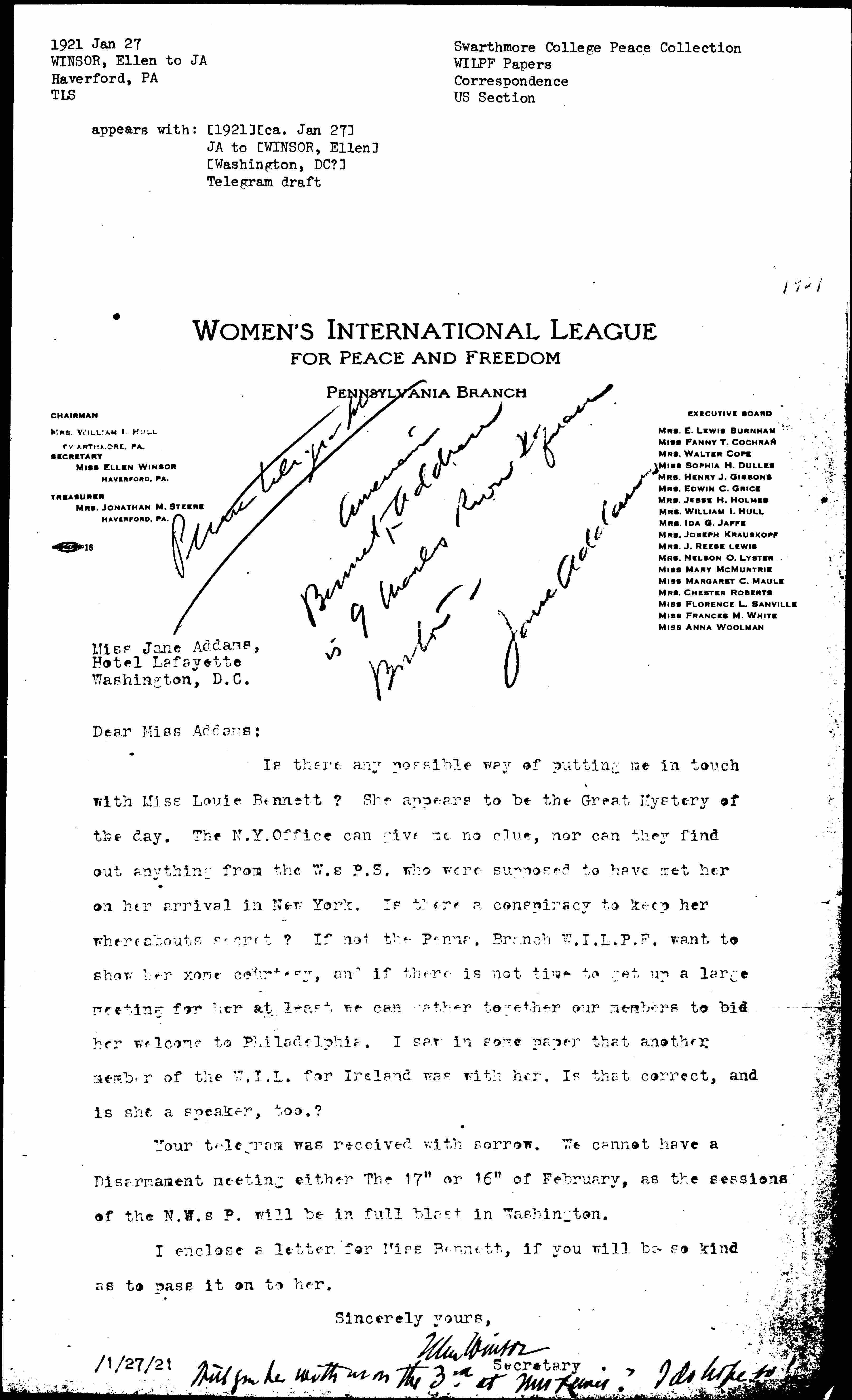 Is there any possible way of putting me in touch with Miss Louie Bennett? She appears to be the Great Mystery of the day. The N.Y. Office can give me no clue, nor can they find out anything from the W.s.P.S. who were supposed to have met her on her arrival in New York. Is there a conspiracy to keep her whereabouts secret? If not the Penn. Branch of the W.I.L.P.F. want to show her some courtesy, and if there is not time to get up a large meeting for her at least we can gather together our members to bid her welcome to Philadelphia. I saw in some paper that another member of the W.I.L. for Ireland was with her. Is that correct, and is she a speaker, too?