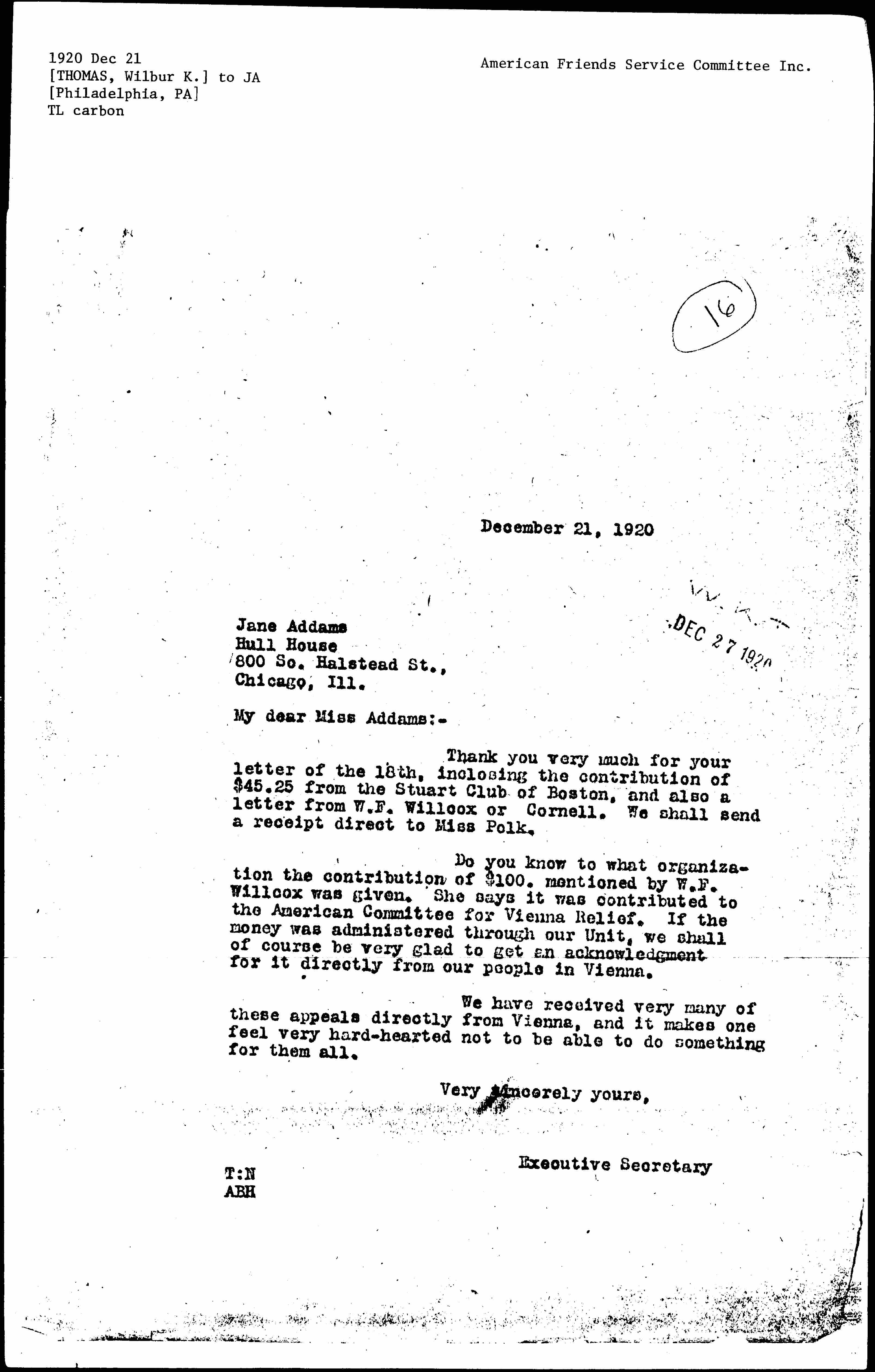 Do you know to what organization the contribution of $100 mentioned by W. F. Willcox was given. She says it was contributed to the American Committee for Vienna Relief. If the money was administered through our Unit, we shall of course by very glad to get an acknowledgement for it directly from our people in Vienna.