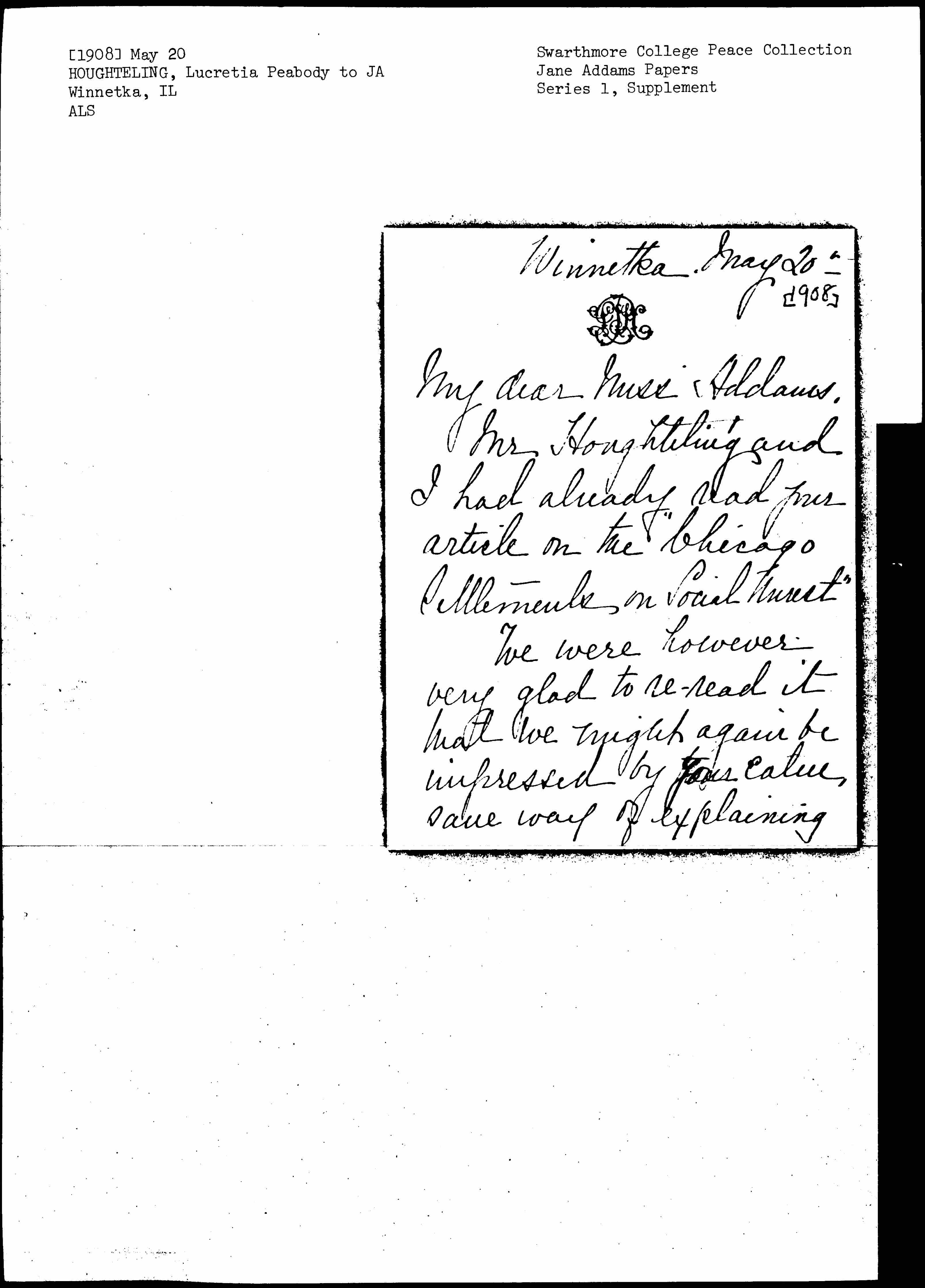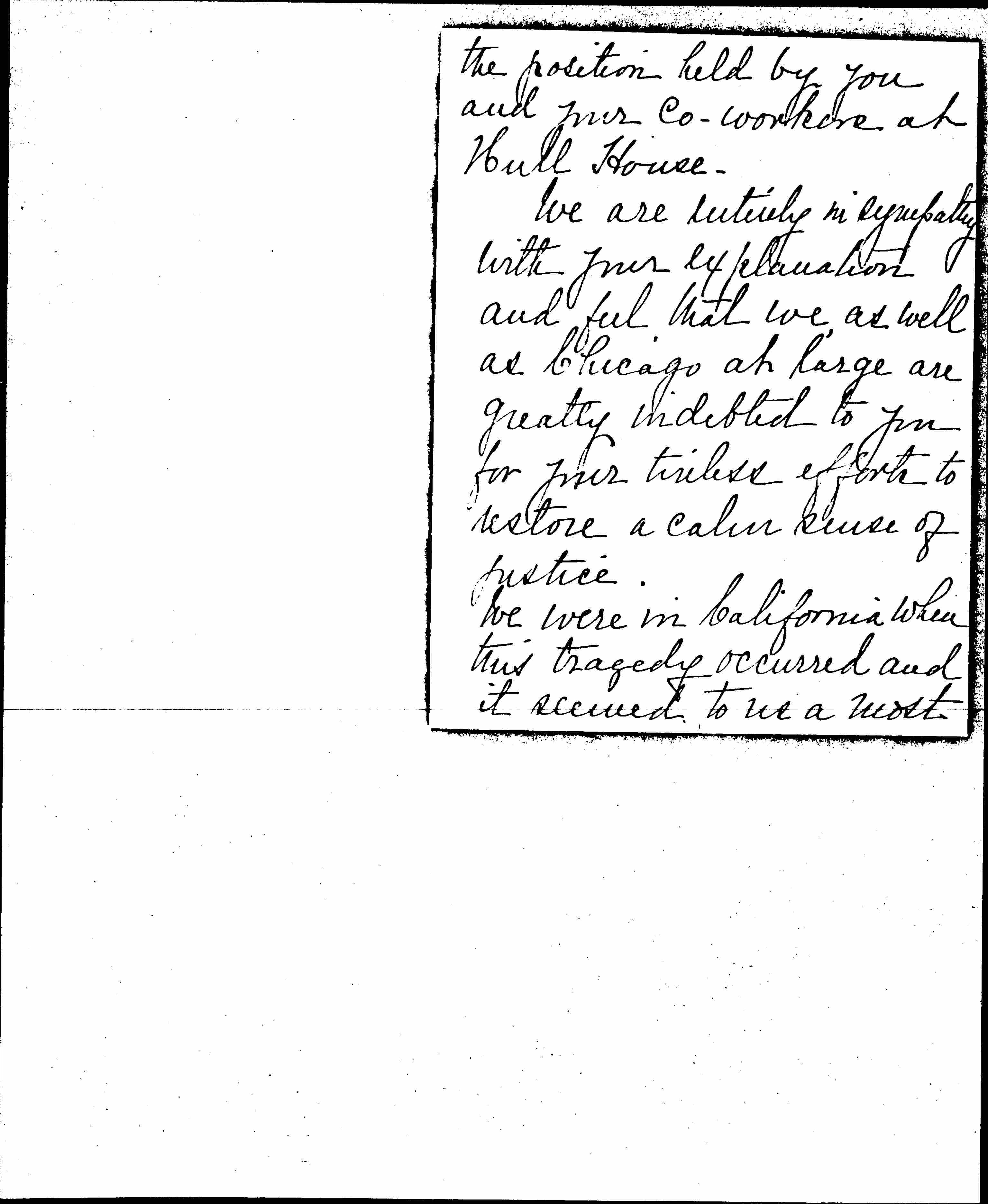 We were however very glad to re-read it that we might again be impressed by your calm, sane way of explaining [page 2] the position held by you and your co-workers at Hull House.