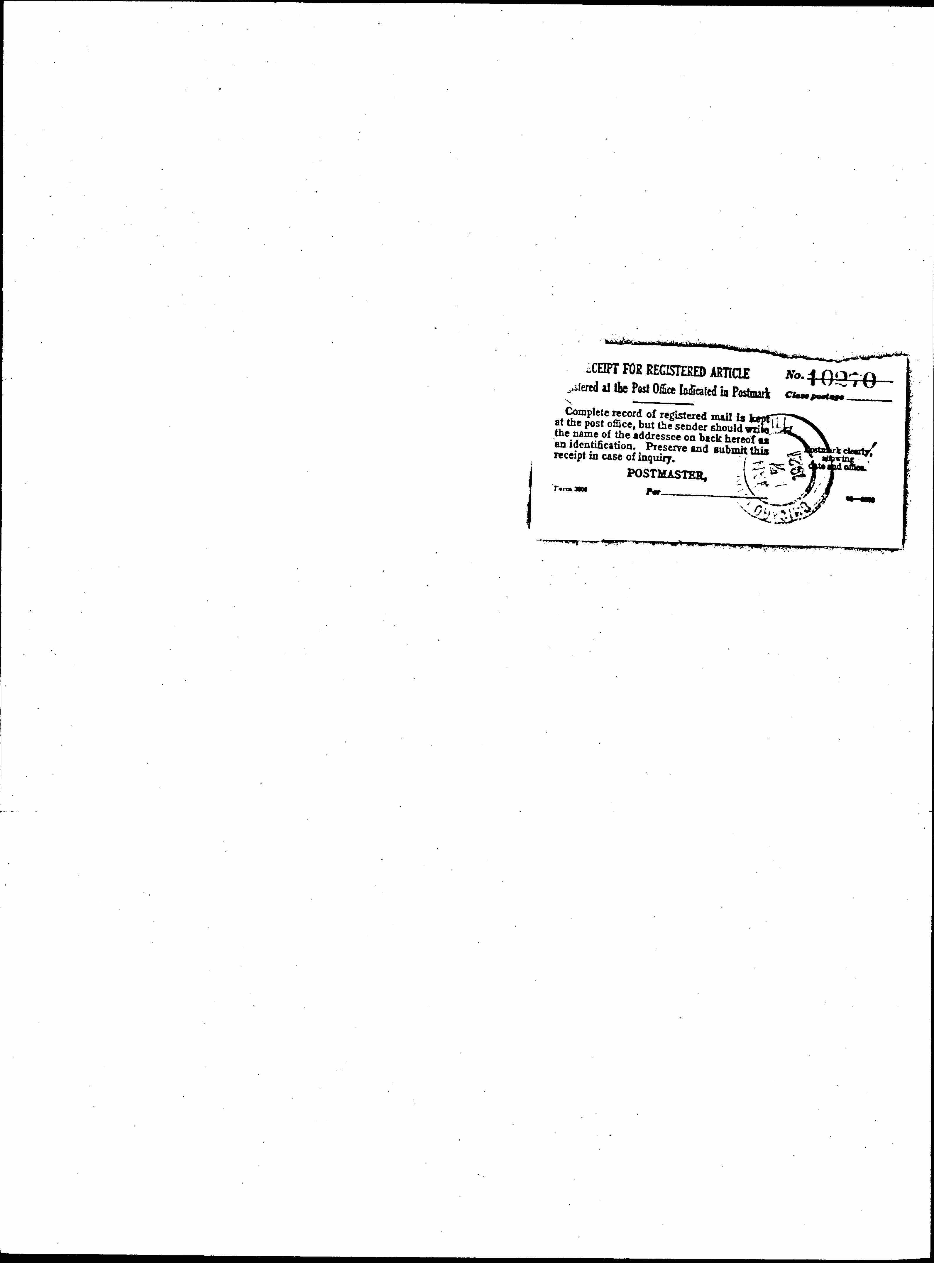 Complete record of registered mail is kept at the post office, but the sender should write the name of the addressee on back hereof as an identification. Preserve and submit this receipt in case of inquiry.