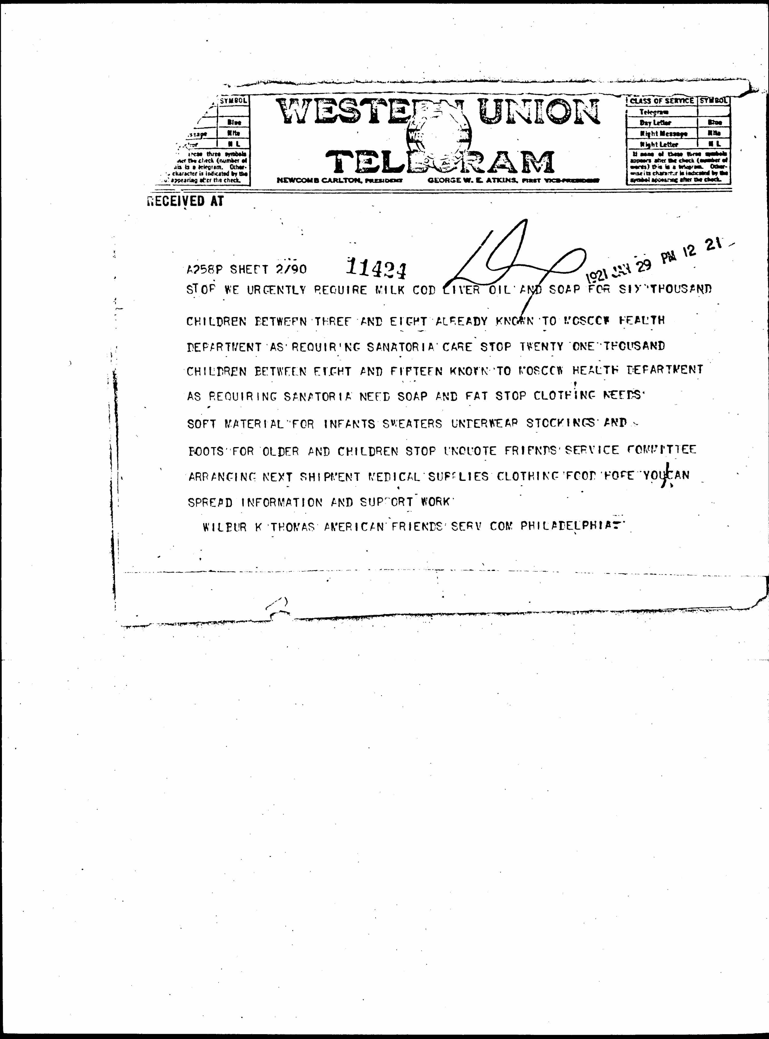 SOVIET GOVERNMENT HAVE GIVEN FRIENDS FULLEST OPPORTUNITY DISTRIBUTE RELIEF SUPPLIES FROM AMERICAN CABLES JUST RECEIVED "HAVE SECURED WAREHOUSE EXCLUSIVE USE OUR SUPPLIES UNDER OUR MANAGEMENT" CONDITIONS MOSCOW CABLES JUST RECEIVED "THIRTY EIGHT THOUSAND MOSCOW BABIES NEED MILK DAILY PRESENT SUPPLIES CAN ONLY FEED SEVEN THOUSAND INFANTILE MORTALITY FORTY PERCENT. FIVE AND HALF THOUSAND GROSS TINS CONDENSED MILK URGENTLY NEEDED FOR FEEDING MOSCOW INFANTS DURING MARCH APRIL AND MAY. [page 2] WE URGENTLY REQUIRE MILK COD LIVER OIL AND SOAP FOR SIX THOUSAND CHILDREN BETWEEN THREE AND EIGHT ALREADY KNOWN TO MOSCOW HEALTH DEPARTMENT AS REQUIRING SANATORIA CARE. TWENTY ONE THOUSAND CHILDREN BETWEEN EIGHT AND FIFTEEN KNOWN TO MOSCOW HEALTH DEPARTMENT AS REQUIRING SANATORIA NEED SOAP AND FAT. CLOTHING NEEDS SOFT MATERIAL FOR INFANTS SWEATERS UNDERWEAR STOCKINGS AND BOOTS FOR OLDER AND CHILDREN." FRIENDS SERVICE COMMITTEE ARRANGING NEXT SHIPMENT MEDICAL SUPPLIES CLOTHING FOOD HOPE YOU CAN SPREAD INFORMATION AND SUPPORT WORK