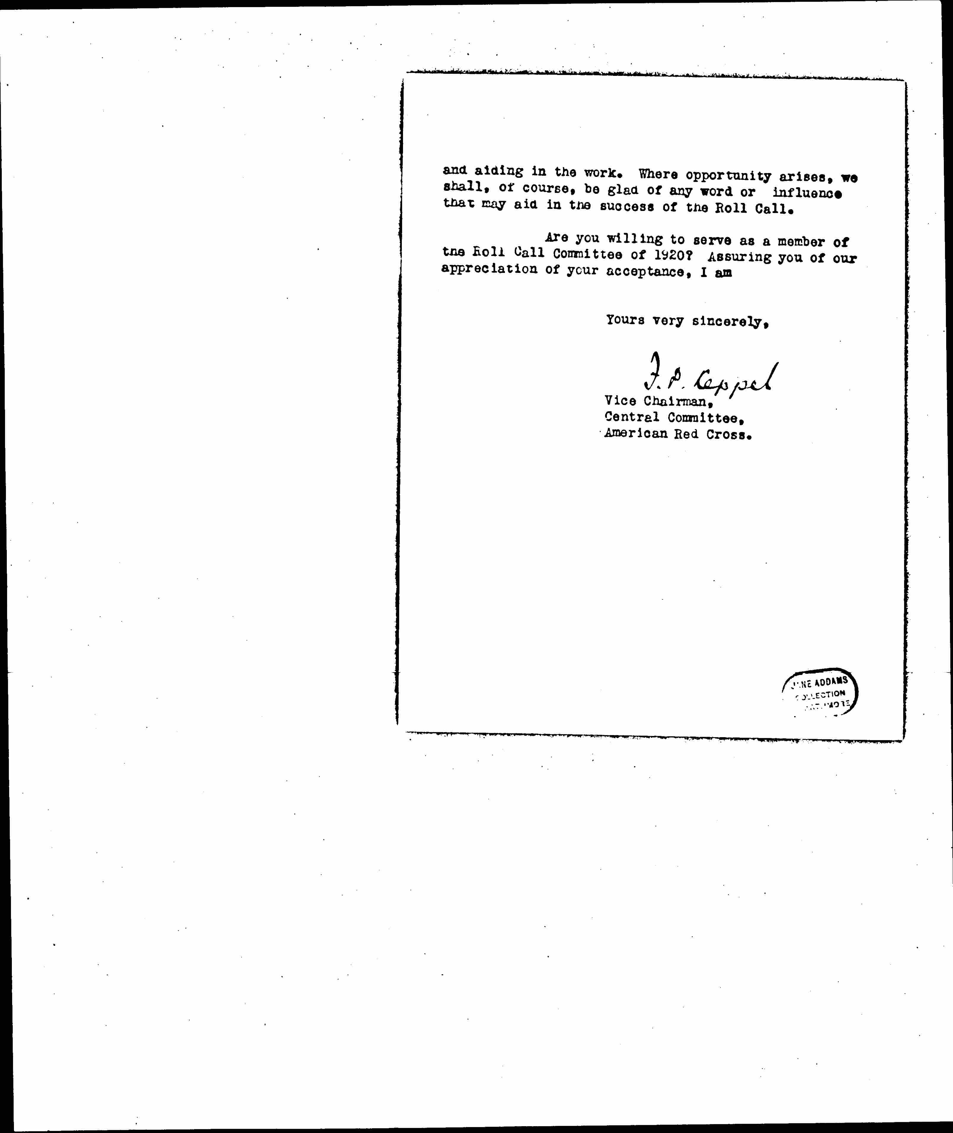 Are you willing to serve as a member of the Roll Call Committee of 1920? Assuring you of our appreciation of your acceptance, I am