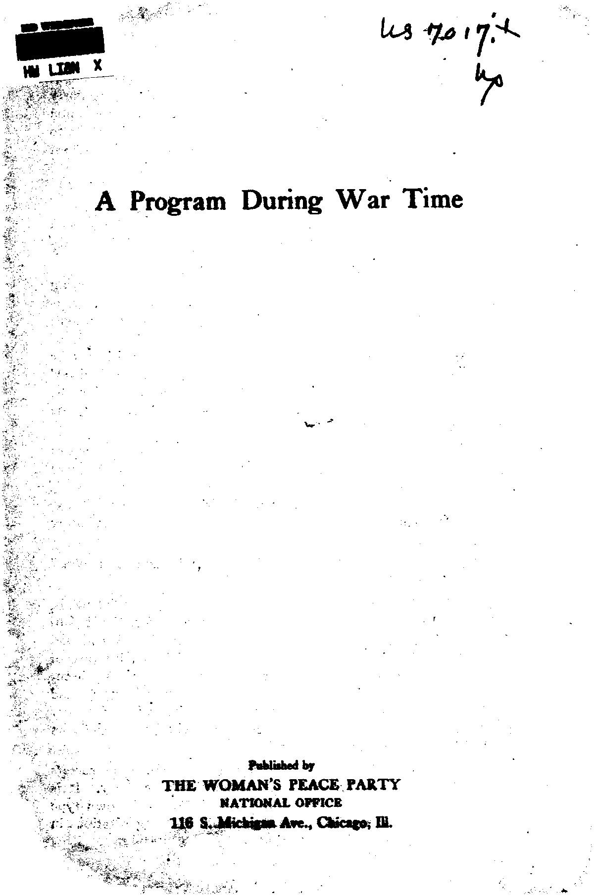 Under the shadow of the war which we hoped our country might not be called upon to enter, members of the Woman's Peace Party do not need to affirm or reaffirm their patriotism and the devotion of their lives to our country's higher life. The Internationalism to which the Woman's Peace Party is pledged came to fulfill the highest nationalism and not to destroy it.