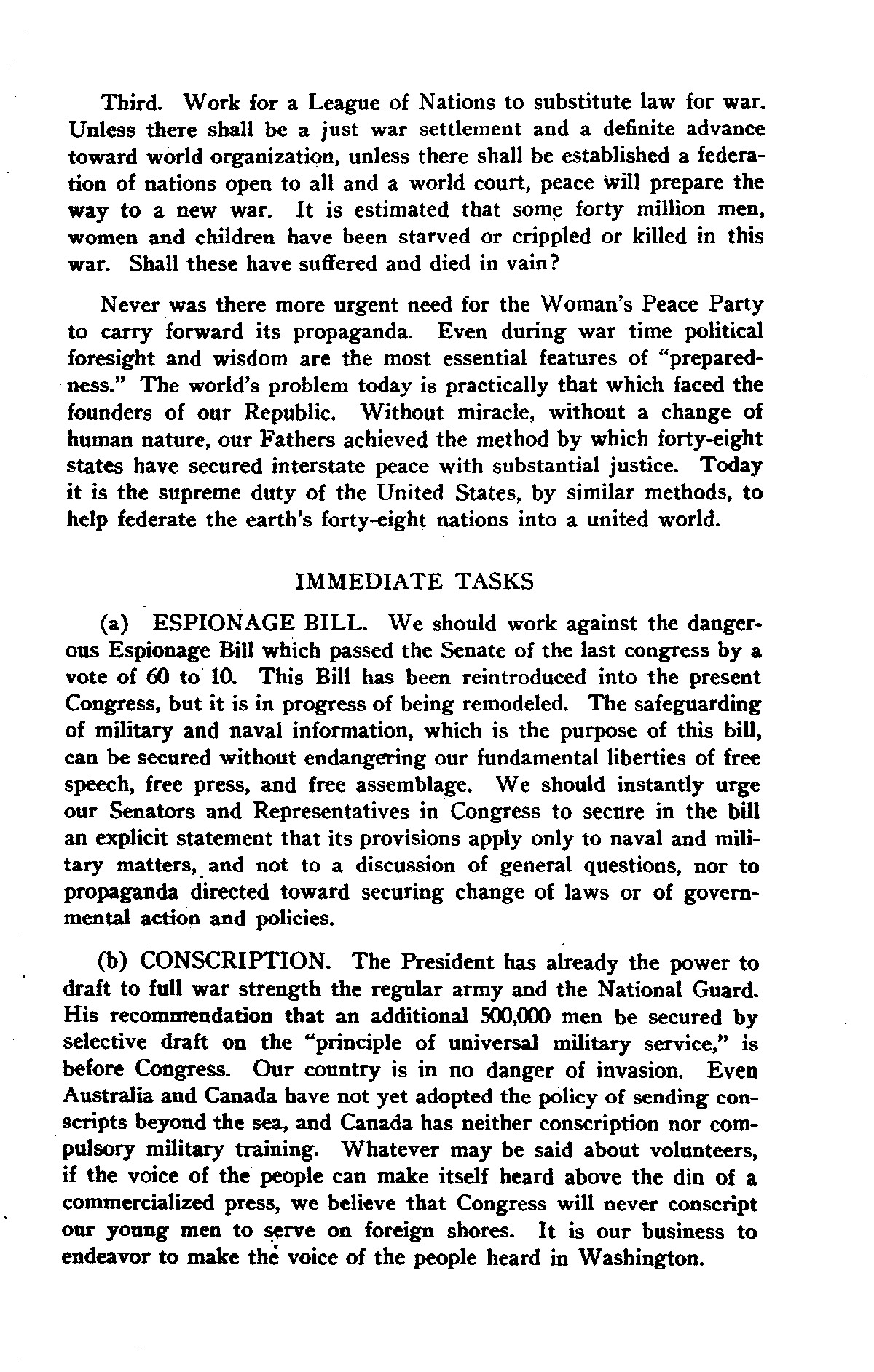(b) CONSCRIPTION. The President has already the power to draft to full war strength the regular army and the National Guard. His recommendation that an additional 500,000 men be secured by selective draft on the "principle of universal military service," is before Congress. Our country is in no danger of invasion. Even Australia and Canada have not yet adopted the policy of sending conscripts beyond the sea, and Canada has neither conscription nor compulsory military training. Whatever may be said about volunteers, if the voice of the people can make itself heard above the din of a commercialized press, we believe that Congress will never conscript our young men to serve on foreign shores. It is our business to endeavor to make the voice of the people heard in Washington. [page 4]