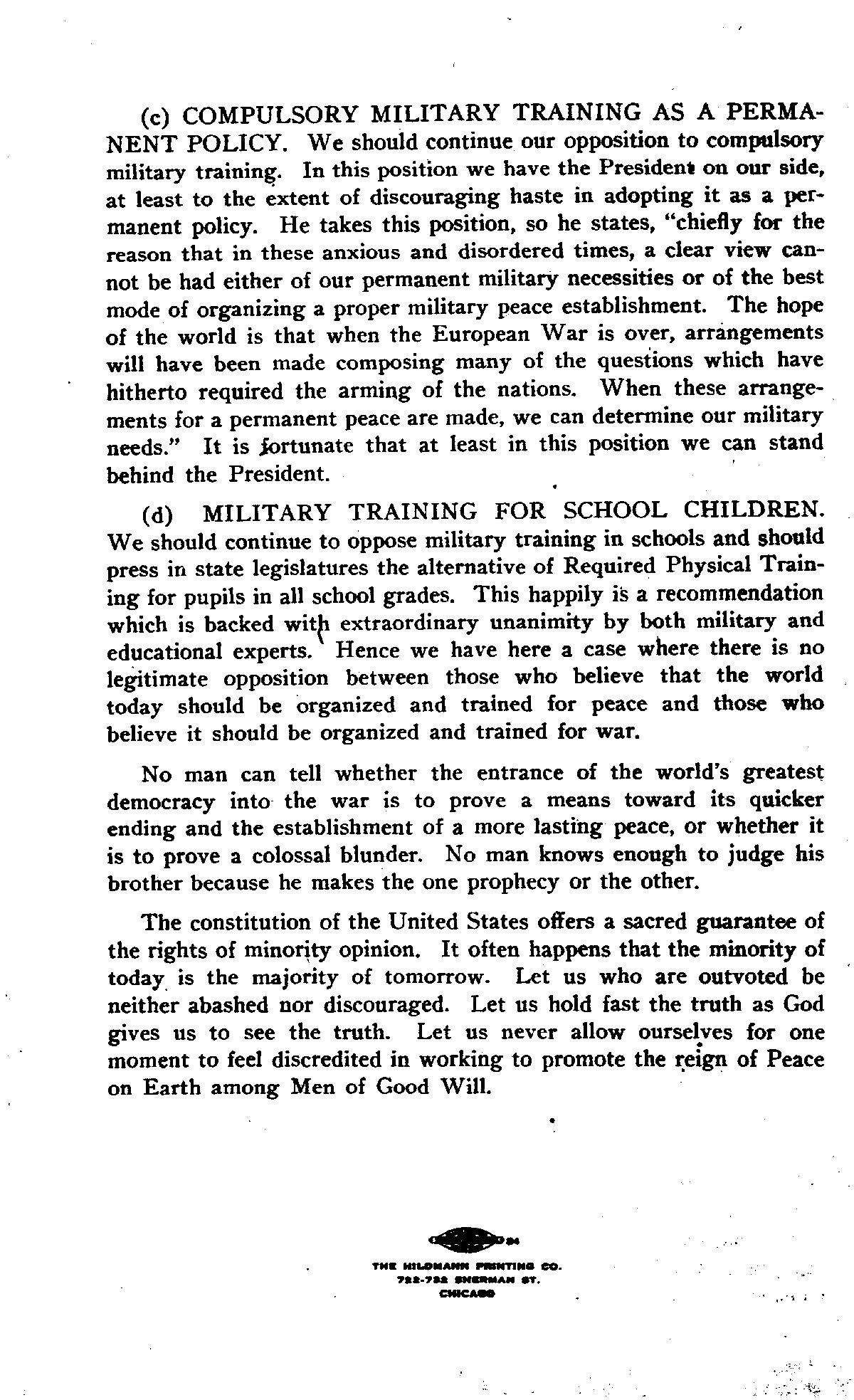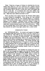 (c) COMPULSORY MILITARY TRAINING AS A PERMANENT POLICY. We should continue our opposition to compulsory military training. In this position we have the President on our side, at least to the extent of discouraging haste in adopting it as a permanent policy. He takes this position, so he states "chiefly for the reason that in these anxious and disordered times, a clear view cannot be had either of our permanent military necessities or of the best mode of organizing a proper military peace establishment. The hope of the world is that when the European War is over, arrangements will have been made composing many of the questions which have hitherto required the arming of the nations. When these arrangements for a permanent peace are made, we can determine our military needs." It is fortunate that at least in this position we can stand behind the President.