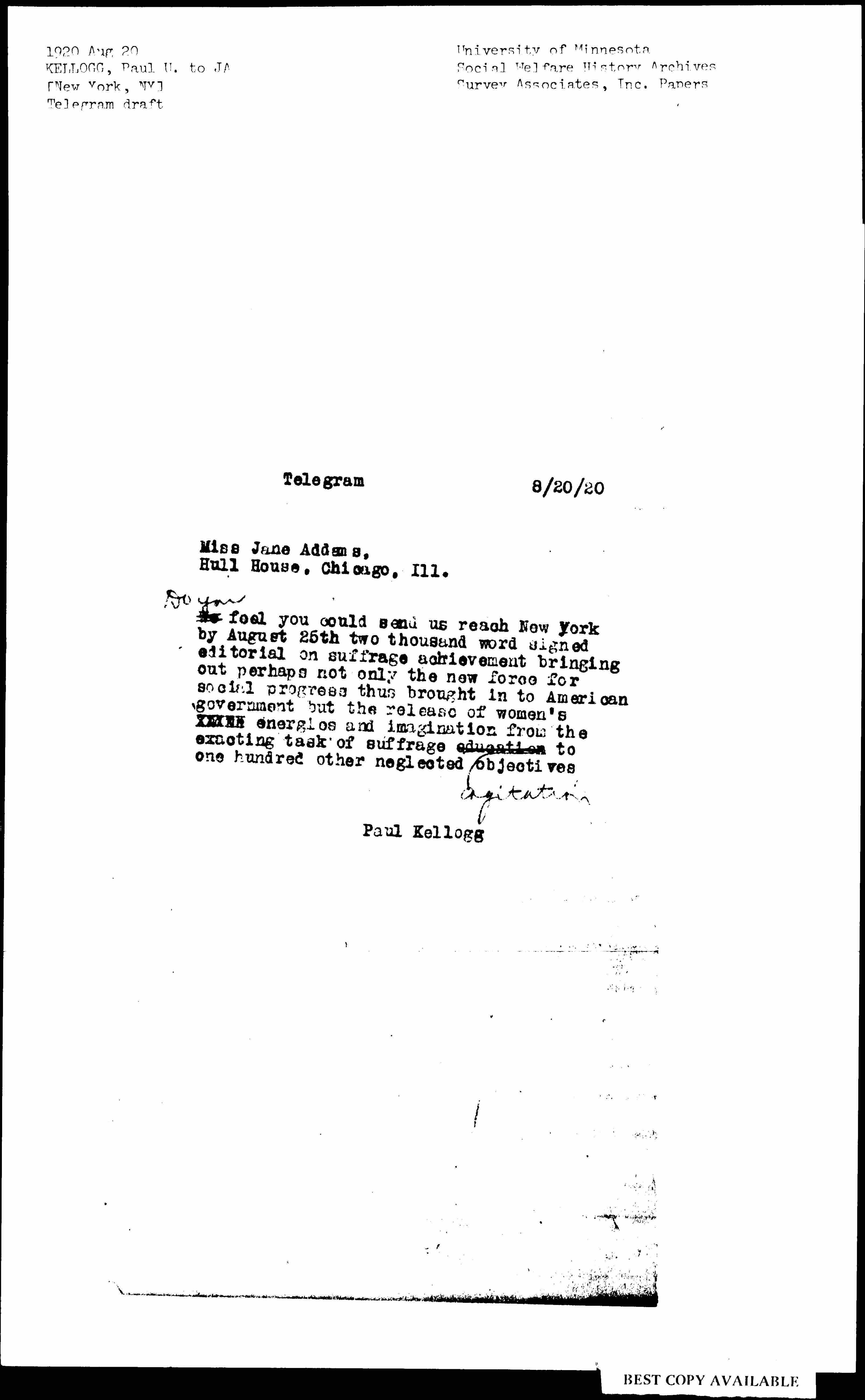 ↑Do you↓ We feel you could send us reach New York by August 25th two thousand word signed editorial on suffrage achievement bringing out perhaps not only the new force for social progress thus brought in to American government but the release of women's [illegible] energies and imagination from the exacting task of suffrage education ↑agitation↓ to one hundred other neglected objectives.