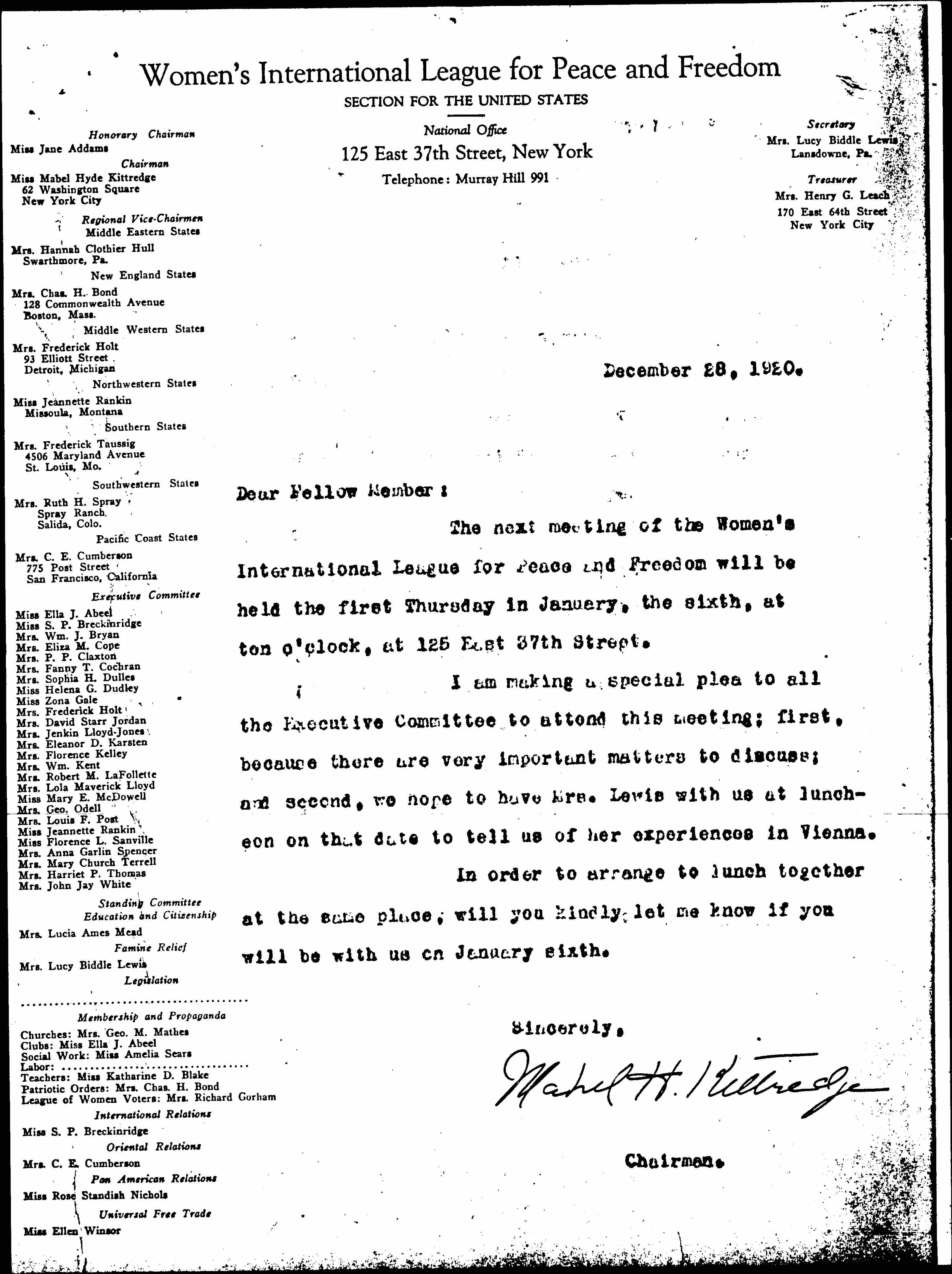 I am making a special plea to all the Executive Committee to attend this meeting; first, because there are very important matters to discuss; and second, we hope to have Mrs. Lewis with us at luncheon on that date to tell us of her experiences in Vienna.