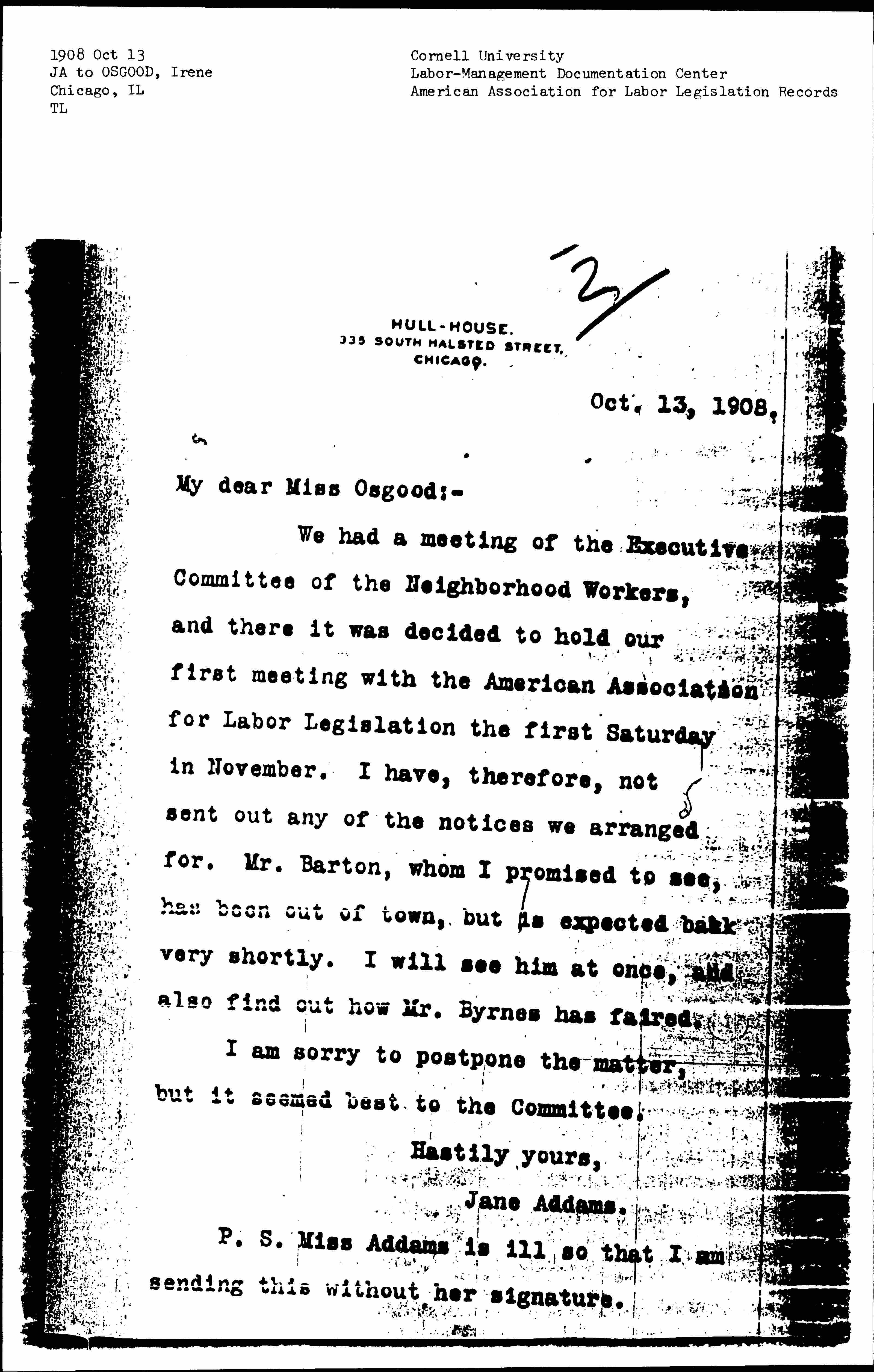 P.S. Miss Addams is ill so that I am sending this without her signature.