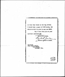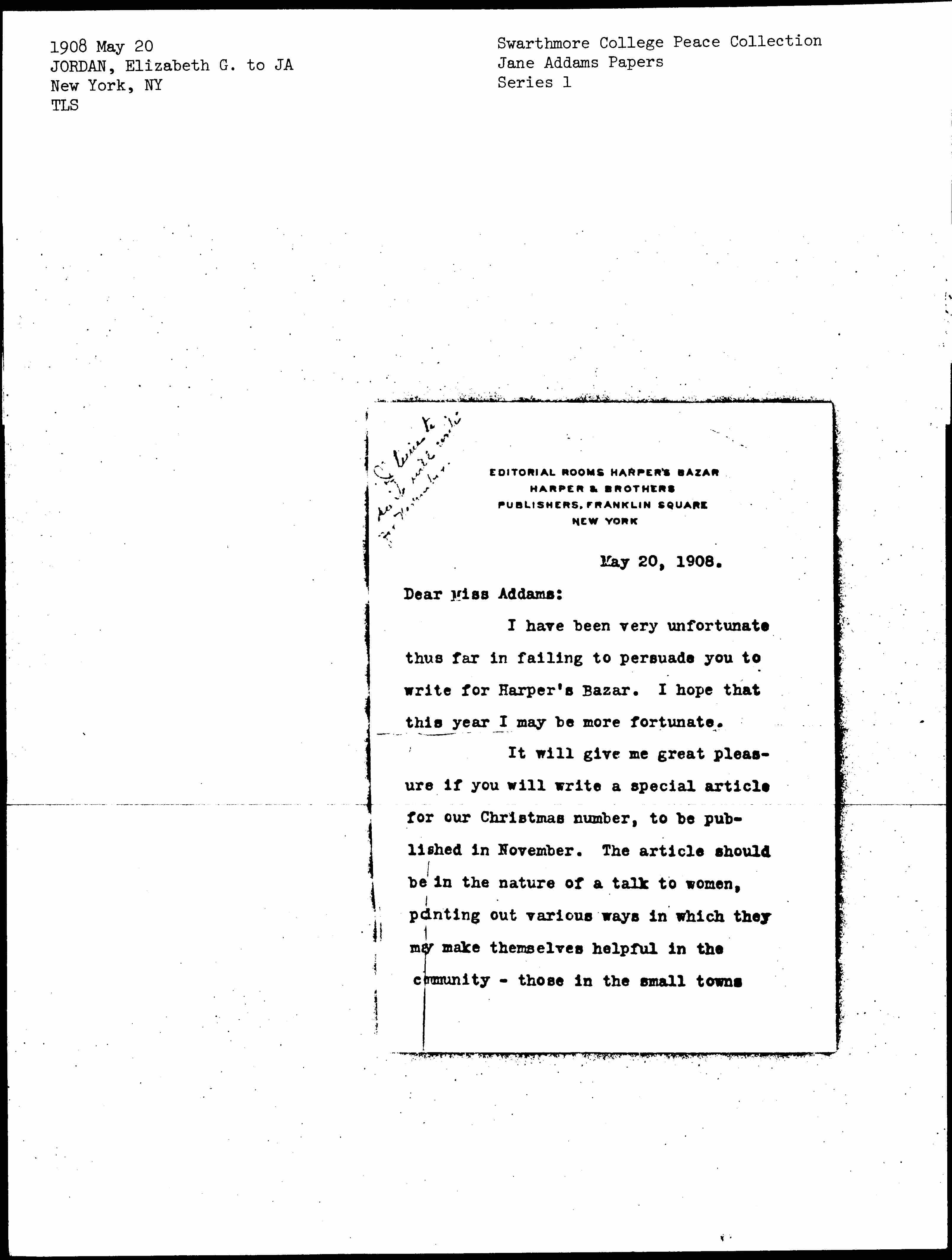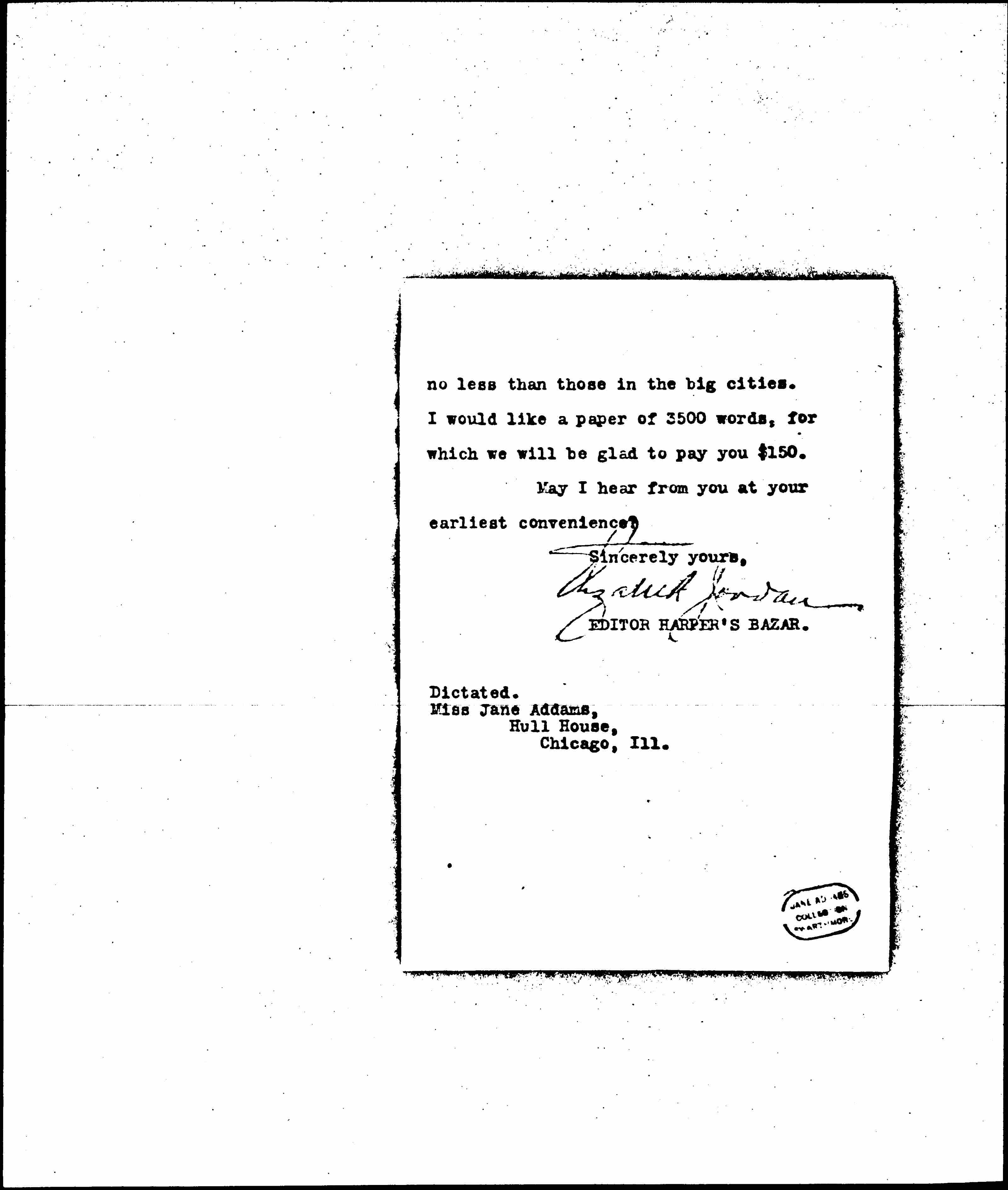 It will give me great pleasure if you will write a special article for our Christmas number, to be published in November. The article should be in the nature of a talk to women, pointing out various ways in which they may make themselves helpful in the community -- those in the small towns [page 2] no less than those in the big cities. I would like a paper of 3500 words, for which we will be glad to pay you $150.