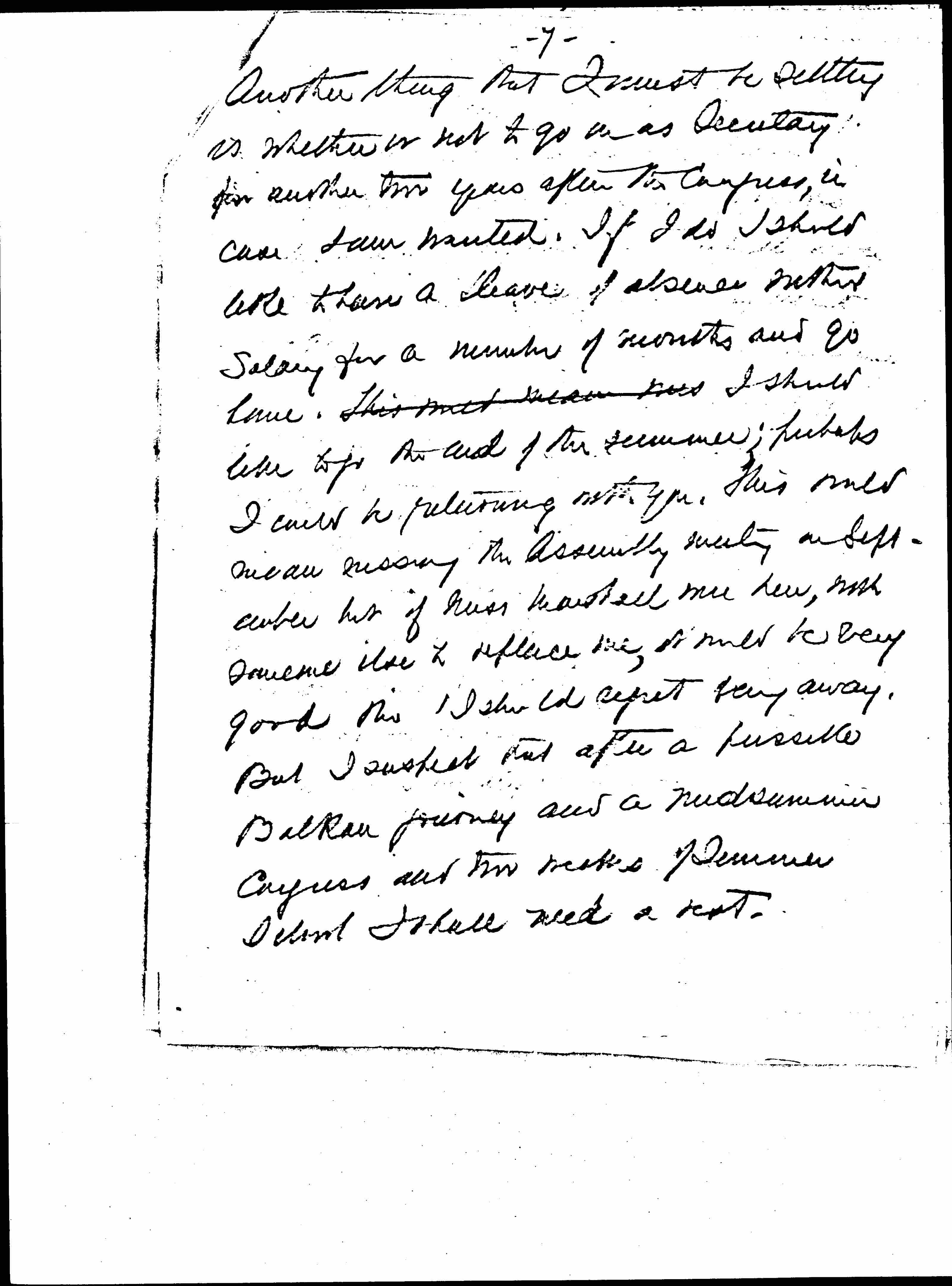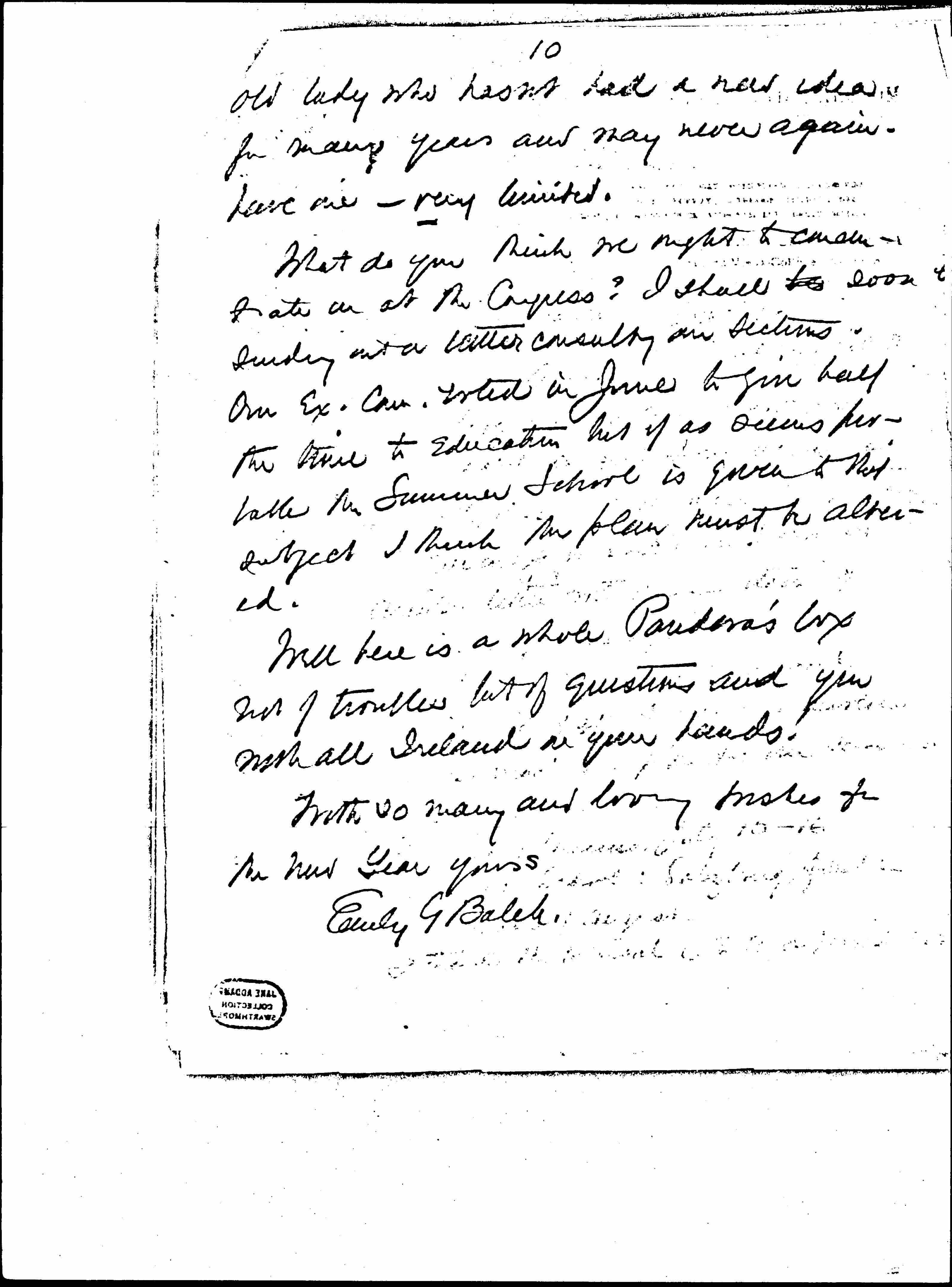 Another thing that I must be setting is whether or not to go on as Secretary for another two years after the Congress, in case I am wanted. If I do I should like to have a leave of absence without salary for a number of months and go home. This would mean [illegible] I should like to go the end of the summer; perhaps I could be returning with you. This would mean missing the Assembly meeting in September but if Miss Marshall were here, with someone else to replace me, it would be very good [though] I should regret being away. But I suspect that after a possible Balkan journey and a midsummer Congress and two weeks of Summer School I shall need a rest. [page 9]