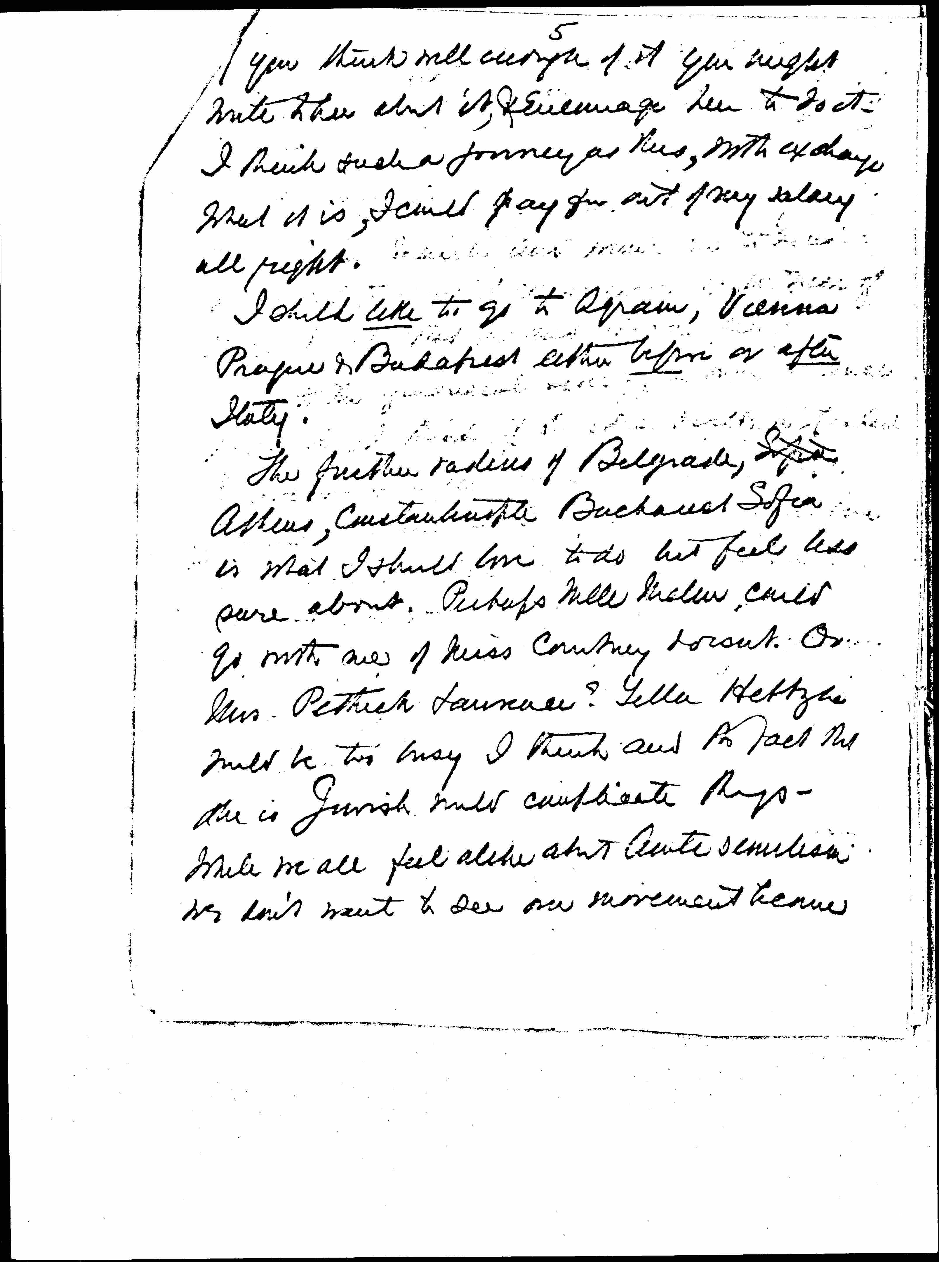 The further radius of Belgrade, Sofia Athens, Constantinople, Bucharest, Sofia is what I should love to do but feel less sure about. Perhaps Mlle Mélin could go with me if Miss Courtney doesn't. Or Mrs. Pethick-Laurence? Yella [Hertzka] would be too busy I think and the fact that she is Jewish would complicate things. While we all feel alike about [Anti-semitism] we don't want to see our movement become [page 7] [an] exclusively Jewish one in the S.E. of Europe and I think there is some danger of that.