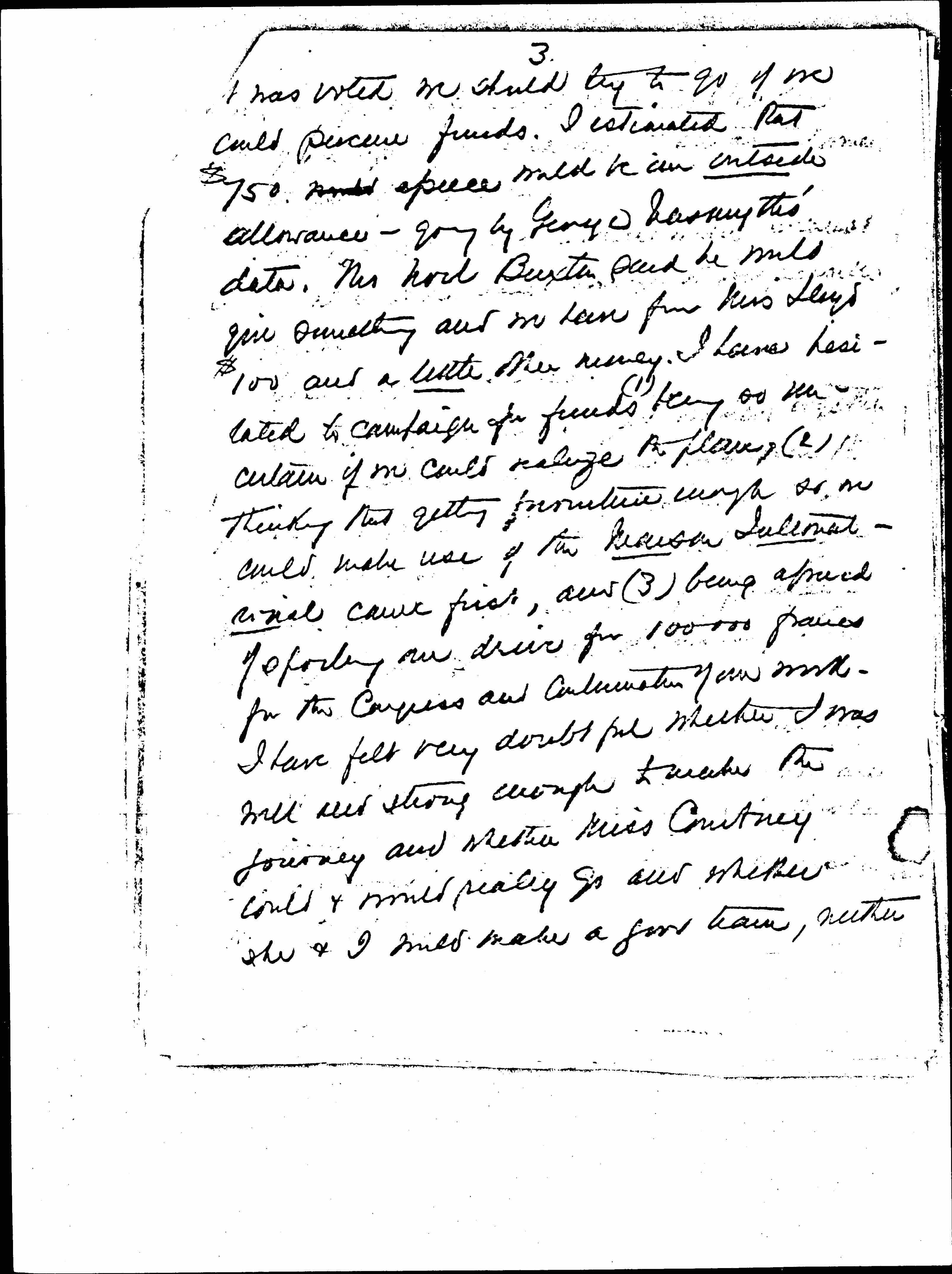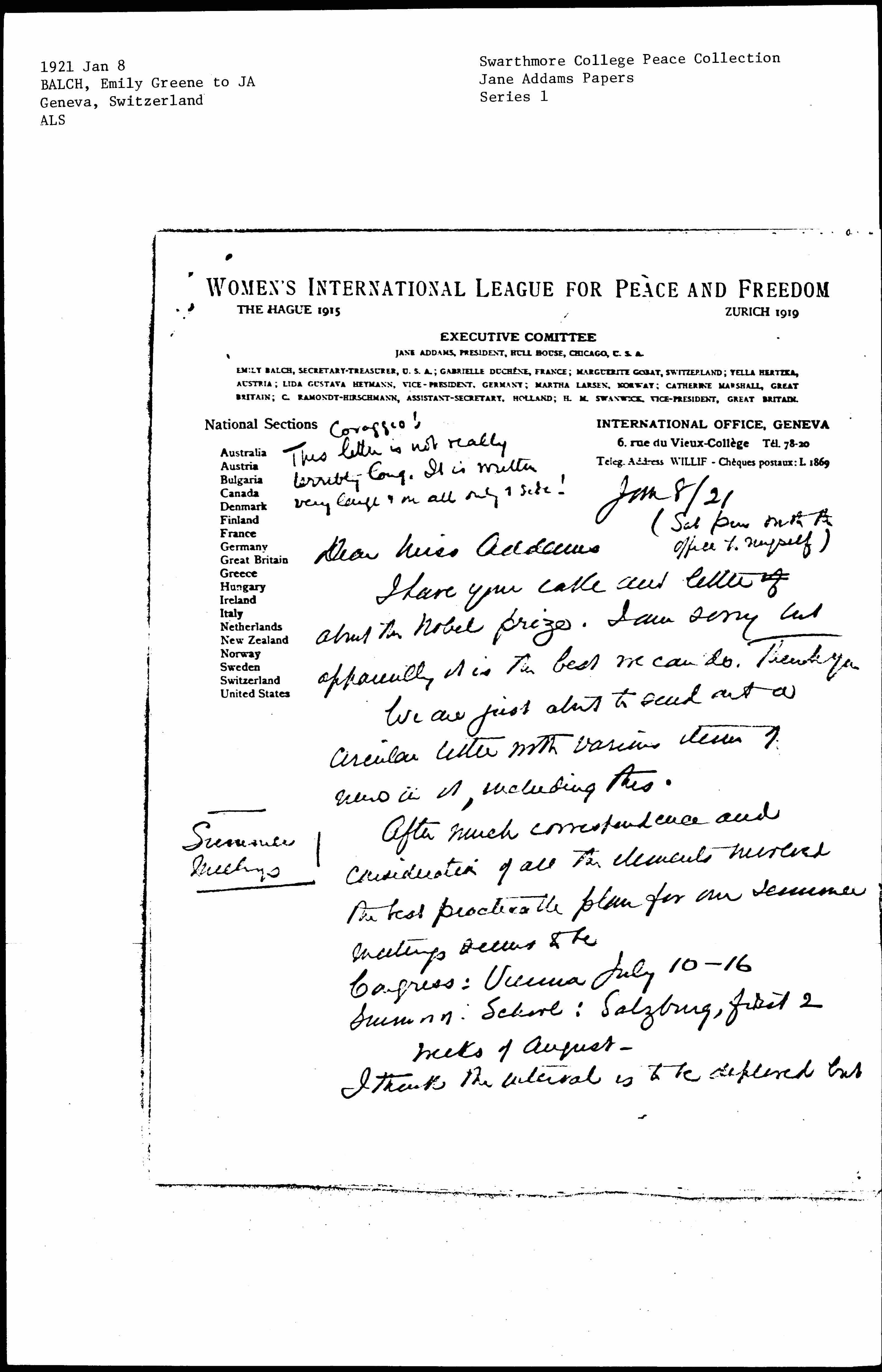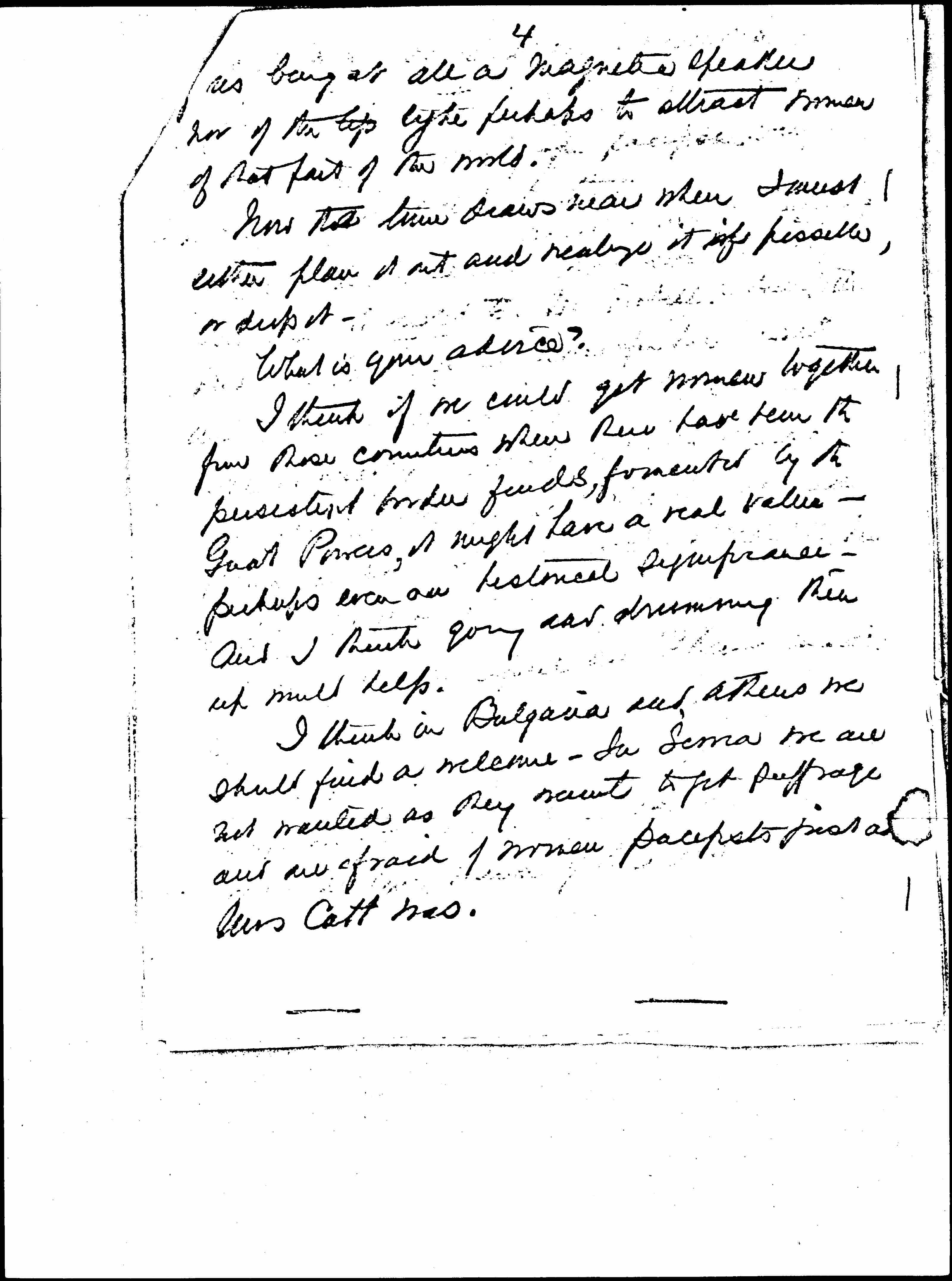 One of the things that puzzles me most is the question of an [organizing] journey which was talked of for last autumn at our June Ex. Com. meeting, when Miss Courtney and I hoped to go together to the Balkan Countries. [page 3] [It] was voted we should try to go if we could procure funds. I estimated that $750 would apiece would be an outside allowance -- going by George Nasmyths' data. Mr Noel Buxton said he would give something and we have from Miss Lloyd $100 and a little other money. I have hesitated to campaign for funds ↑(1)↓ being so uncertain if we could realize the plan, (2) thinking that getting furniture enough so we could make use of the Maison [Internationale] came first, and (3) being afraid of spoiling our drive for [100,000] francs for the Congress and continuation of our work. I have felt very doubtful whether I was well and strong enough to make the journey and whether Miss Courtney could & would really go and whether she & I would make a good team, neither [page 4] [of] us being at all a magnetic speaker nor of the type perhaps to attract women of that part of the world.