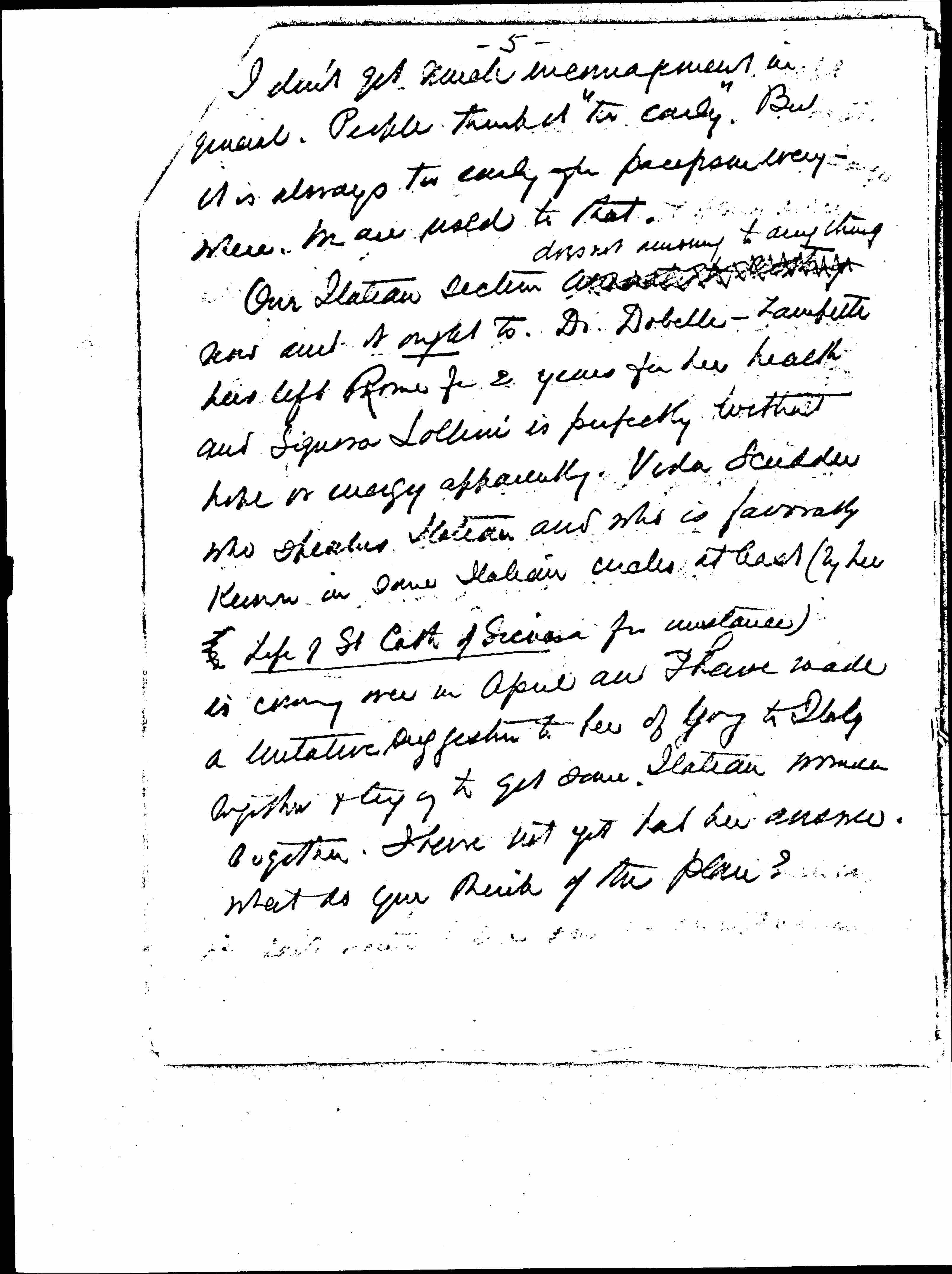 Our Italian section [illegible] ↑doesn't amount to anything↓ now and it ought to. Dr Dobelli-Zampetti has left Rome for 2 years for her health and Signora Lollini is perfectly without hope or energy apparently. Vida Scudder who speaks Italian and who is favorably known in some Italian circles at least (by her Life of St Cath of Siena for instance) is coming over in April and I have made a tentative suggestion to her of going to Italy together & trying to get some Italian women together. I have not yet had her answer. What do you think of the plan? [page 6]