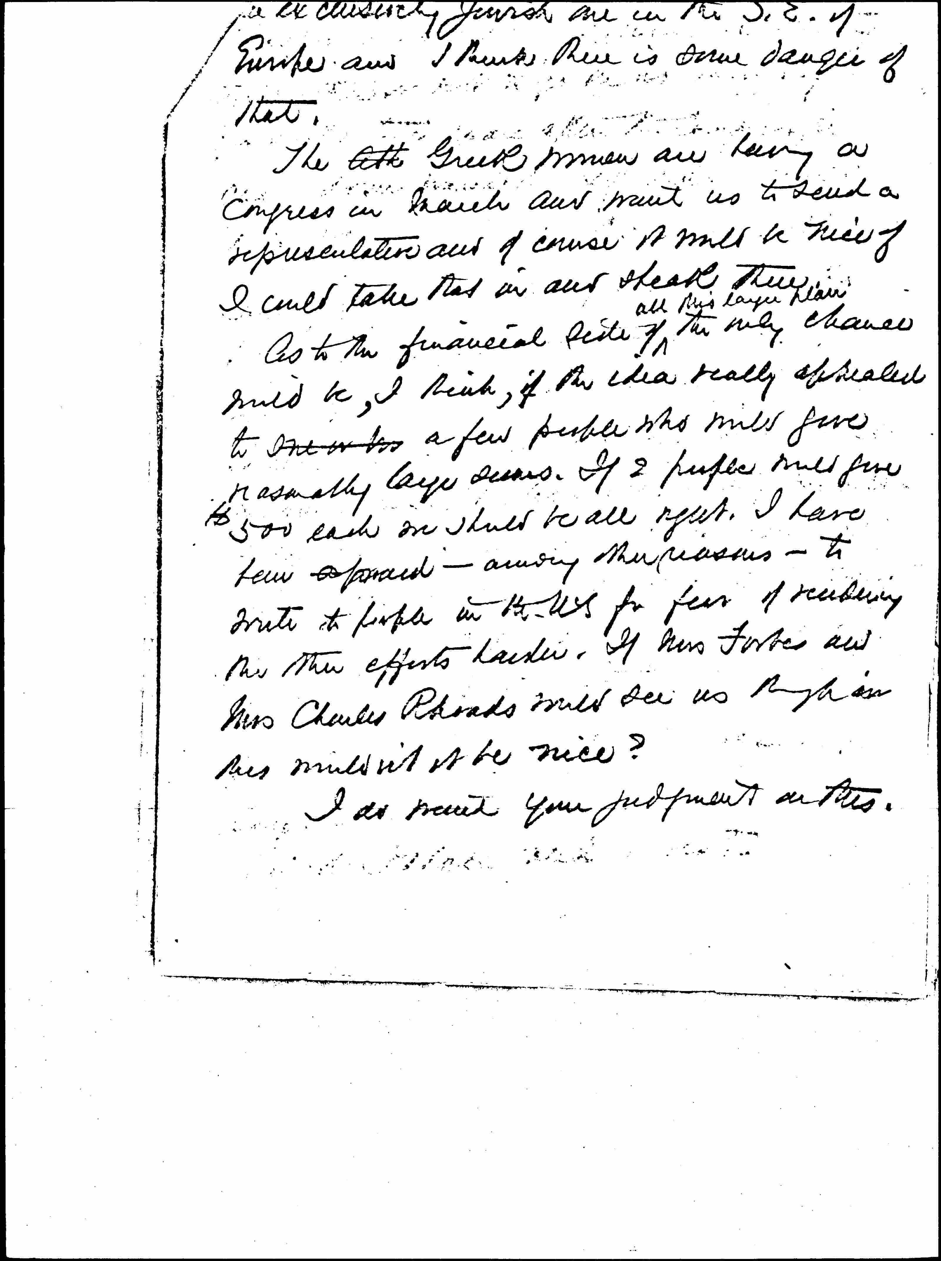 As to the financial side of ↑all this larger plan↓ the only chance would be, I think, if the idea really appealed to one or m a few people who would give reasonably large sums. If 2 people would give $500 each we should be all right. I have been afraid -- among other reasons -- to write to people in the US for fear of rendering the other efforts harder. If Mrs Forbes and Mrs Charles Rhoads would see us through in this wouldn't it be nice?