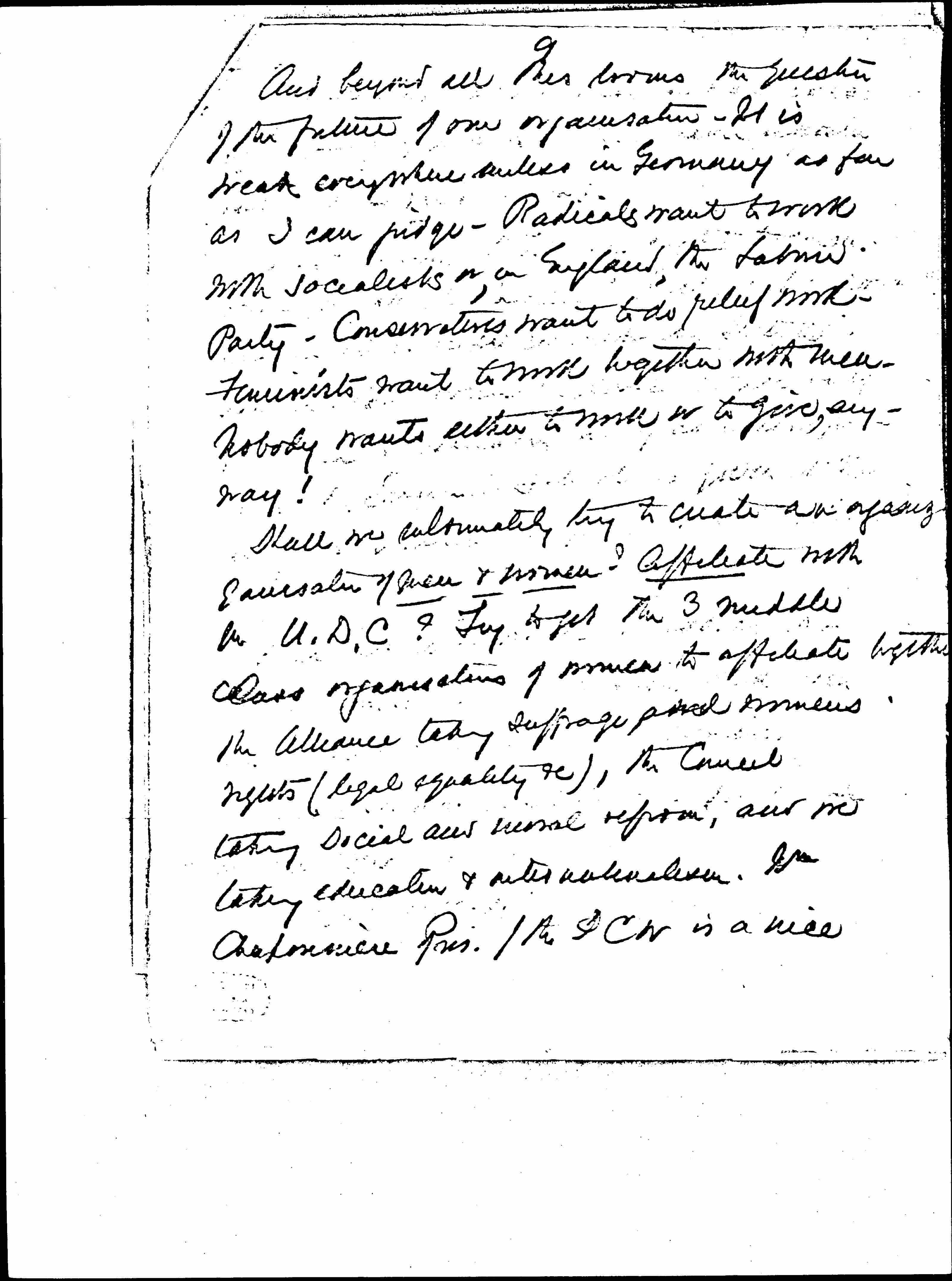 Shall we ultimately try to create an [organization] of men & women? Affiliate with the U.D.C.? Try to get the 3 middle class [organizations] of women to affiliate together, the Alliance taking suffrage and womens rights (legal equality [etc.]), the Council taking social and moral reform, and we taking education & internationalism. Mm Chaponnière Pres. of the ICW is a nice [page 11] old lady who hasn't had a new idea for many years and may never again -- have one -- very limited.