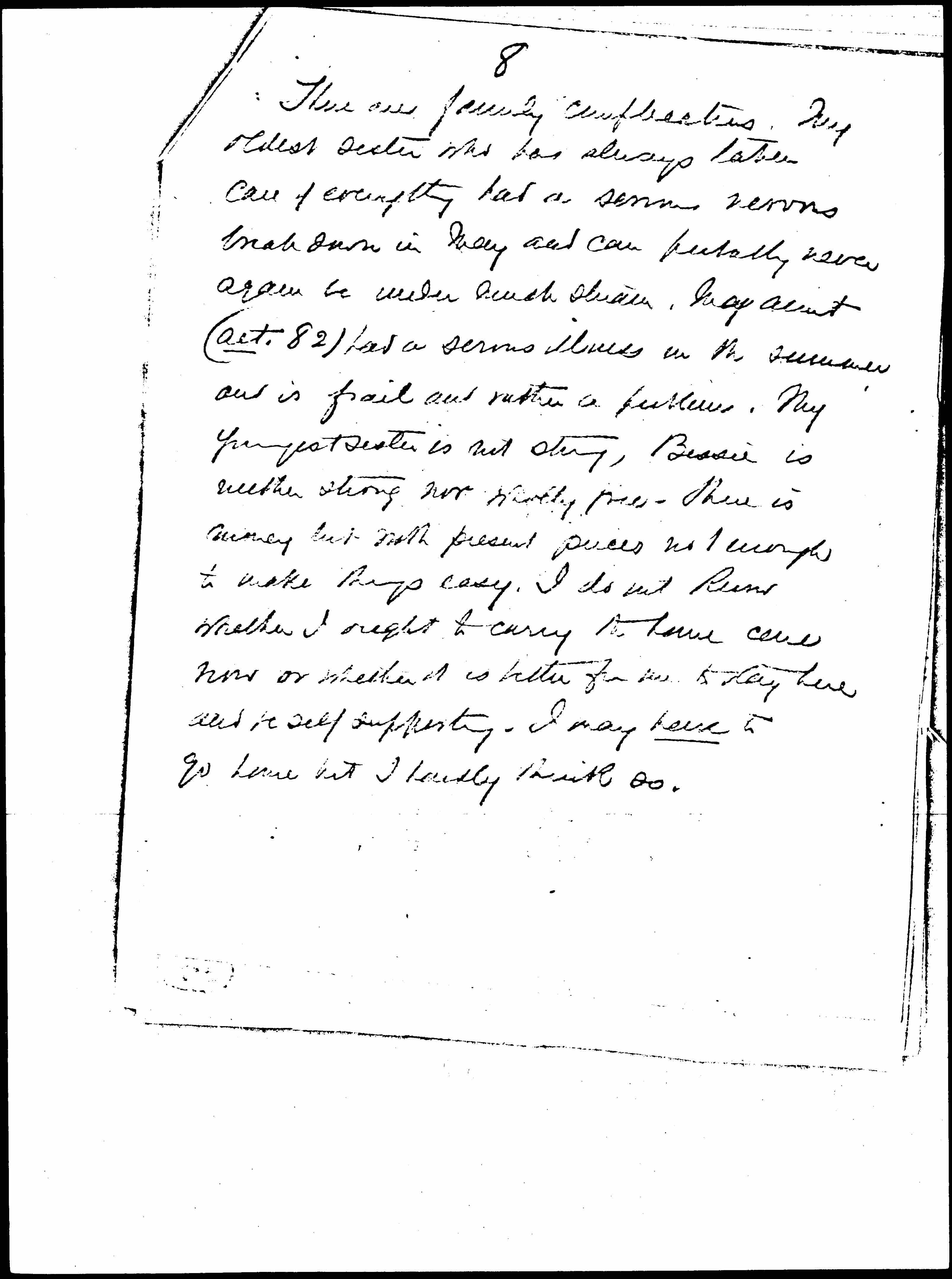 There are family complications. My oldest sister who has always taken care of everything had a serious nervous breakdown in May and can probably never again be under much strain. My aunt ([abt.?] 82) had a serious illness in the summer and is frail and rather a problem. My youngest sister is not strong, Bessie is neither strong nor [mostly free?]. There is money but with present prices not enough to make things easy. I do not know whether I ought to carry the home care now or whether it is better for me to stay here and be self supporting. I may have to go home but I hardly think so. [page 10]