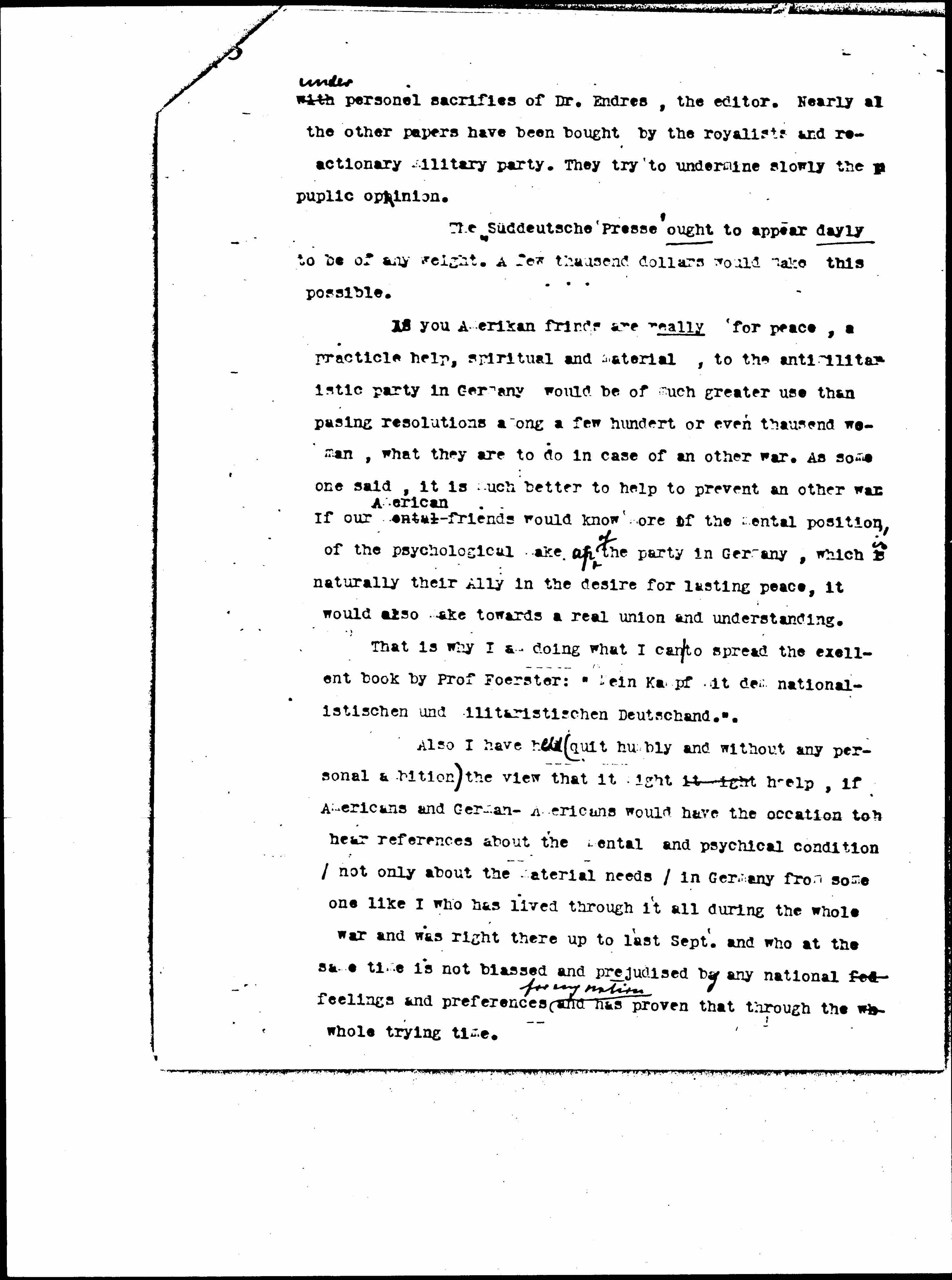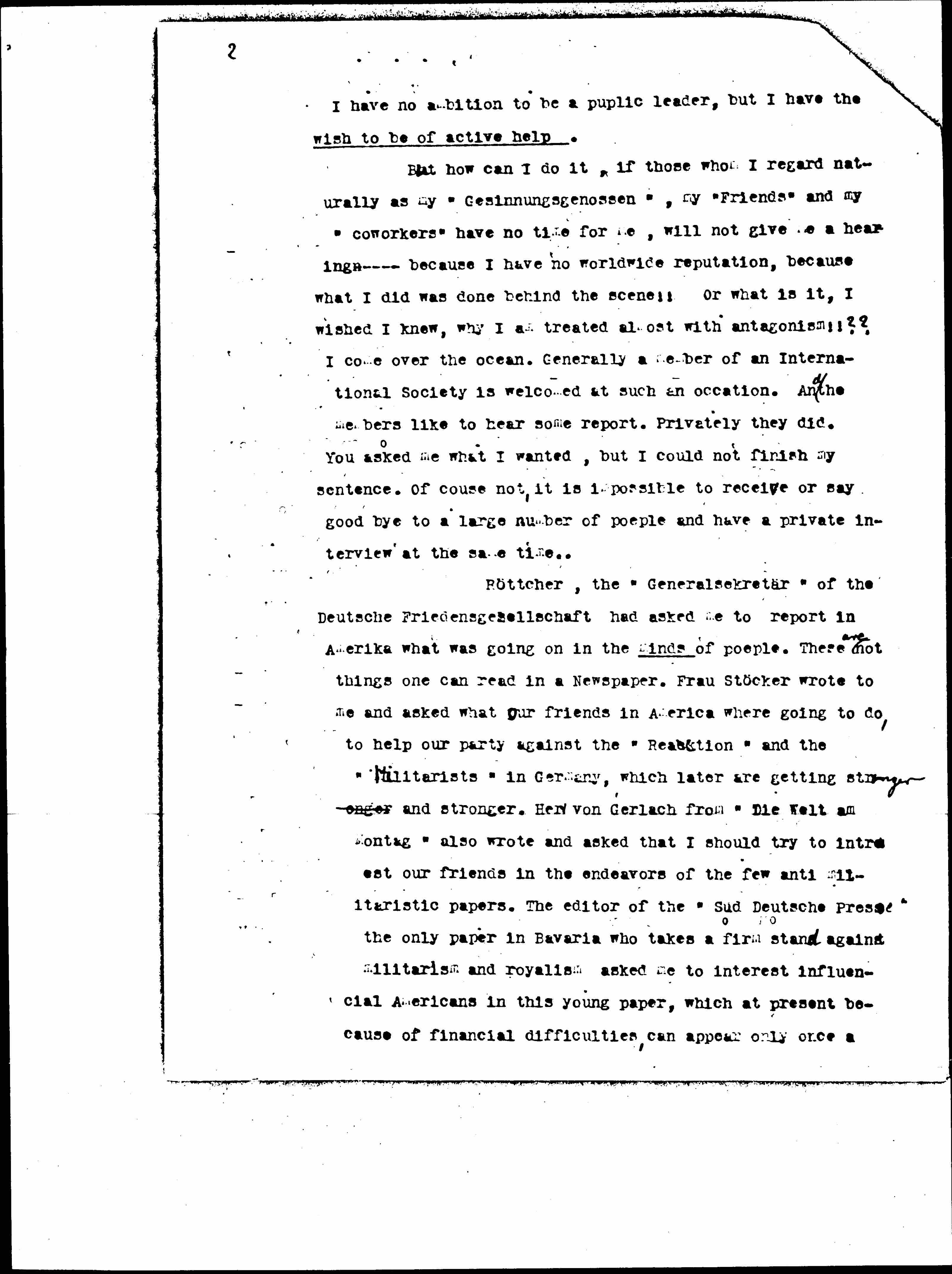 Röttcher, the "Generalsekretär" of the Deutsche Friedensgesellschaft had asked me to report in [America] what was going on in the minds of people. These ↑are↓ not things one can read in a Newspaper. Frau Stöcker wrote to me and asked what our friends in America [were] going to do, to help our party against the "[Reaction?]" and the "Militarists" in Germany, which later are getting stronger and stronger. Herr von Gerlach from "Die Welt am Montag" also wrote and asked that I should try to interest our friends in the endeavors of the few [antimilitaristic] papers. The editor of the "[Süddeutsche] Presse" the only paper in Bavaria who takes a firm stand against militarism and royalism asked me to interest influential Americans in this young paper, which at present because of financial difficulties, can appear only once [a?] [page 3] with ↑under↓ personal [sacrifices] of Dr. Endres, the editor. Nearly [all] the other papers have been bought by the royalists and reactionary military party. They try to undermine slowly the public opinion.