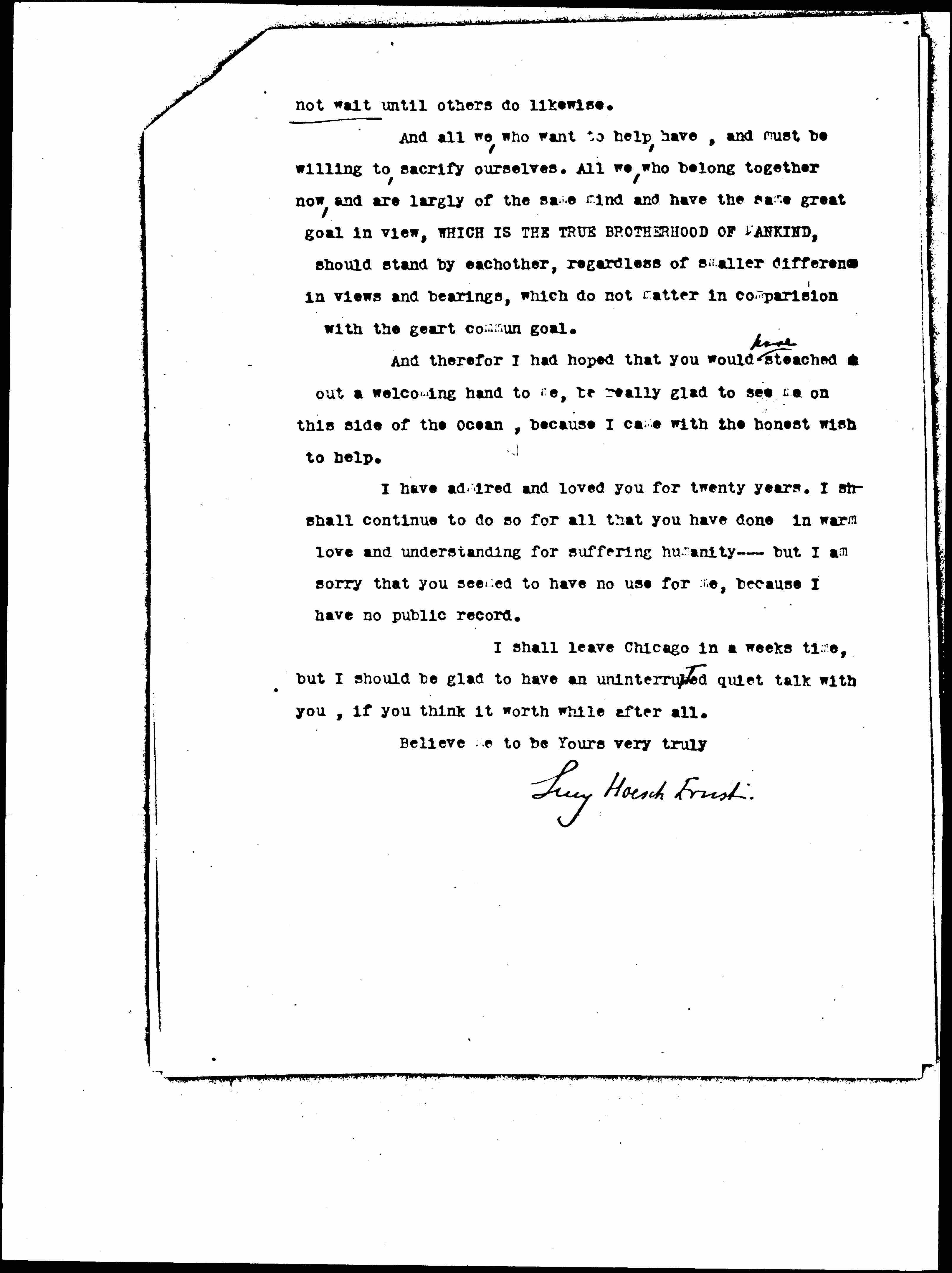 I shall leave Chicago in a weeks time, but I should be glad to have an [uninterrupted] quiet talk with you, if you think it worth while after all.