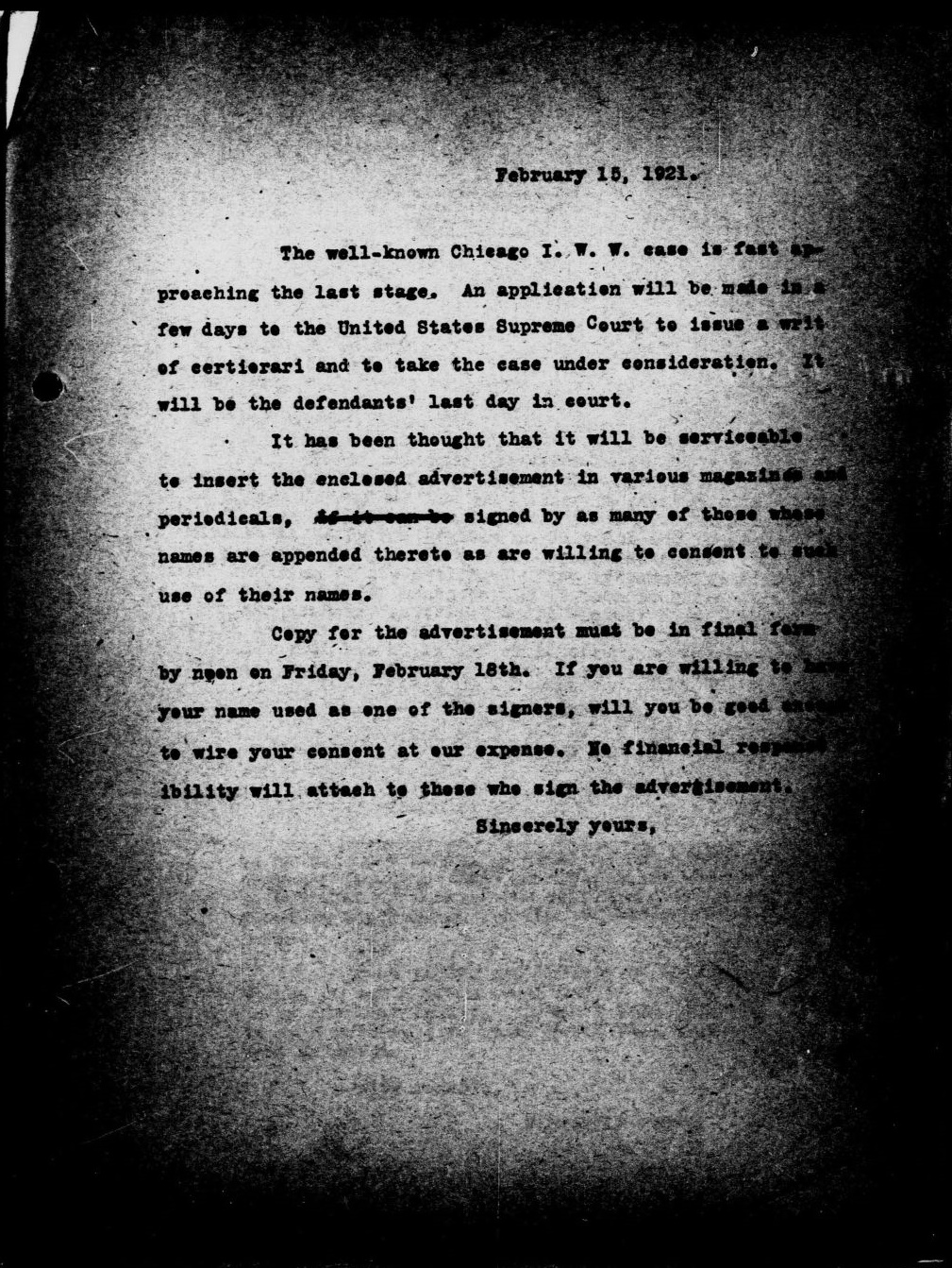 Copy for the advertisement must be in final form by noon on Friday, February 18th. If you are willing to have your name used as one of the signers, will you be good [enough] to wire your consent at our expense. No financial responsibility will attach to those who sign the advertisement.