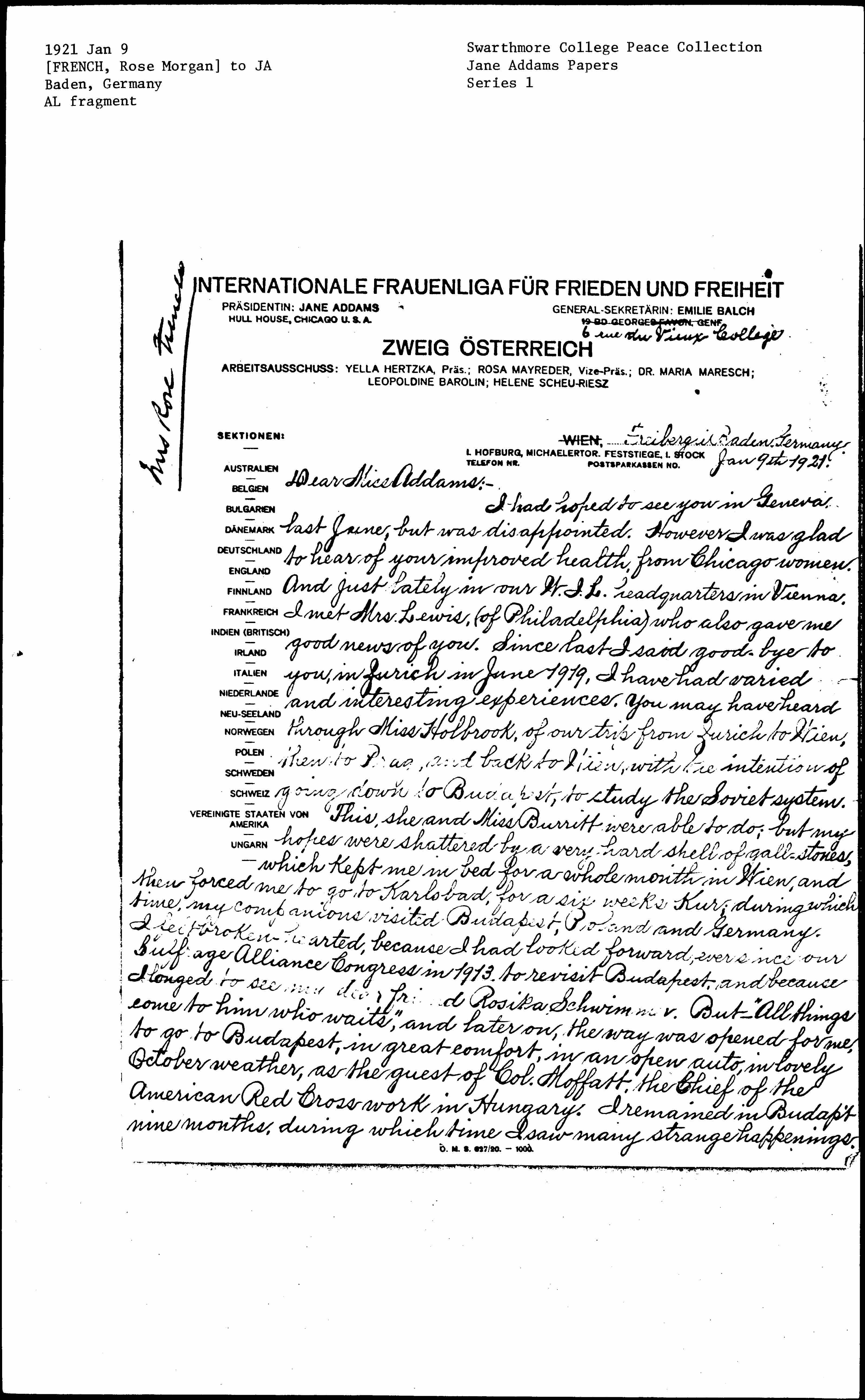 I had hoped to see you in Geneva last June, but was disappointed. However I was glad to hear of your improved health, from Chicago women. And just lately in our W.I.L. headquarters in Vienna. I met Mrs. Lewis, (of Philadelphia) who also gave me good news of you. Since last I said good-bye to you, in Zurich in June 1919, I have had varied and interesting experiences. You may have heard through Miss Holbrook, of our trip from Zurich to Wien, then to [Prague], and back to Wien, with the intention of going down to Budapest, to study the Soviet system. This, she and Miss Burritt were able to do, but my hopes were shattered by a very hard shell of gall-stones, which kept me in bed for a whole month in Wien, and then forced me to go to Karlsbad, for a six weeks Kur; during which time, my companions visited Budapest, Poland, and Germany. I felt broken-hearted, because I had looked forward, ever since our Suffrage Alliance Congress in 1913, to revisit Budapest, and because I longed to see my dear friend Rosika Schwimmer. But -- "All things come to him who waits," and later on, the way was opened for me, to go to Budapest, in great comfort, in an open auto, in lovely October weather, as the guest of Col. [Moffat], the Chief of the American Red Cross work in Hungary. I remained in Budapest nine months, during which time I saw many strange happenings. [page 2]