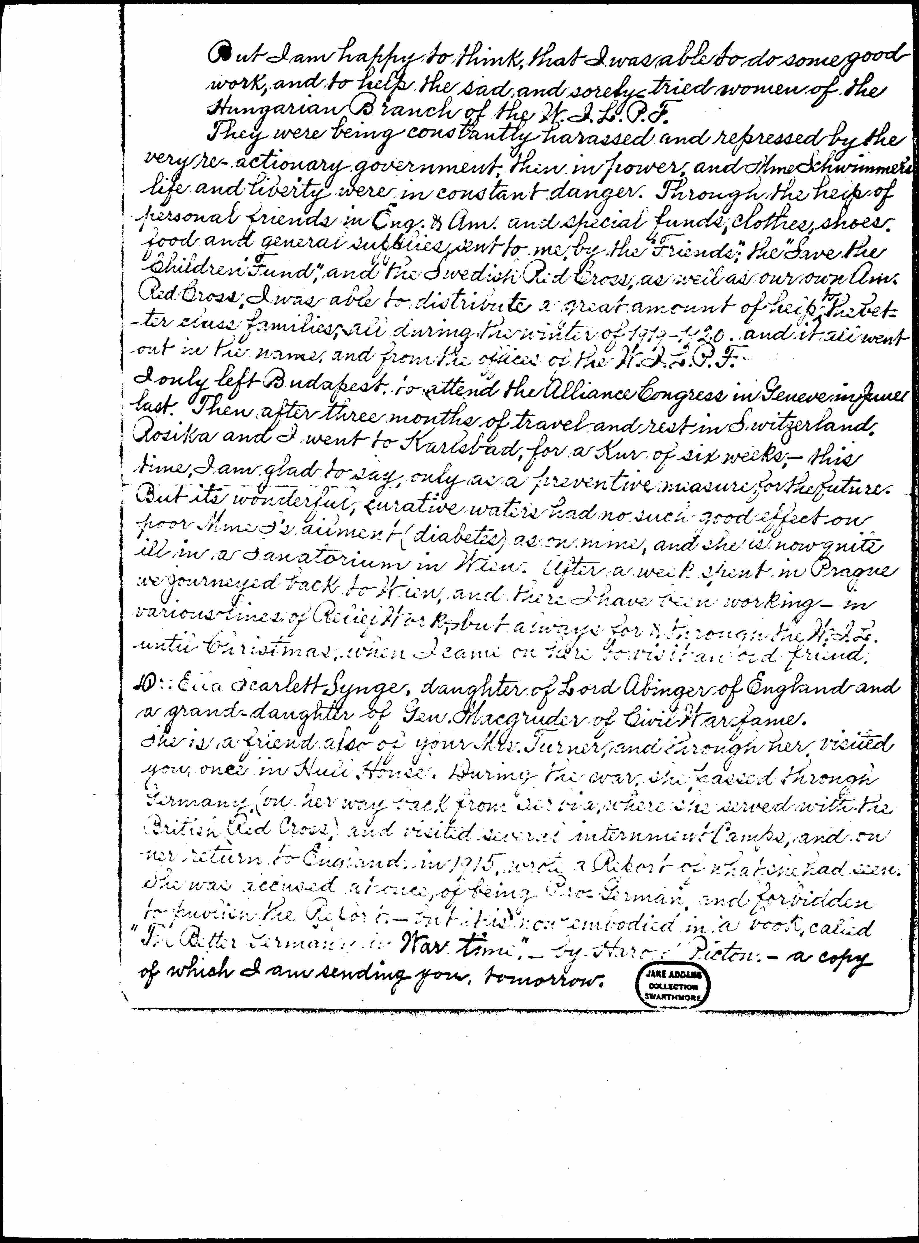 I only left Budapest to attend the Alliance Congress in Geneva in June last. Then after three months of travel and rest in Switzerland, Rosika and I went to Karlsbad, for a Kur of six weeks, -- this time, I am glad to say, only as a preventive measure for the future. But its wonderful, curative waters had no such good effect on poor Mme S's ailment (diabetes) as on mine, and she is now quite ill in a sanatorium in Wien. After a week spent in Prague we journeyed back to Wien, and there I have been working -- in various lines of Relief Work, but always for or through the W.I.L. until Christmas, when I came on here to visit an old friend. Dr. Ella Scarlett Synge, daughter of Lord Abinger of England and a [granddaughter] of Gen. [Magruder] of Civil War fame. She is a friend also of your Mrs. Turner and through her visited you once in Hull House. During the war, she passed through Germany (on her way back from [Serbia], where she served with the British Red Cross) and visited several internment Camps, and on her return to England in 1915 wrote a Report of what she had seen. She was accused at once, of being Pro-German, and forbidden to publish the Report -- but it is now embodied in a book called "The Better Germany in War Time," -- by Harold Picton -- a copy of which I am sending you, tomorrow. [page(s) missing]
