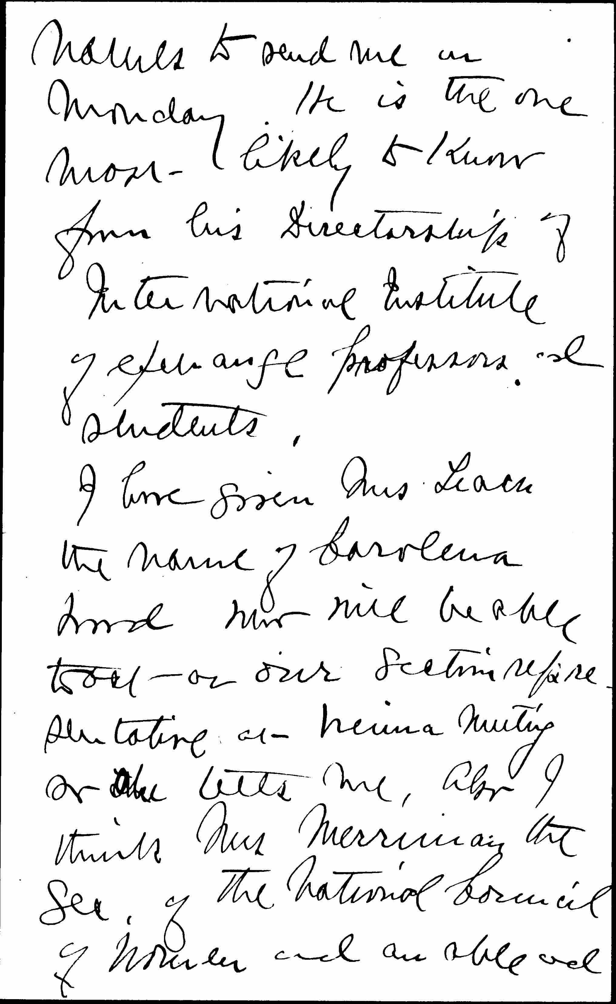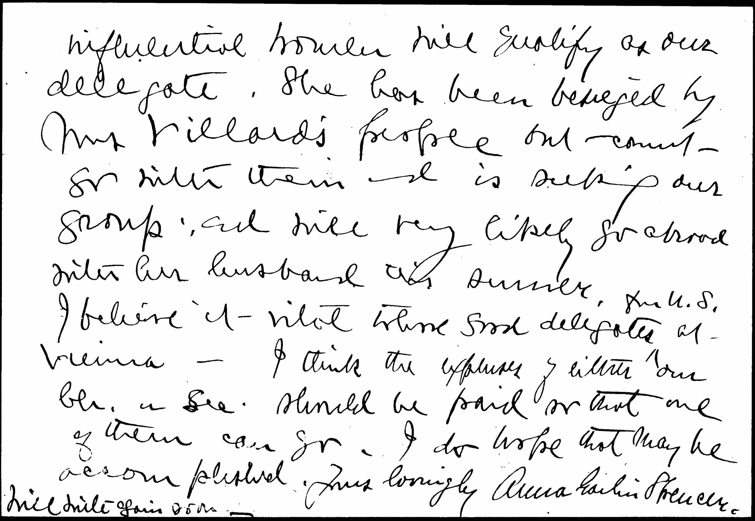 I have given Mrs Leach the name of Carolena Wood who will be able to act as our section representative at Vienna Meeting so she tells me. Also I think Mrs Merriman the Sec. of the National Council of Women and an able and [page 3] influential woman will quality as our delegate. She has been besieged by Mrs Villard's people but cannot go with them and is seeking our group; and will very likely go abroad with her husband this summer. I believe it vital to have good delegates ↑from U.S.↓ at Vienna -- I think the expenses of either our Ch. or Sec. should be paid or that one of them can go. I do hope that may be accomplished.