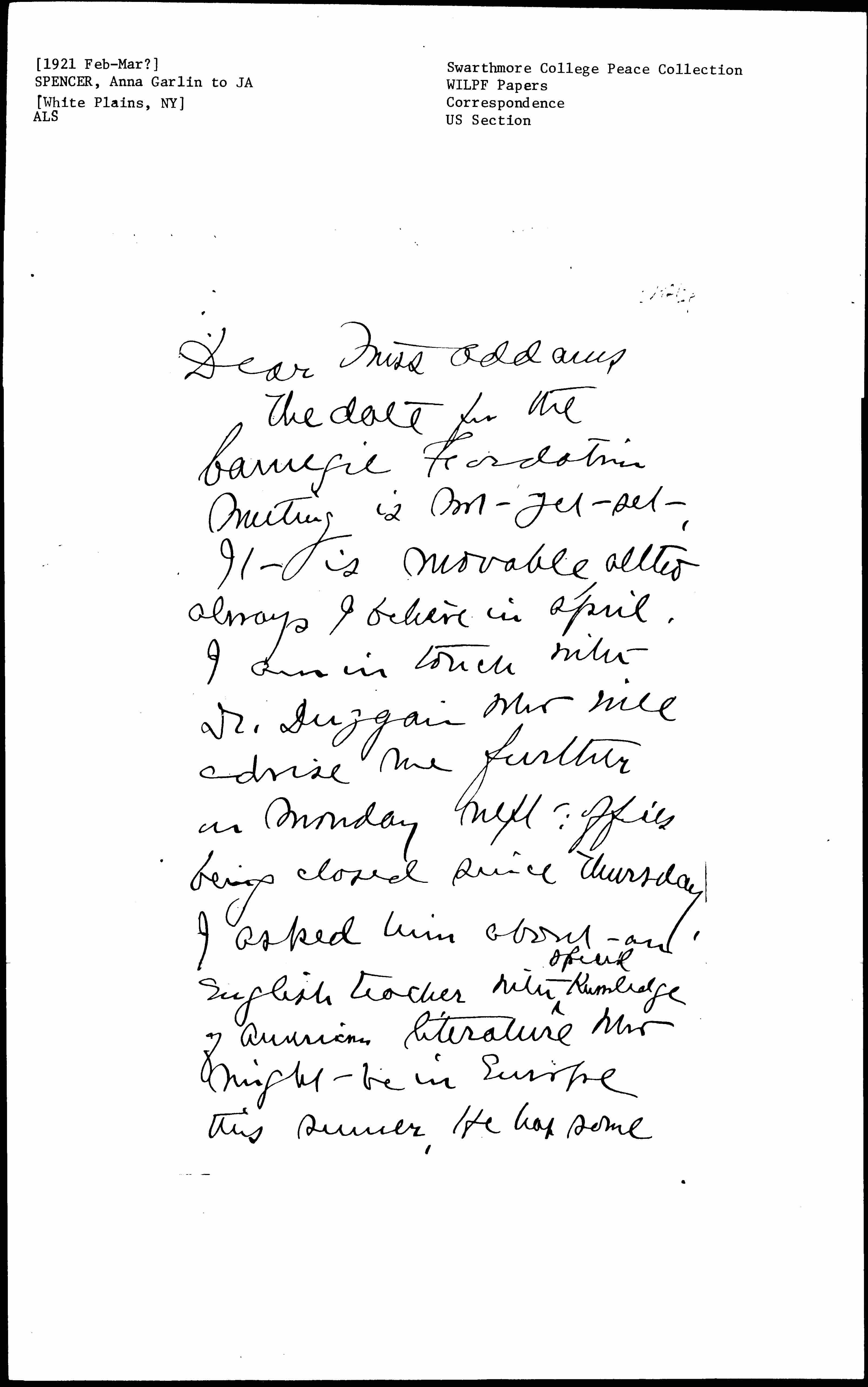 The date for the Carnegie Foundation meeting is not yet set. It is moveable, [although] always I believe in April. I am in touch with Dr. Duggan who will advise me further on Monday next; offices being closed since Thursday. I asked him about an English teacher with ↑special↓ knowledge of American literature who might be in Europe this summer. He has some [page 2] names to send me on Monday. He is the one most likely to know from his Directorship of International Institute of exchange professors and students.