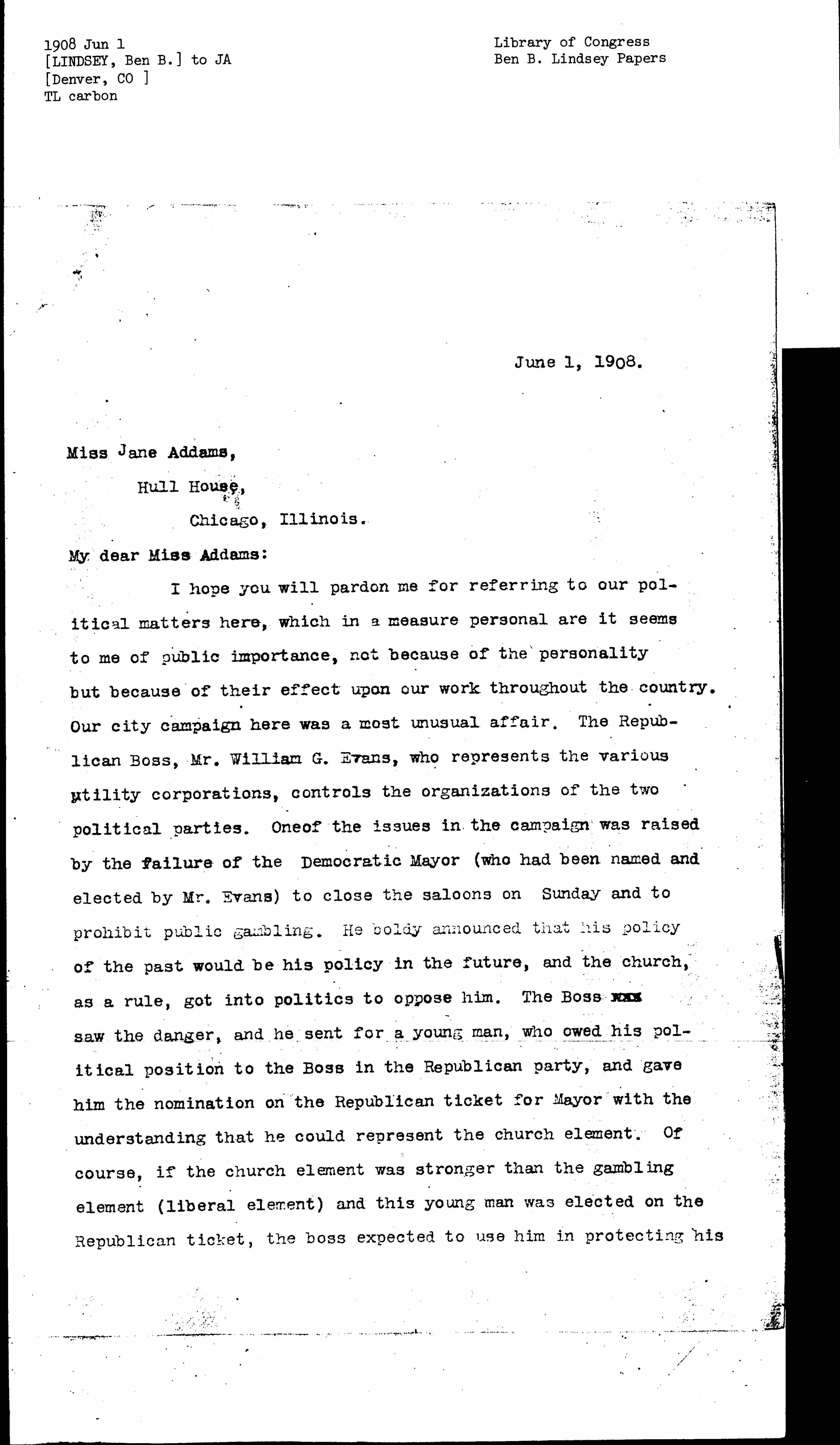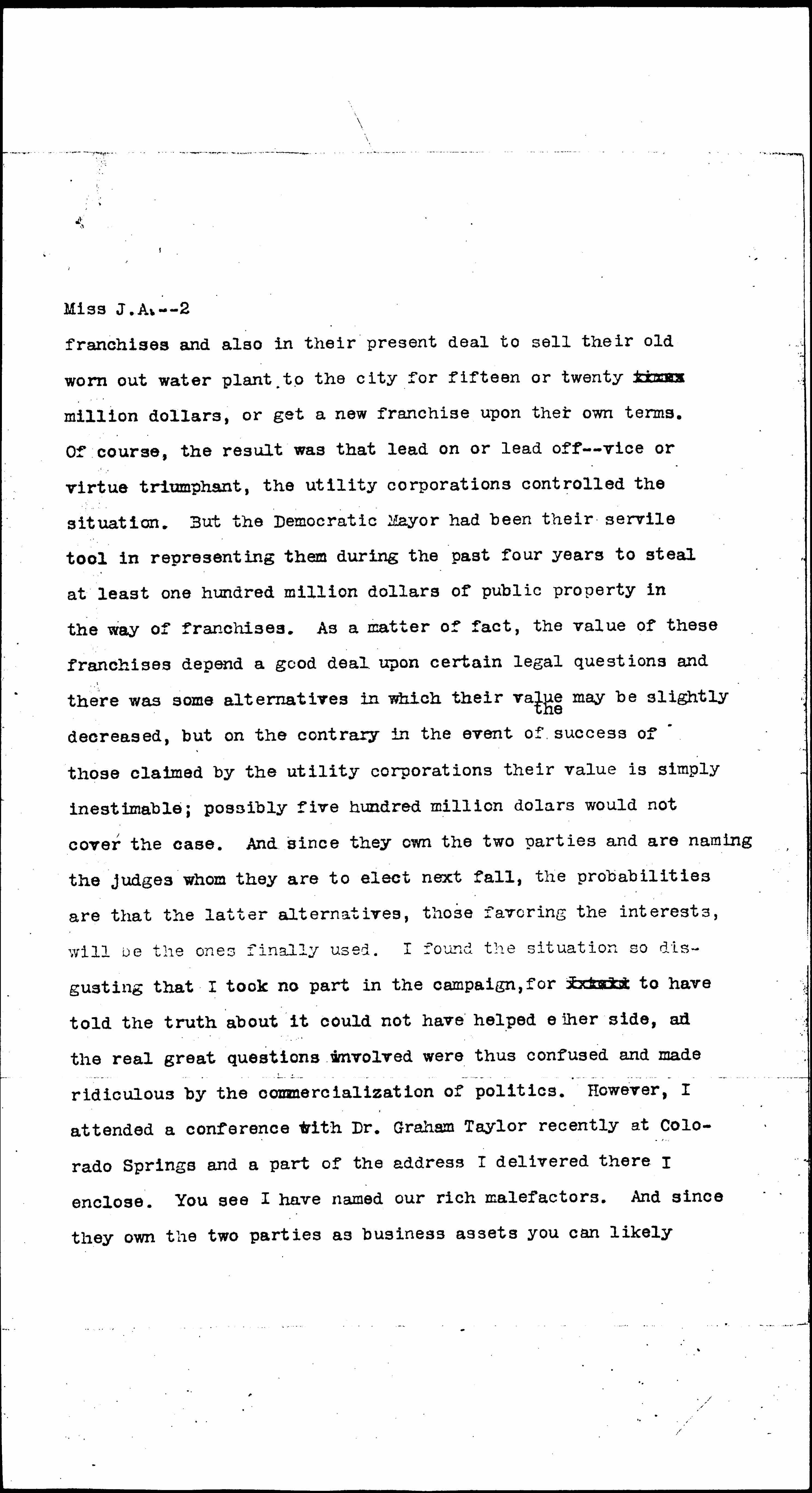 I hope you will pardon me for referring to our political matters here, which in a measure personal are it seems to me of public importance, not because of the personality but because of their effect upon our work throughout the country. Our city campaign here was a most unusual affair. The Republican Boss, Mr. William G. Evans, who represents the various utility corporations, controls the organizations of the two political parties. One of the issues in the campaign was raised by the failure of the Democratic Mayor (who had been named and elected by Mr. Evans) to close the saloons on Sunday and to prohibit public gambling. He boldly announced that his policy of the past would be his policy in the future, and the church, as a rule, got into politics to oppose him. The Boss saw the danger, and he sent for a young man, who owed his political position to the Boss in the Republican party, and gave him the nomination on the Republican ticket for Mayor with the understanding that he could represent the church element. Of course, if the church element was stronger than the gambling element (liberal element) and this young man was elected on the Republican ticket, the boss expected to use him in protecting his [page 2] franchises and also in their present deal to sell their old worn out water plant to the city for fifteen or twenty million dollars, or get a new franchise upon their own terms. Of course, the result was that lead on or lead off -- vice or virtue triumphant, the utility corporations controlled the situation. But the Democratic Mayor had been their servile tool in representing them during the past four years to steal at least one hundred million dollars of public property in the way of franchises. As a matter of fact, the value of these franchises depend a good deal upon certain legal questions and there was some alternatives in which their value may be slightly decreased, but on the contrary in the event of success of those claimed by the utility corporations their value is simply inestimable; possibly five hundred million dollars would not cover the case. And since they own the two parties and are naming the judges whom they are to elect next fall, the probabilities are that the latter alternatives, those favoring the interests, will be the ones finally used. I found the situation so disgusting that I took no part in the campaign, for to have told the truth about it could not have helped either side, and the real great questions involved were thus confused and made ridiculous by the commercialization of politics. However, I attended a conference with Dr. Graham Taylor recently at Colorado Springs and a part of the address I delivered there I enclose. You see I have named our rich malefactors. And since they own the two parties as business assets you can likely [page 3] tell what is going to happen to the present Judge of the Juvenile Court.