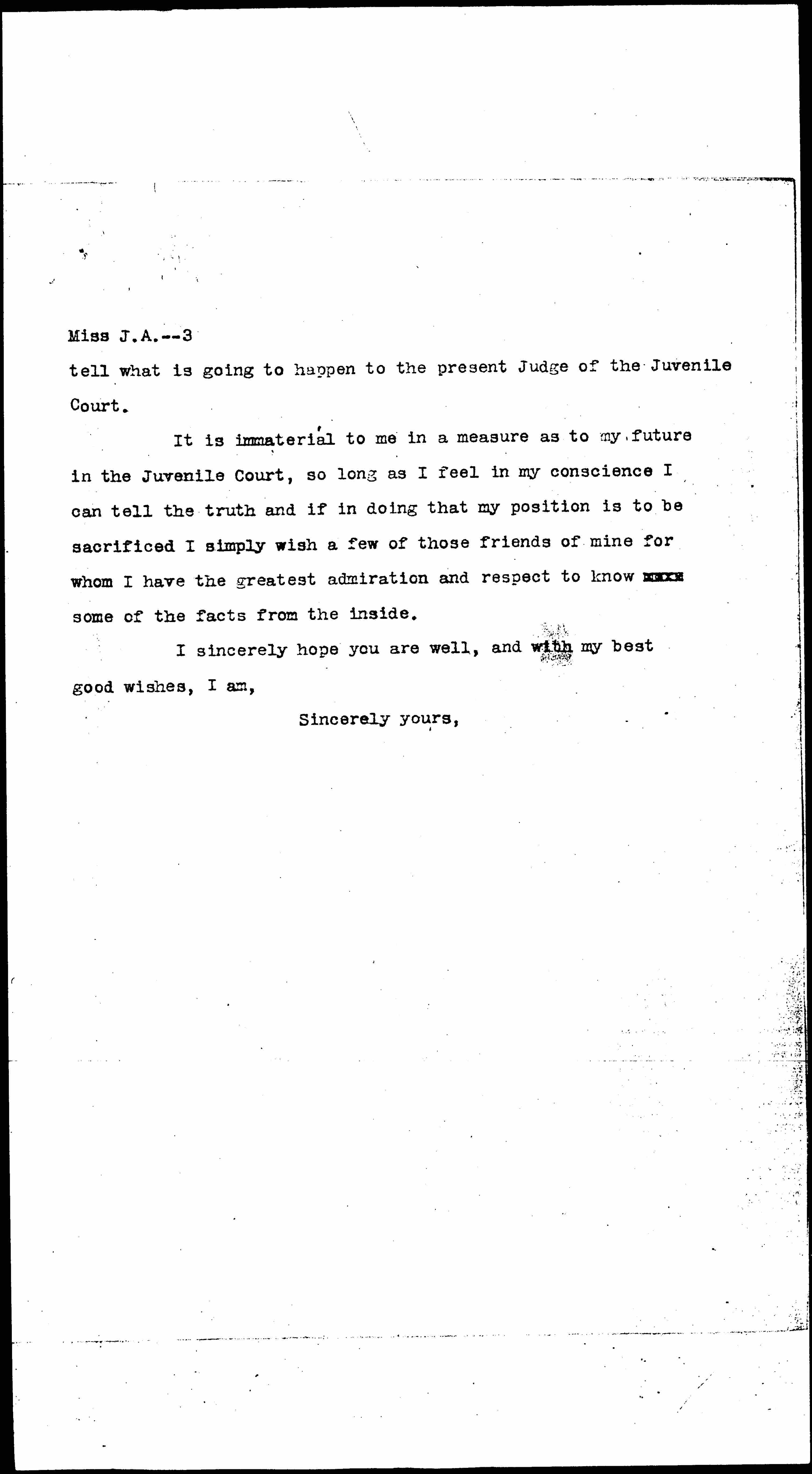 It is immaterial to me in a measure as to my future in the Juvenile Court, so long as I feel in my conscience I can tell the truth and if in doing that my position is to be sacrificed I simply wish a few of those friends of mine for whom I have the greatest admiration and respect to know some of the facts from the inside.