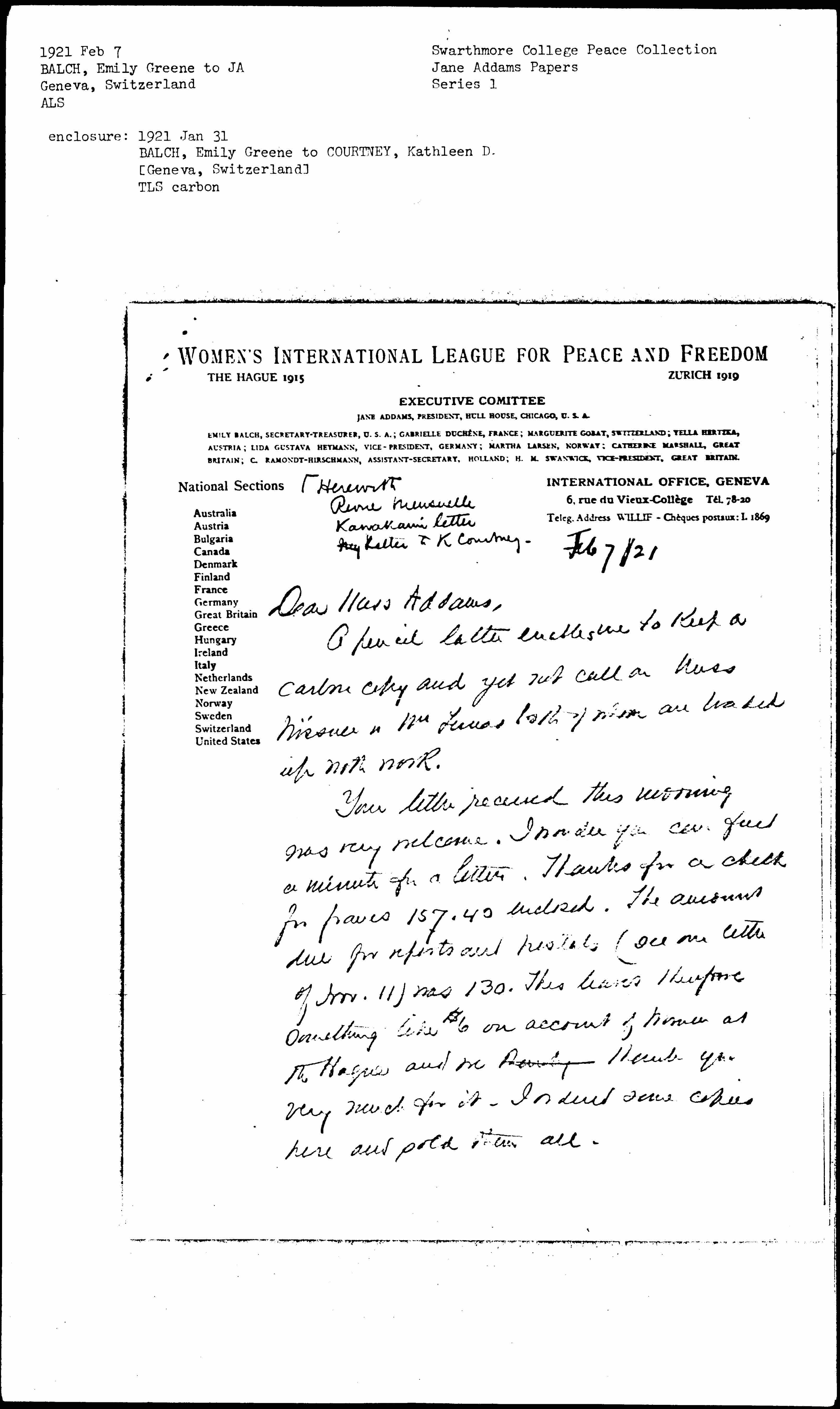 Your letter received this morning was very welcome. I wonder you can find a minute for a letter. Thanks for a check for francs 157.40 [enclosed]. The amount due for reports and postals (see our letter of Nov. 11) was 130. This leaves therefore something like $6 on account of Women at The Hague and we [illegible] thank you very much for it. I ordered some copies here and sold them all. [page 2]