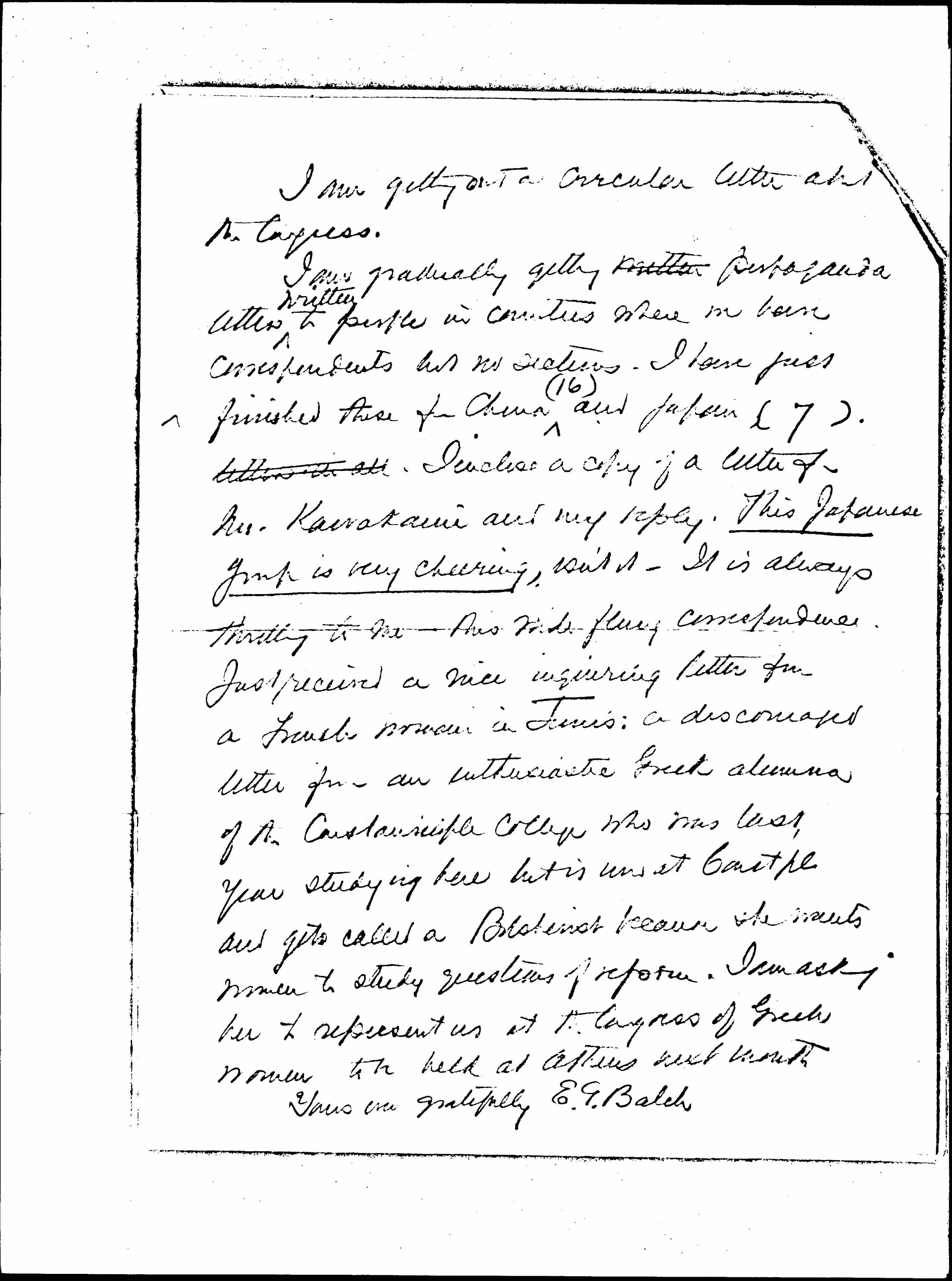 I am gradually getting written propaganda letters ↑written↓ to people in countries where we have correspondents but no sections. I have just finished these for China ↑(16)↓ and Japan (7). letters in all. I enclose a copy of a letter from Mr. Kawakami and my reply. This Japanese group is very cheering, isn't it -- It is always thrilling to me -- this wide flung correspondence. Just received a nice inquiring letter from a French woman in Tunis: a discouraged letter from an enthusiastic Greek alumna of the Constantinople College who was last year studying here but is now at Constpl and gets called a Bolshevist because she wants women to study questions of reform. I am asking her to represent us at the Congress of Greek Women to be held in Athens next month.