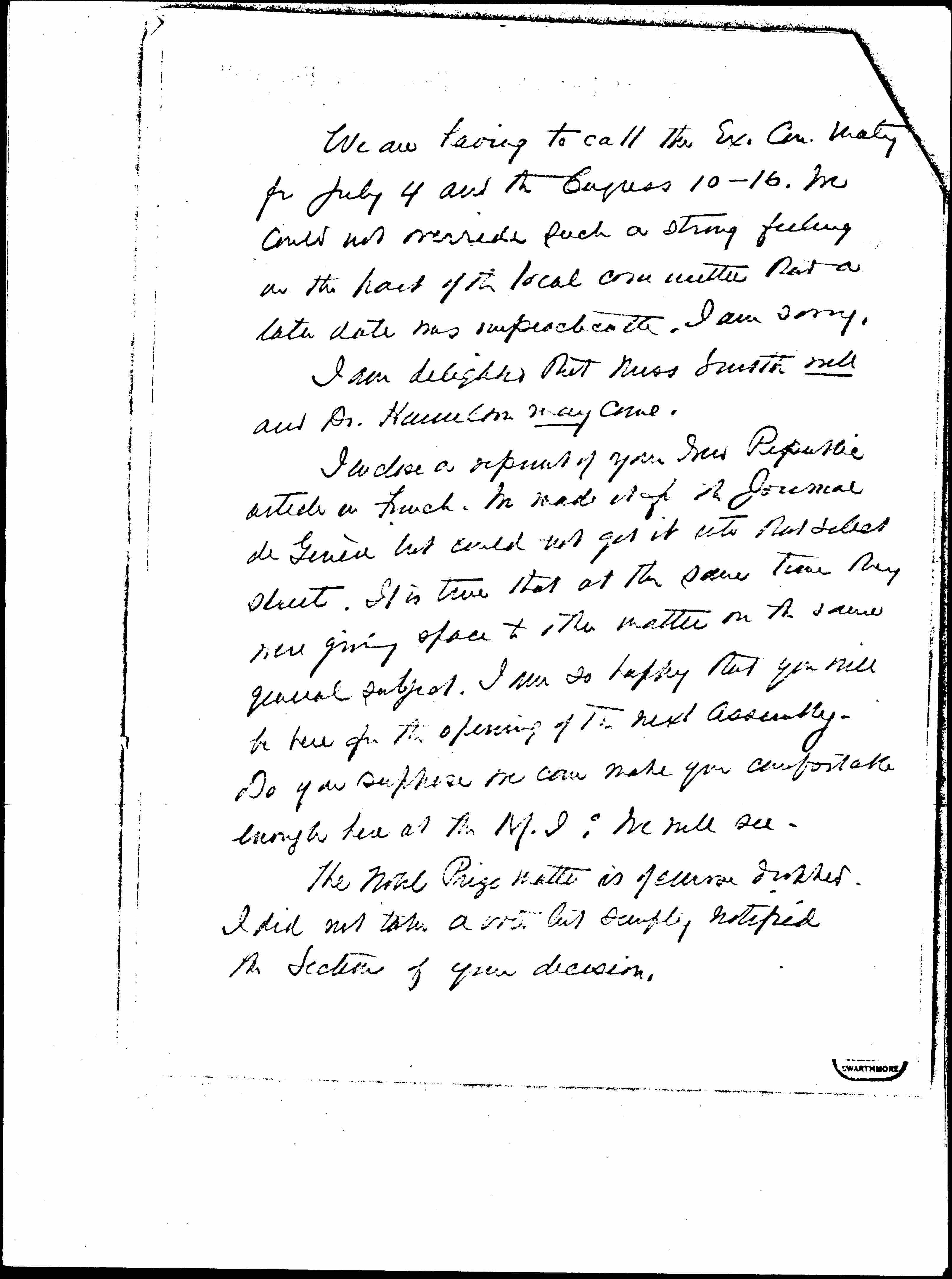 We are having to call the Ex. Com. [meeting] for July 4 and the Congress 10-16. We could not override such a strong feeling on the part of the local committee that a later date was impractical. I am sorry.
